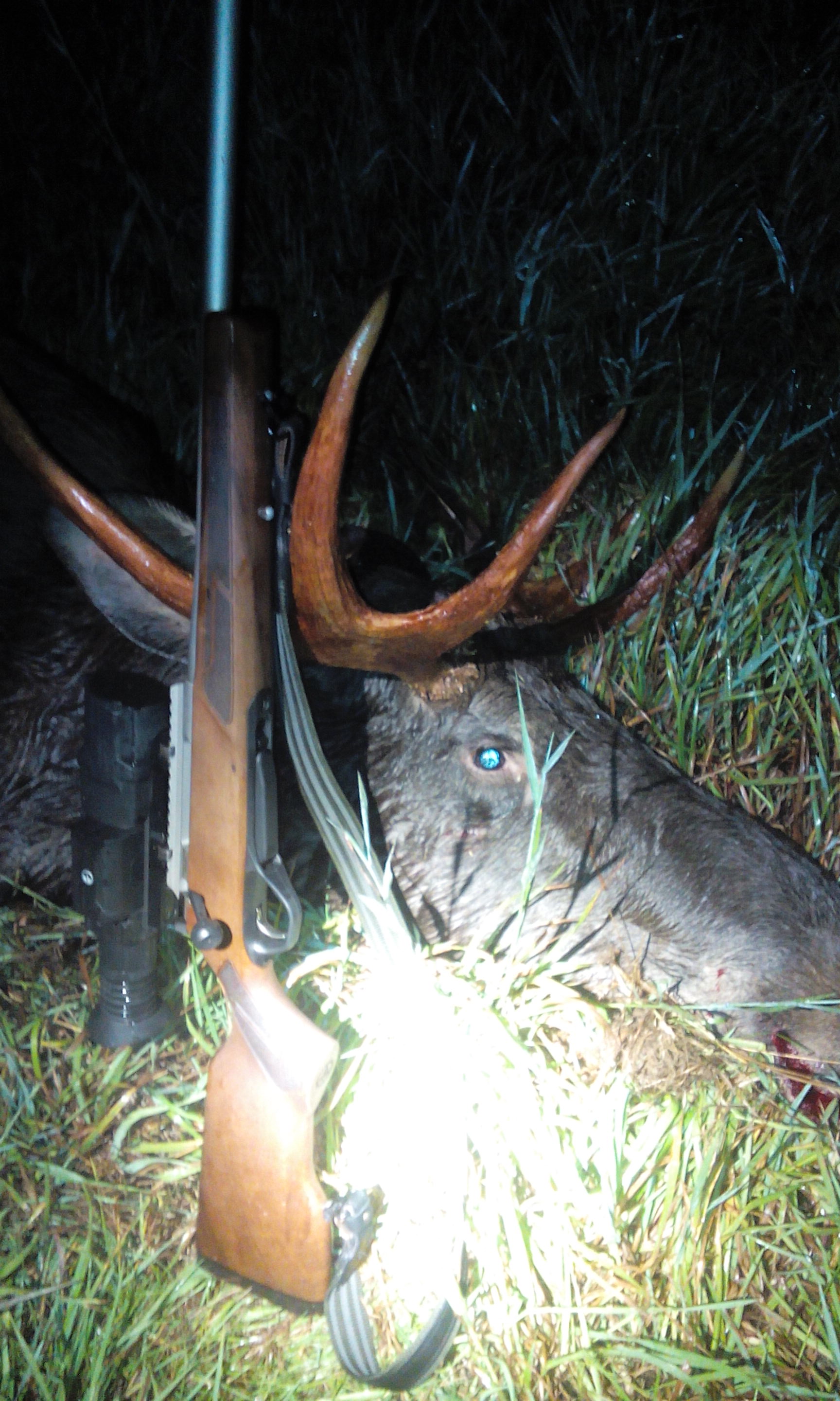 Охотясь в конце июля - августе на самца косули, каждый раз поутряне в одном и том же месте(круг диаметром метров 200) я встречал трофейного (3х3 отростка) лося. Хороший был бычок, обходил его всегда стороной, дабы не пугать и не сгонять с излюбленного им места, в конце августа, думаю, буду его охотить. Попросил егеря приберечь этого быка для меня - сам закрою в первые же выходные после 20-го августа этого постояльца - договорились. Суббота, 25-го, я с полным магазином полу-оболочки еще затемно мчу на знакомое место. Все глаза проглядел - нету быка, даже следов и экскрементов. Не пришел он и в воскресенье. Безуспешными оказались попытки и на выходных через неделю. Я к егерю: -Добыли моего бычка, признавайтесь? - Нет, говорит, - один ты только в том месте охотишь. Порассуждали с ним: подумали может браки подрезали, была версия также, что самки в азарте гона увели его, и о календаре охотника пошутили, который зверье лучше нас знает походу :-) . В общем меня не отпускала всё мысль разыскать лосика, а его все не было и не было. Даже манок не спасал. И что вы думаете, лишь спустя 4 недели лось мой соизволил появиться. Добыл я этого быка на прошедших выходных, в пол-второго ночи вышел все-таки он в последний раз на свое излюбленное место(круг диаметром метров 200).