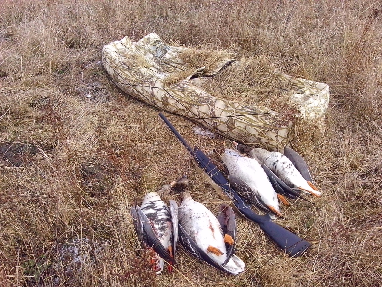 В общем, длилось все это около получаса, но на верный выстрел никто так и не подставился, посадить никого не удалось, только одна пара села на воду у меня за спиной (зря в ту сторону тоже бойницу не прорезал, будет урок на будущее), улетели как только я попытался вылезть. Но как только солнце спряталось за надвигающуюся облачность - лет резко(!) прекратился. Вернувшись же к машине заметил в небе клин гусей голов на 20, летели на очень большой высоте почему-то на юго-восток