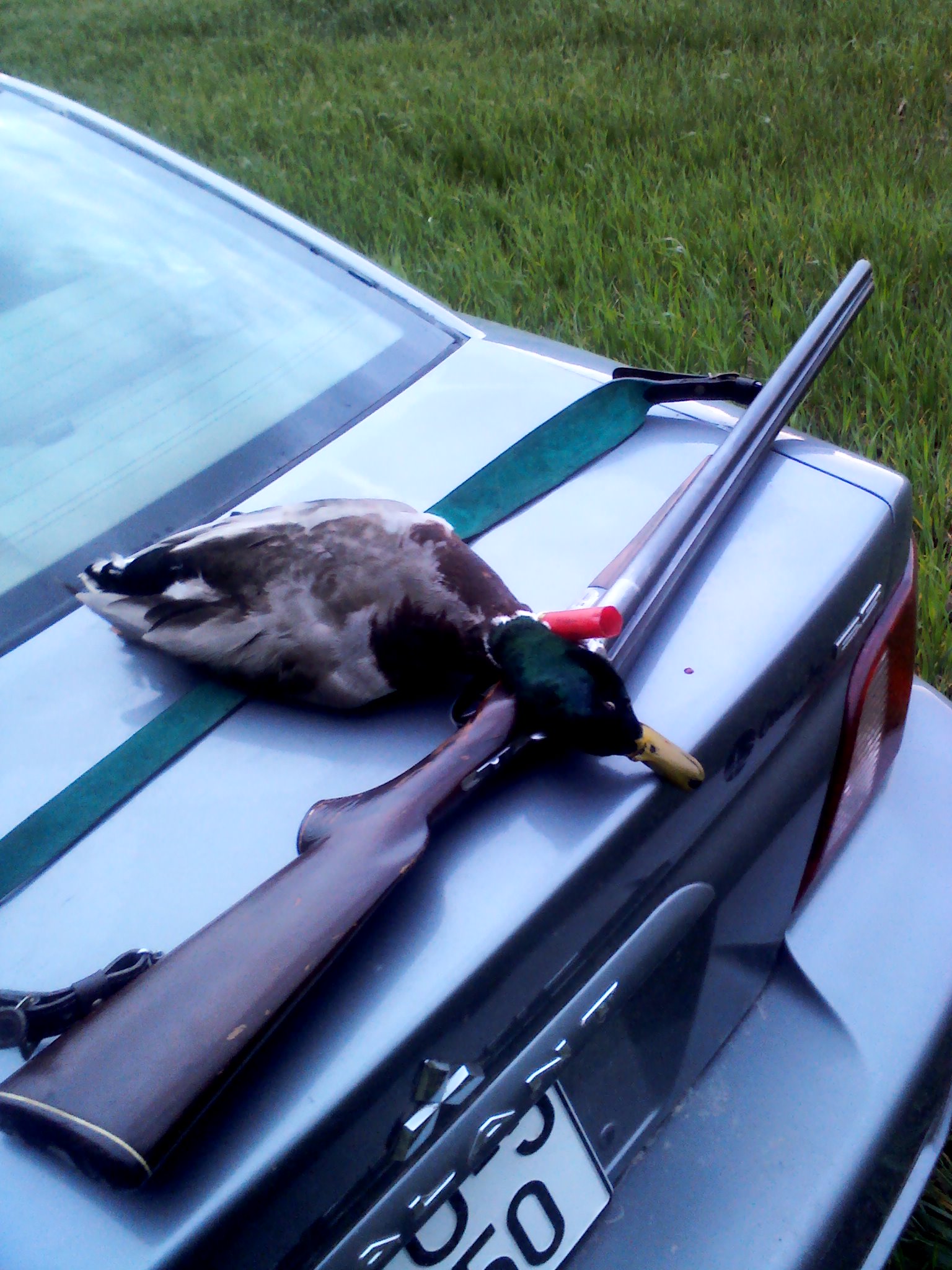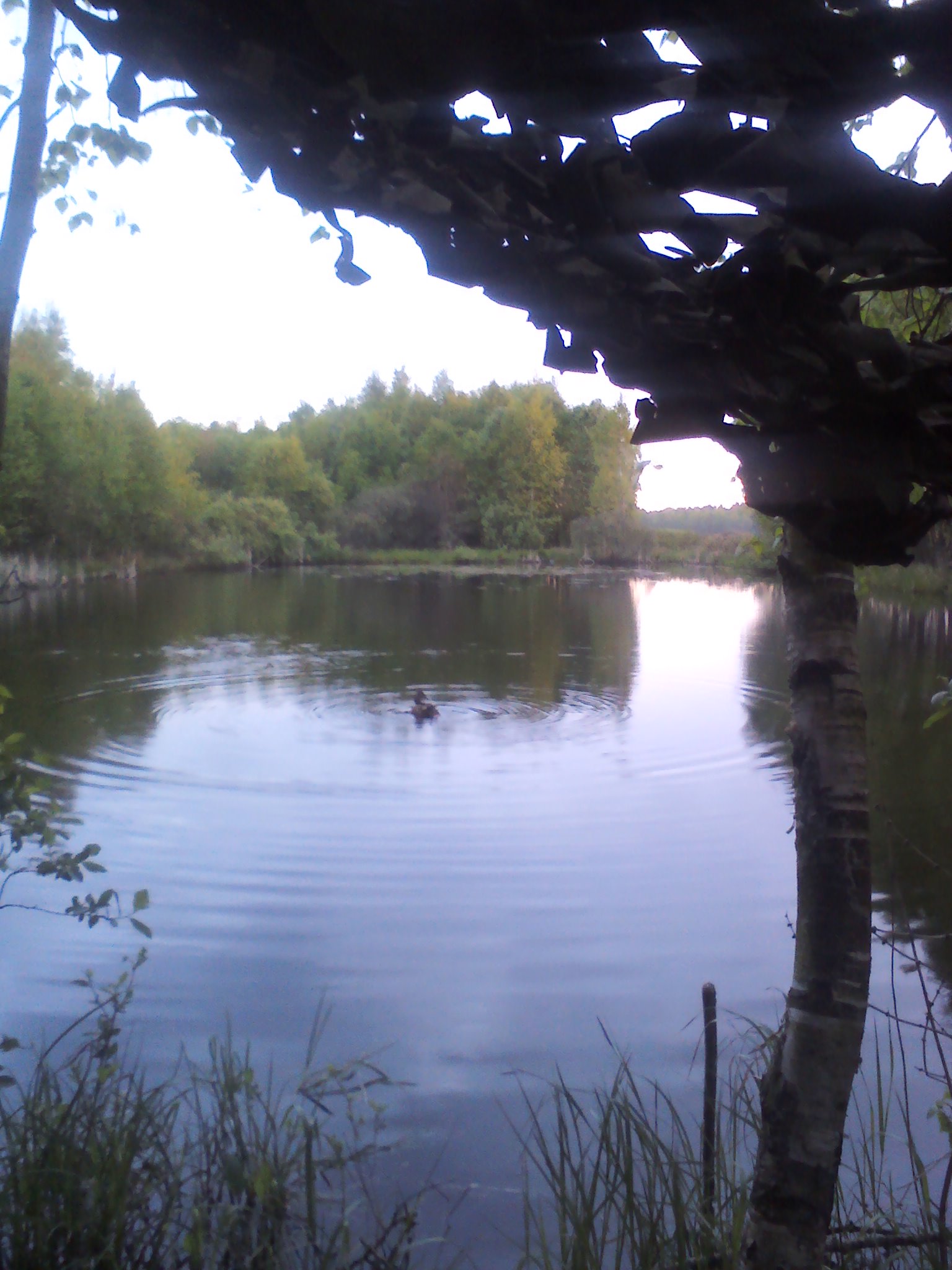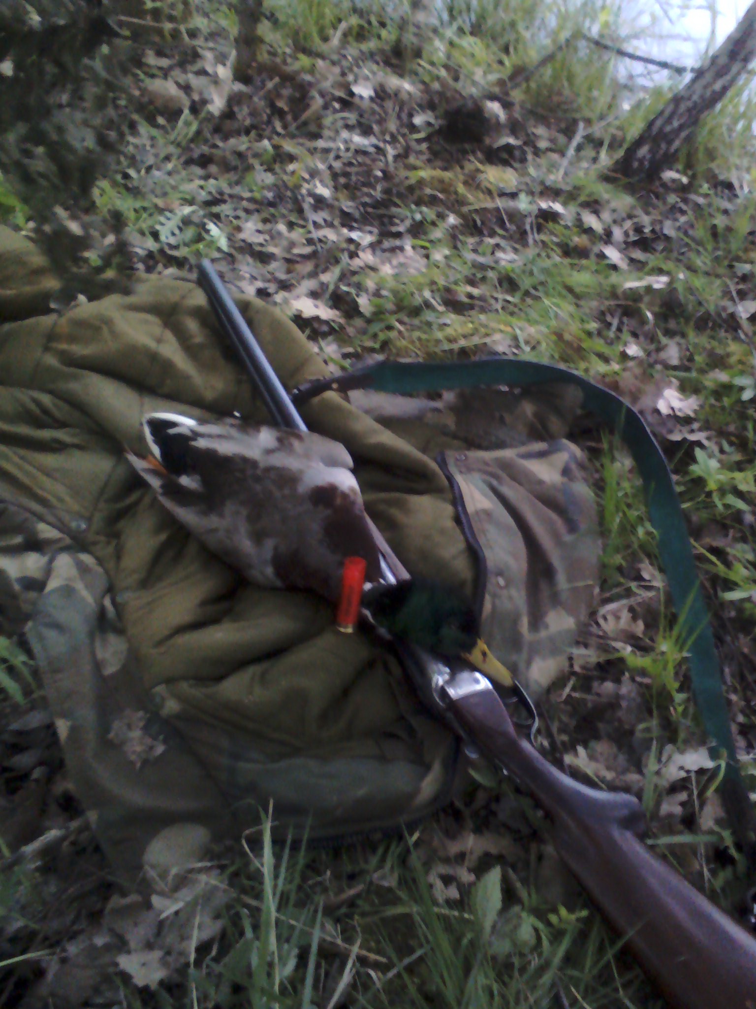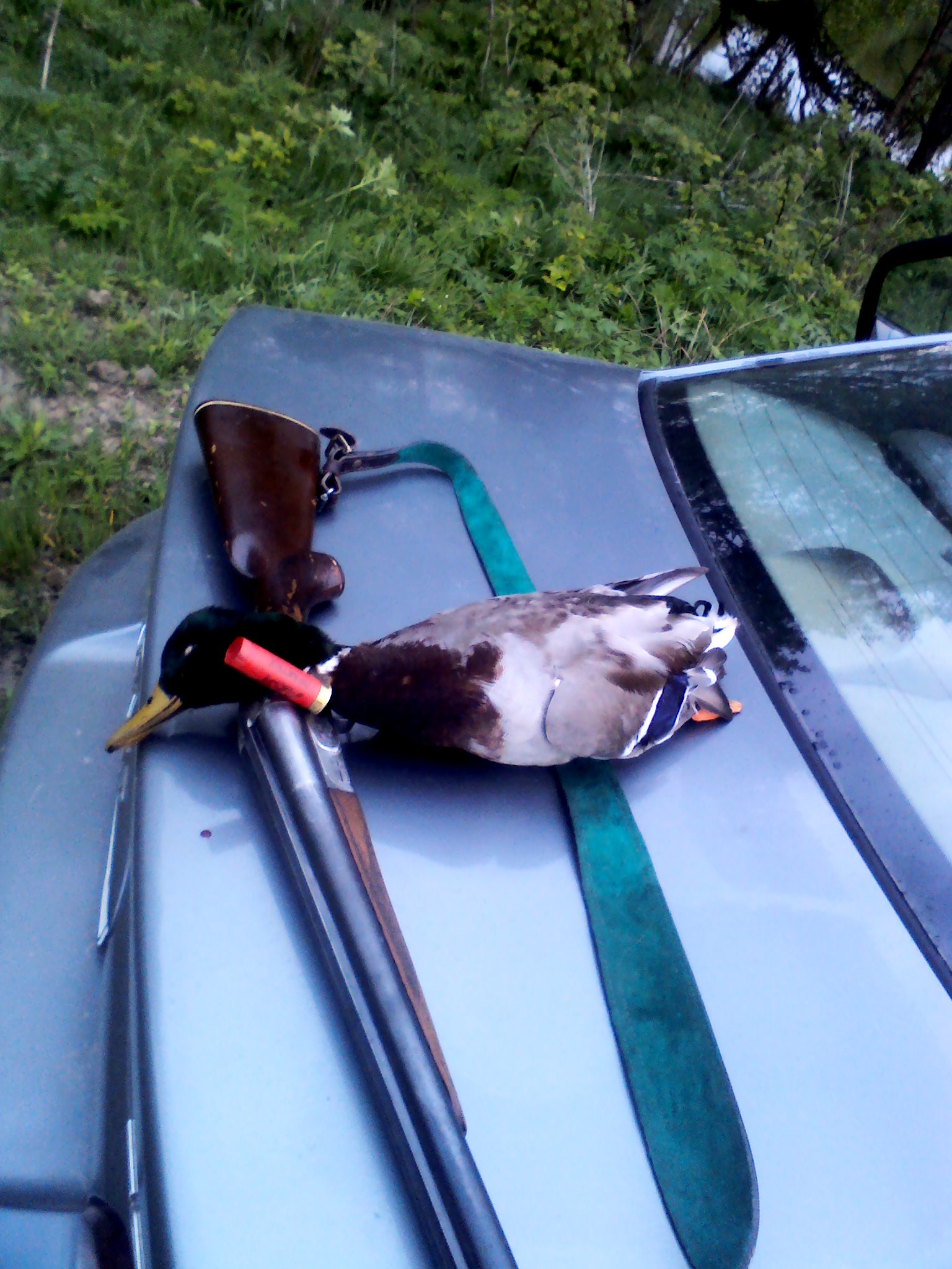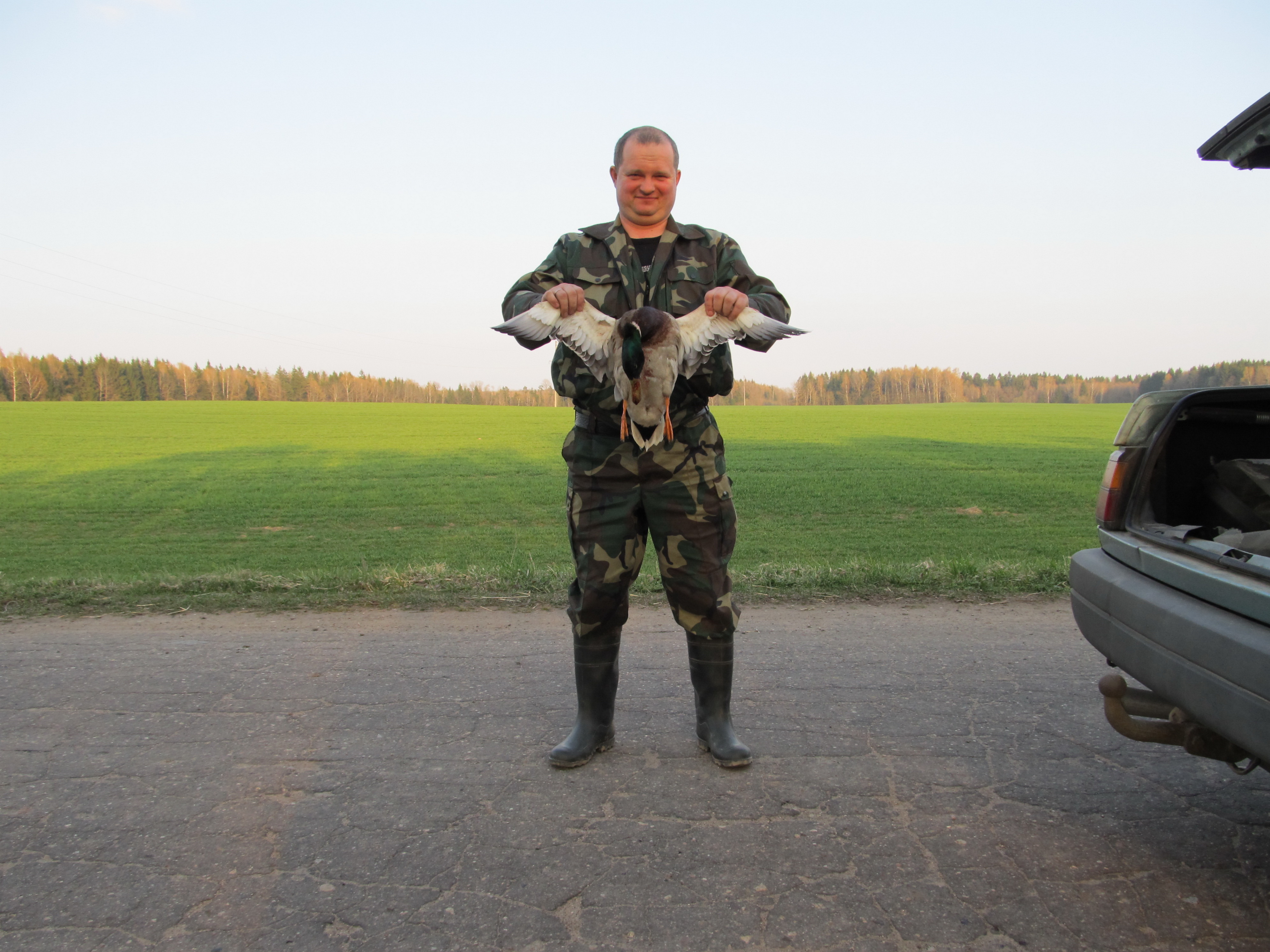 сегодня в 3.00 проснулся, в 4.35 был уже в скрадке на берегу озера, Маруся (подсадная) сработала просто изумительно, в 5.07 приблизительно в 40 метрах от меня сел селезень, с одного выстрела добыл красавца, так сказать один выстрел - один селезень. Около 6.00 слева от меня начали шуршать кусты малины-ежевики, я уже думал, что лось ломится на водопой, а оказалось рыбак пришёл, я ему попытался объяснить, что будем мешать друг другу, мол в 100м ещё два озера, но товарищ оказался не в адеквате, поэтому пришлось уехать домой. По приезду достал Марусю из бочки и офигел - по пути домой снесла яйцо, так что если всё срастётся, то во вторник поеду за селезнем. Всех с закрытием весенней охоты по перу 2014!!!!!!!!!!!!!!!!!!