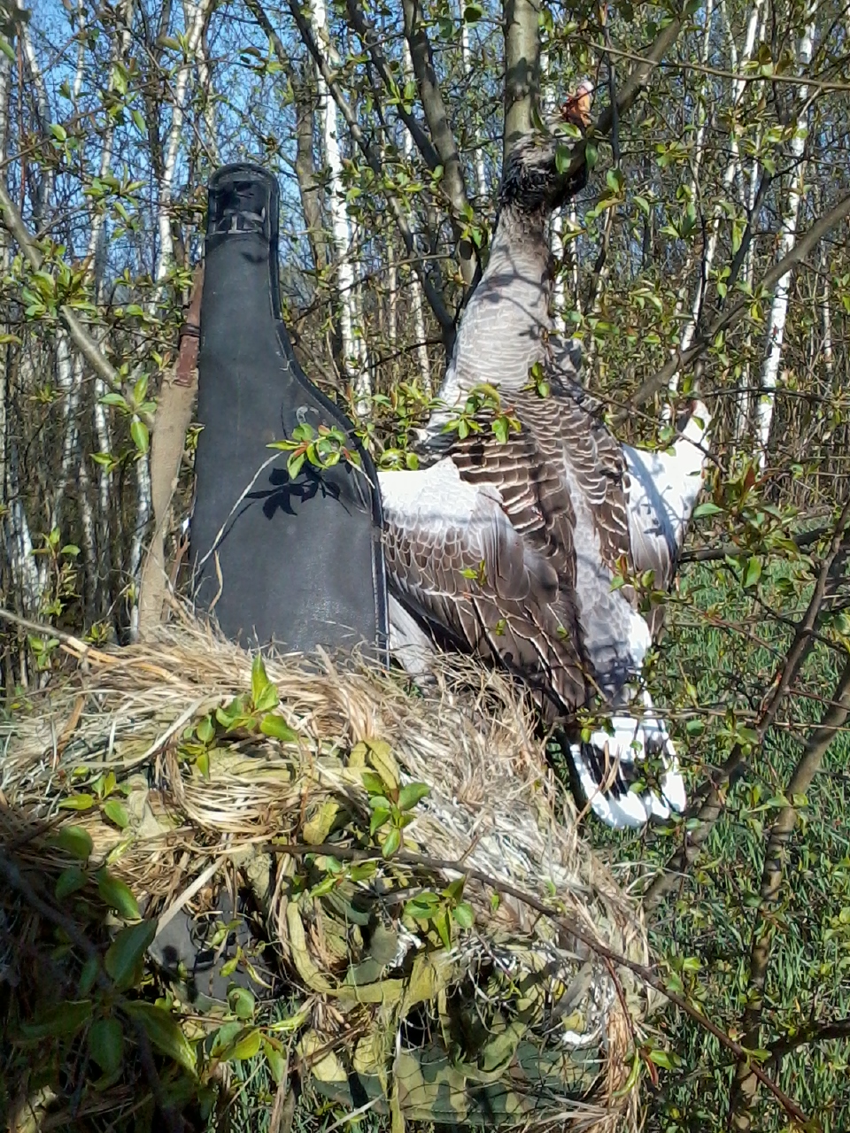 Падышоўшы да возера, праз лазнік разглядаю люстэрка вады. Шмат лебядзей, амаль пад 30 галоў. Гусей не бачу. Крочу далей, да месца. І…, раптам чую, усплёск вады і, … над возерам узнімаюцца гусі. Ага, вось вы дзе схаваліся, пад самы бераг. Мусіць, белакрылыя родзічы вас з сярэдзіны паціснулі да берага. Але ладна - паляцелі, ды й паляцелі, чорт з вамі. Дайшоў да месца, праз мячэўнік і трыснёг пралез да шалашыка. Агледзеўся, у далечыні плаваюць качкі, пішчаць у мячэўніку лысухі. На стульчык палажыў “манаткі”. Адзеў капялюш ад маскхалату. Стрэльбы паставіў каля стульчыка. Раскінуў качыныя чучалы, іду каб выставіць прафілі. Cтаўляю, раз, два, …пяць, шэсць. Раптам чую: "гак-ггак-ггак". Дык вы вяртаецеся! Бягом да шалашыка. Перад шалашыкам спыніўся. Прыслухоўваюся, аглядаюся навокал. Ё.., як маланка пасярод чыстага неба, на ваду (у метрах сорак ад прафілёў) садзяцца два гуся. Падаю “на чатыры касці” ў ваду. Што ж рабіць? Пад пахай астатнія прафілі, да шалашыка паўметра, стрэльбы ў чахлах. Як жа іх не злякаць? Яно ж то можа быць – гэта апошнія гусі ў гэтым вясновым сезоне. Яны плаваюць, гагакаюць у бок прафілёў. Пагакалі, адплылі, заціхлі. Так, так – не панікаваць! Кладу астатнія прафілі на ваду. Вельмі асцярожна залез у шалаш. Гак-гак-ггак! Што? Учулі, убачылі? Чаго загаманілі? Ах ты ж ё...! Да гэтых дзвюх невядома адкуль далучаюцца з шумам яшчэ 12 гусей. Адкуль яны прыляцелі? Ліха іх ведае!