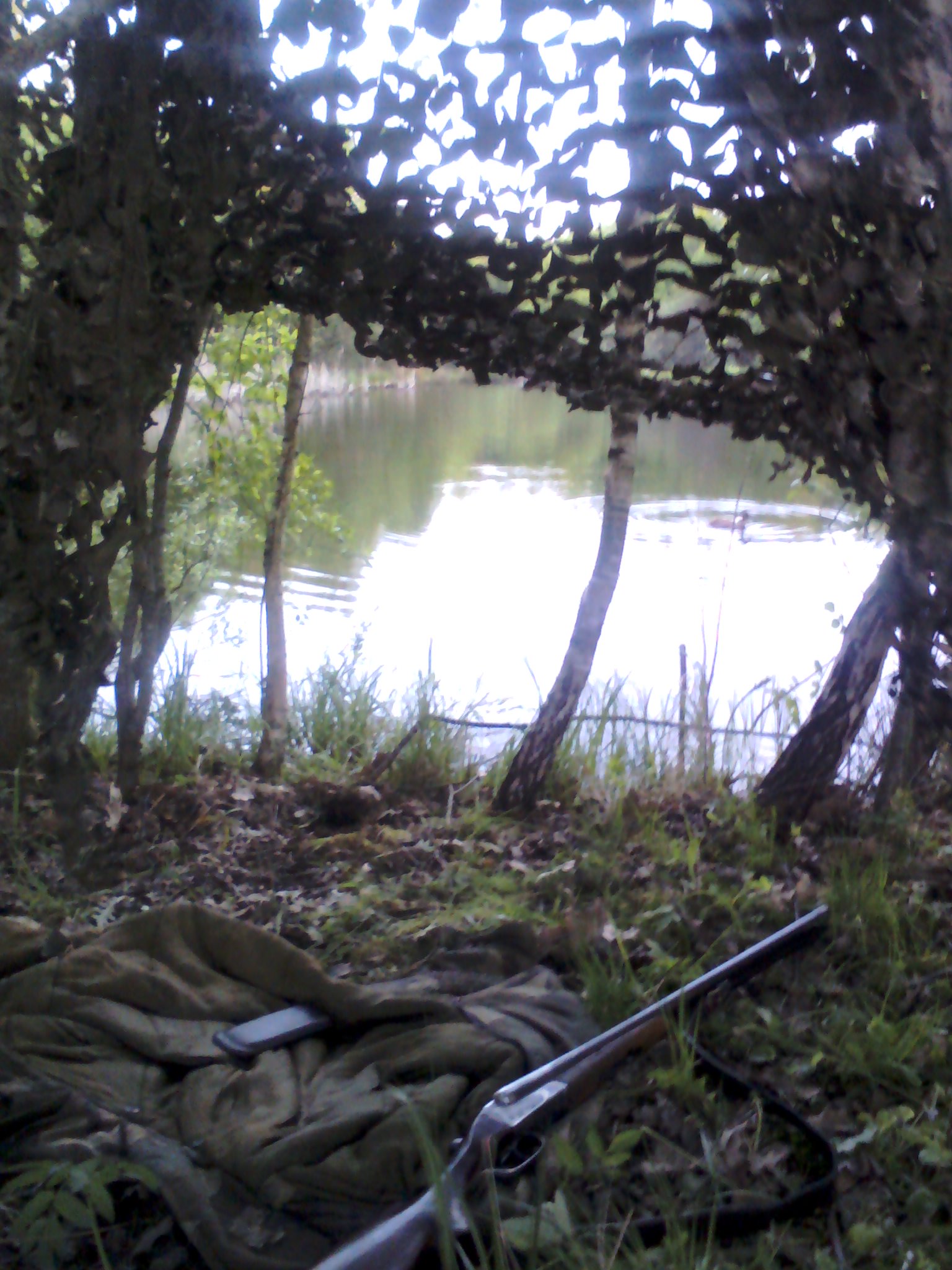 Яшчэ з гадзіну я сядзеў у шалашы. Ужо адзеў маскхалат поўнасцю. Паставіў астатнія прафілі. Склаў і другую стрэльбу. Правароніў качура крыжанкі.