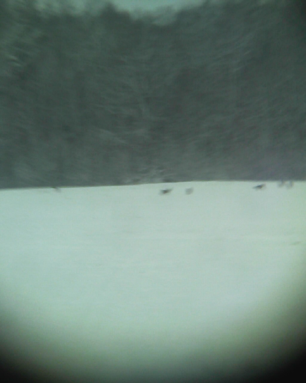 В субботу на вечер ездил в сторону того поля послушать гуся. Летали утки. Слышал одного чибиса. Перепаханные поля практически чистые от снега. Есть хорошие лужи. Гусь не прилетел. Зато по темноте на поле пришла «похоронная команда» в составе 7 голов. Попытался снять через ночник мобильником – получилось не очень. В натуре выглядело получше и намного более зловеще.