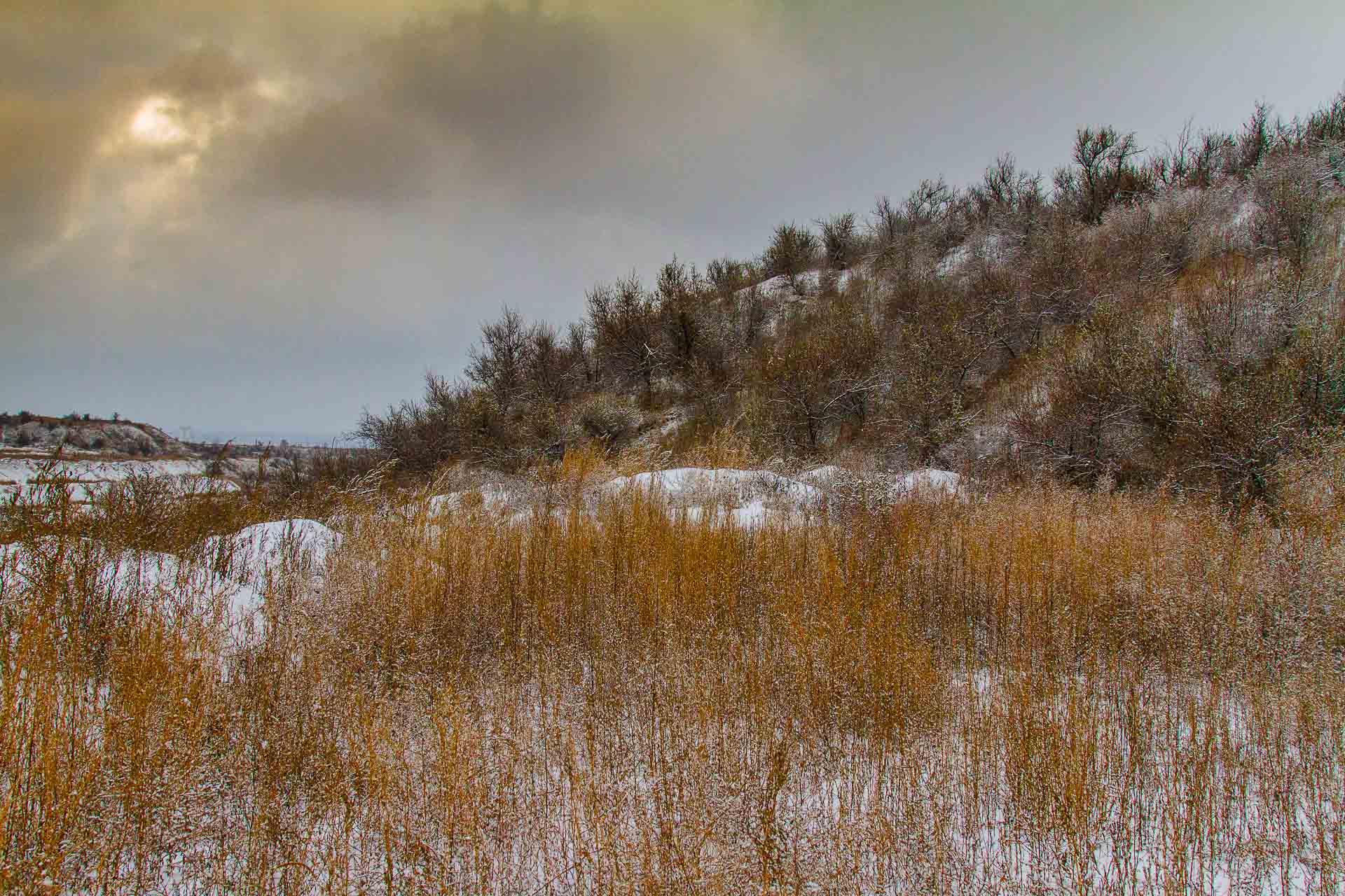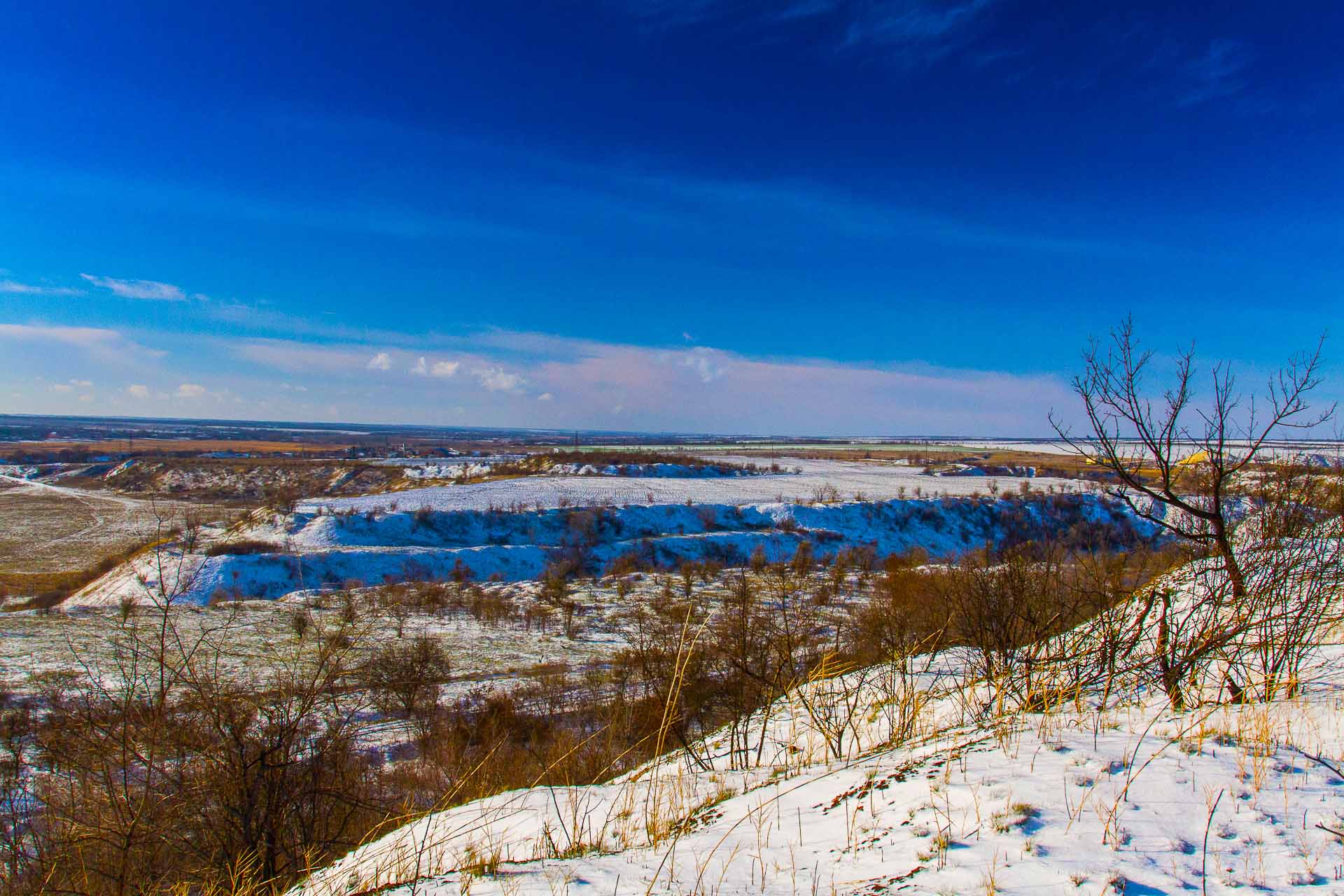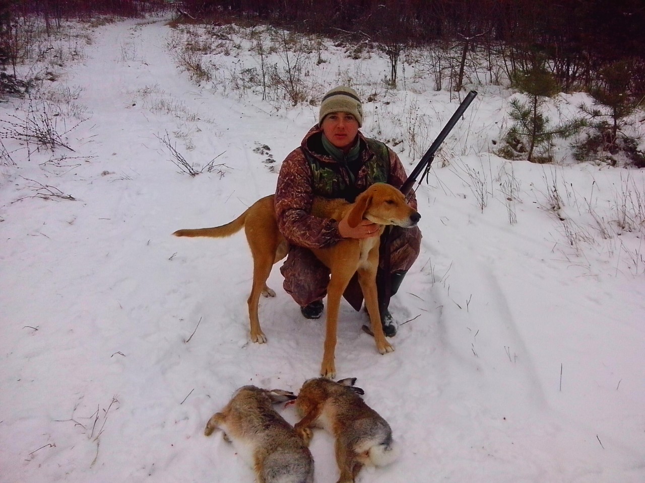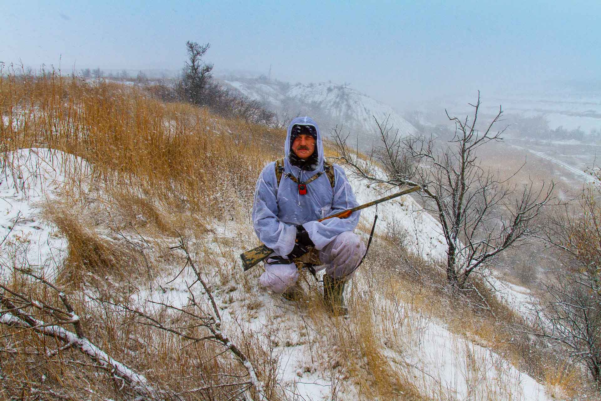 , в переглядку и жестами, в метрах 20-ти друг от друга пошли … надыбал след-тропу… Махнул и сразу товарищ понявши мой жест, уходит в лево от меня метров на 50-60 на перед и трошки с захватом следующей «ступеньки»,… и там на горе, на самом крае её стопорит, садится и замирает … ждет… ну а я ползу по меж маслин и акаций далее по следам, ухожу вправо, огибаю подножье «ступени», и лезу по ней на гору … поднимаюсь тихо, снег, зараза скрипит, ступаю на пятку в косолап, аж екает всё от злости - так всё гучно … а следы до горы идут и идут, идут и идут, … мечу, что по короче прыжки у бегуна стали, видать притомило его … вот и верх … руж в правую руку с четырмя 0, меж пальцов – дубликат … делаю первые десять шагов по верху, тут и снимается заяц от меня будет так на 11 часов по курсу… рывком скидываю и бахаю, вижу пух пошел, а дружок уже его и углядел… хотел было ему крыкнуть, там мой вздох потонул в эхо его выстрела, … слышу, друг орет «уууухооодит в леееевоооо к низу», ломлюся в обрат к краю,… благо отошел на 10 шагов … на краю стопорю, и картина как в кино – заяц выбегает на друга, мимо него кидается вниз по склону, тот сходу потом еще вторым по заду, а тот хоть и качнуло его, вдоль подножья мчит, ровно так, уши прижмурил, весь вытянулся, скакун, тут я тем самым дубликатом сверху его и приложил, …и потом как угледили, в аккурат попал по голове - короче испортил и уши и голову, вообщем отбил весь передний мост - прям ужасть, в мыслях сказал - извини,… а дружок бачил енто все и говорит – стрыбун наверное в бронике был, та не на то место надел … немного позжее, уже при спуске на степь, поднял товарищ еще одного, ну и там, серед маслин, конечно и добрал… а на середку дня всё развиднелось, хмары ушли, и солнце приятно щеку нагрело, и ветер утих, и так гарно стало вдруг навколо, и с товарищем глядели до горизонту на сколько глаза хватило, и радые та довольные побрели до машинки, моцно обсуждая гонитьбу по первому снеговому зайцу…ну и фото немного,... снимал товарищ…