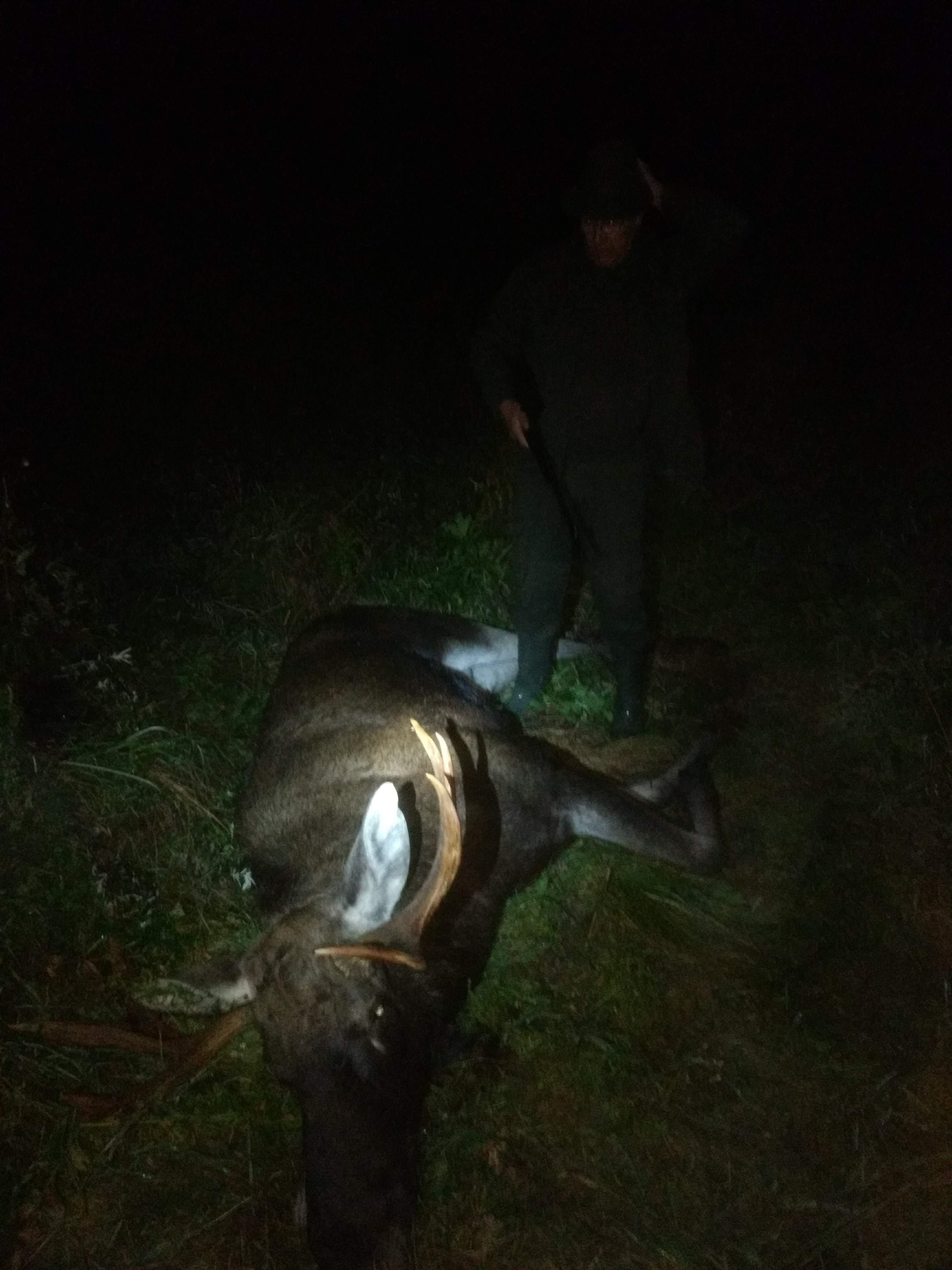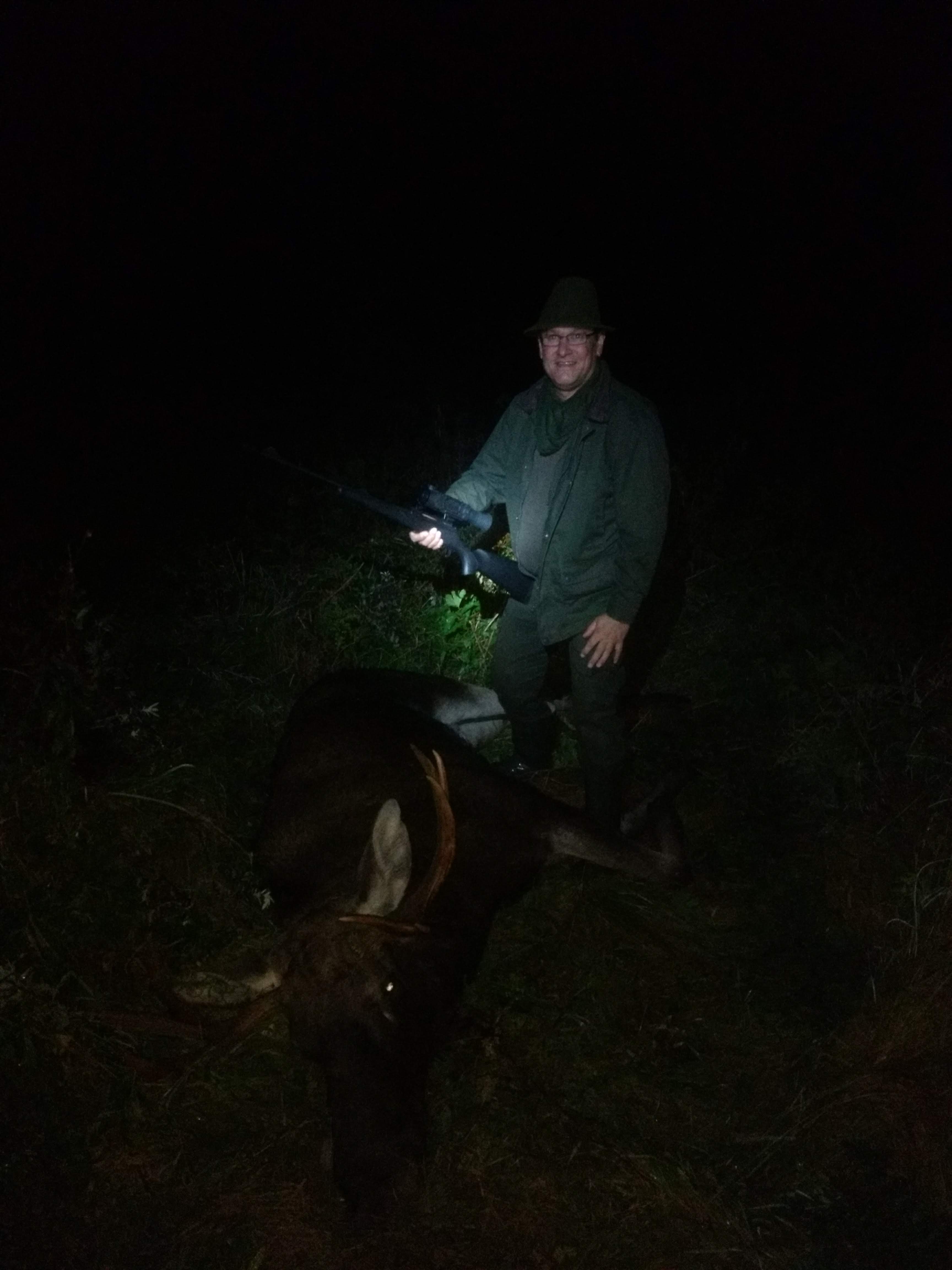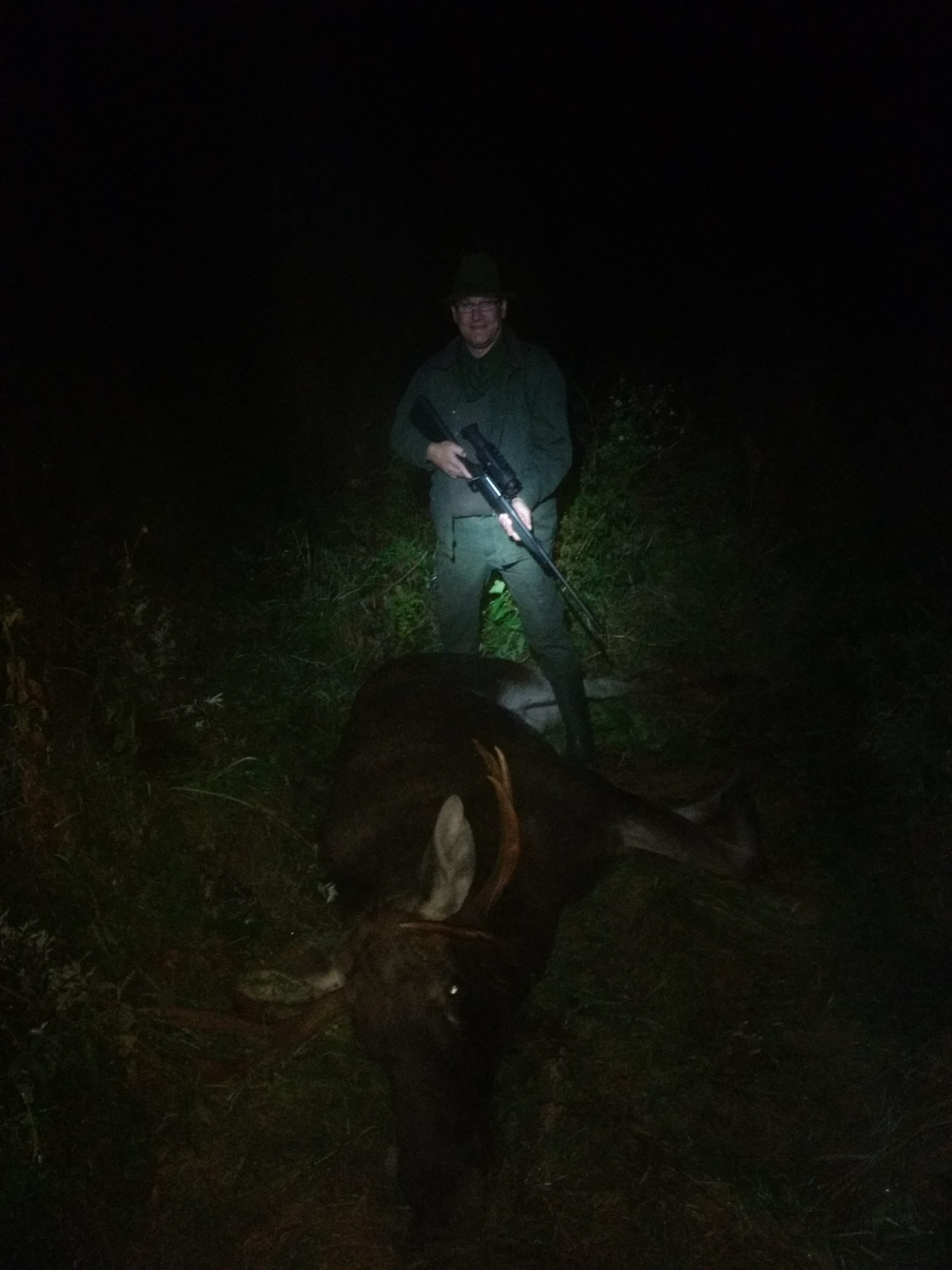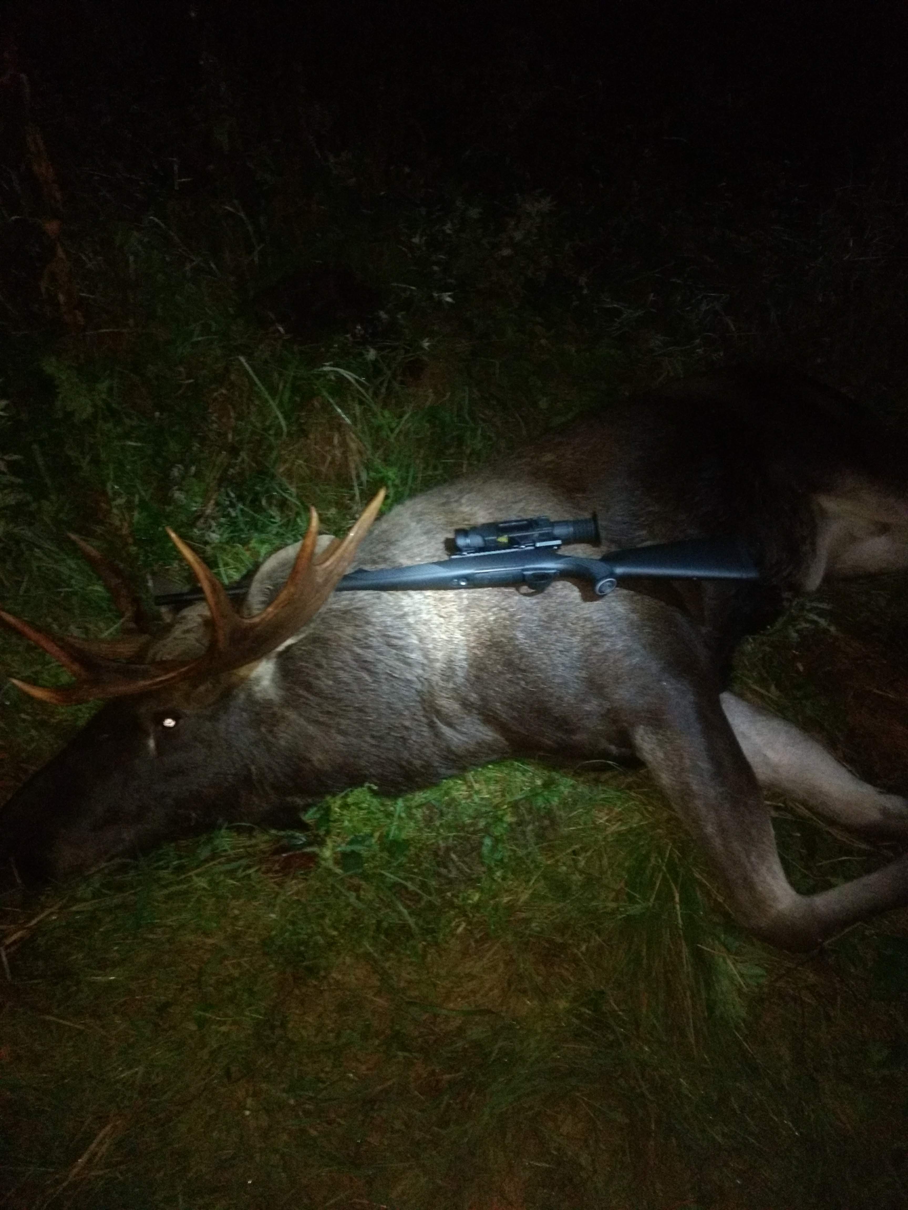 В общем, так, выпросил я себе взрослого лося, ну и поехал на поиски. Ночью на болотах туманы, по этому пришлось воспользоваться тепловизионным прицелом, для поиска и возможной добычи, сын, как раз купил себе нового дастера, и маниакально лез на нем в любую грязь. Соответственно в полном тумане доставил меня на "Гримбленскую трясину", трава там выросла выше дастера, я и вылез из машины поискать Собаку Баскервилей. :-) Залез на подходящую кочку, и стал обозревать окрестности. Собаки не было, за то я увидел лосиху, которая обдирала куст и горестно вздыхала, ну думаю, скучно ей, лосей всех сожрали, вот и мается одна в болоте. Ну я ее поснимал на видео, минут 5, сын тоже полюбовался, и сели в машину, поползли обратно. Тут я смотрю - просвет в деревьях. Дай думаю посмотрю, вылазию, глядь, а в 100 метрах лось самец стоит, на голове рассмотрел рога, по 2 отвилка. Из травы видно только голову. Я давай расчехлять карабин в багажнике, поглядывая за лосем, как всегда, все из рук валится, бокс с патронами под машину закатился, я уже закипаю :ps_ih: , лось уходит вправо, за дерево... suko Как лось ушел, пазл сразу собрался, я побежал вправо, догонять ушедший поезд... Тут из-за этого дерева, с другой стороны, появляется голова лося, ну я внимательно всматриваюсь, ищу намек на рога, адреналин уже уши заполнил, замечаю рог с одной стороны, вроде бы 2 отвилка, ну думаю - последний шанс... Стреляю... Голова исчезает... :ohot_nik: