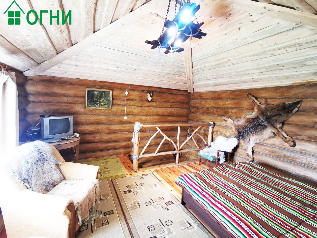 Дом сделан из бревна ручной рубки и в нем чувствуется атмосфера охоты.