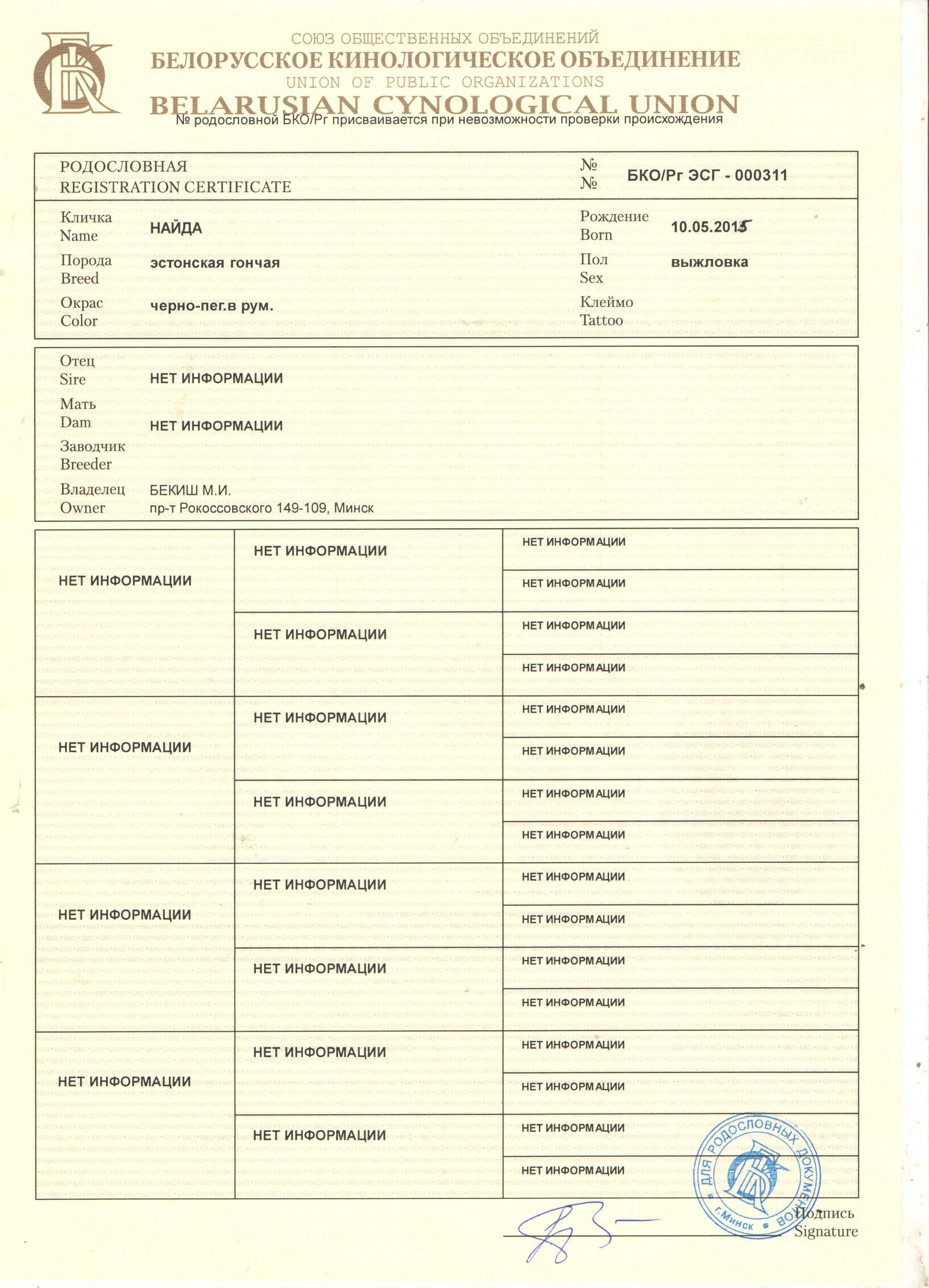 Aleksej_006 писал(а):Олег, уже тёрли эту тему на другом ресурсе. Выдача регистровых запрещена ...... со слов Чумакиной. А Ходатович не показал документа, на основании которого выдаёт родословные.