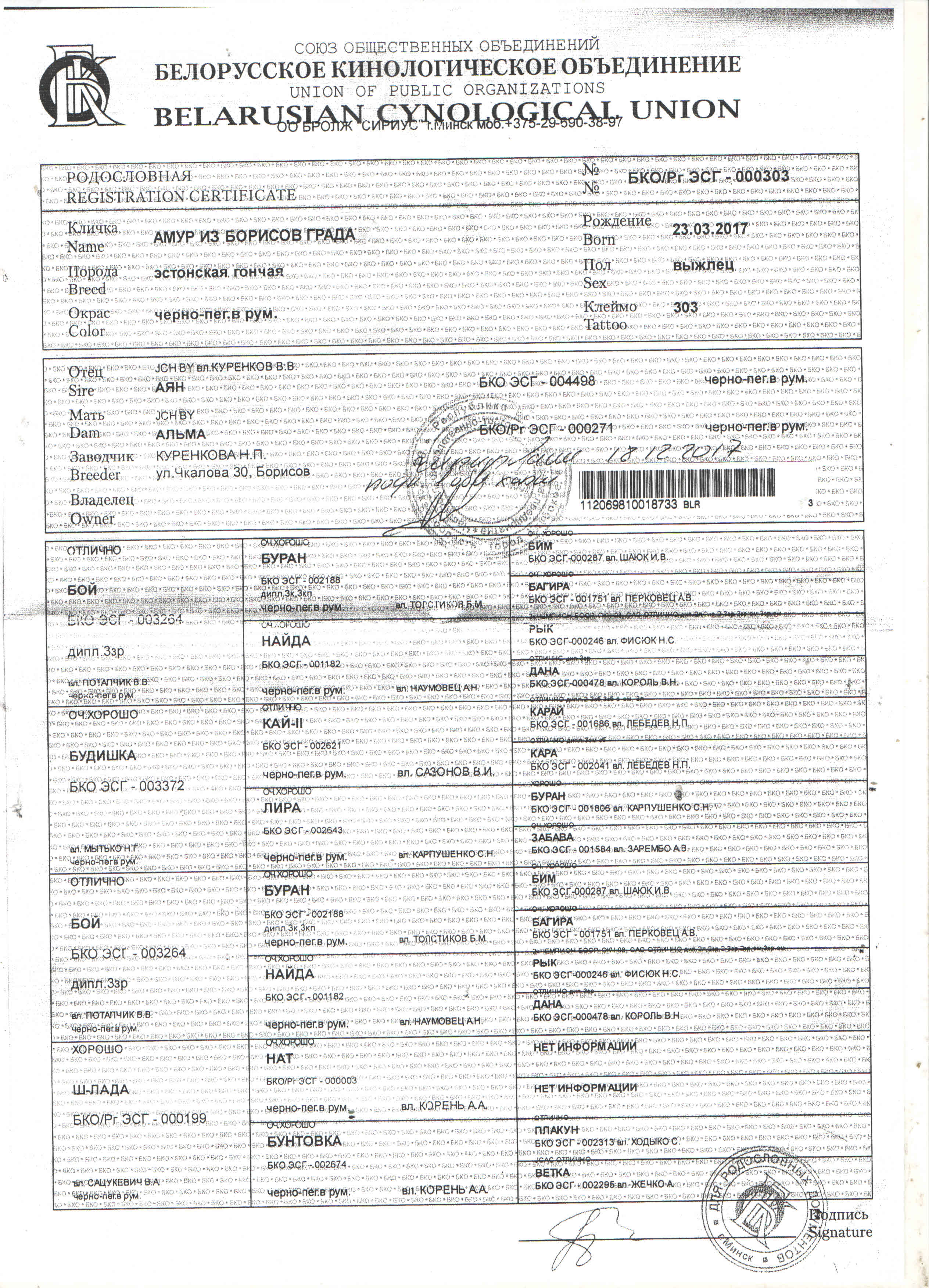 На сегодня удалось выяснить следующее: СОО БКО (выдает родословные на всех белорусских собак из единой базы данных) выдало родословную № БКО ЭСГ - 002768 на выжловку эстонской гончей Тина, рождения 19.10.2009.