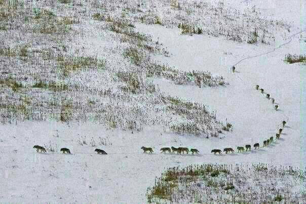 Волчья стая. Впереди идут трое самых слабых и больных.