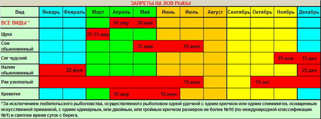 лов сома обыкновенного - с 31 мая по 1 июля, с 1 ноября по 31 марта, в Брестской и Гомельской областях - с 19 мая по 20 июня, с 1 ноября по 31 марта;