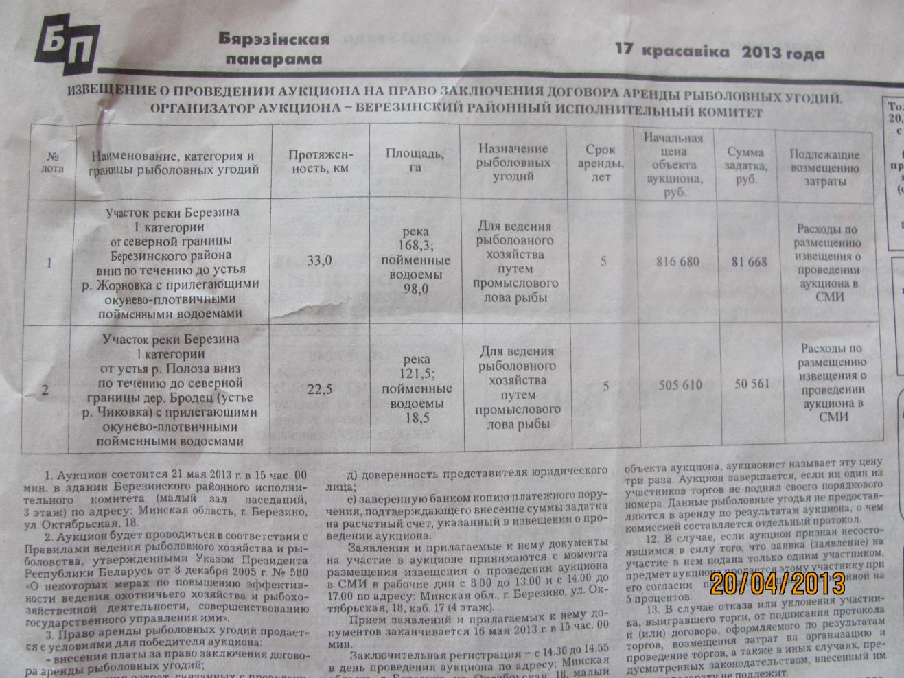 Данные торги являются повторными. Осенью 2012 года Березинский РИК проявил благоразумие и отказался от проведения торгов, прислушавшись к мнению рыболовов-любителей и просто людей, которые неравнодушны к судьбе любимой реки - _http://www.mvolna.by/radio/news/soci...ed=societynews