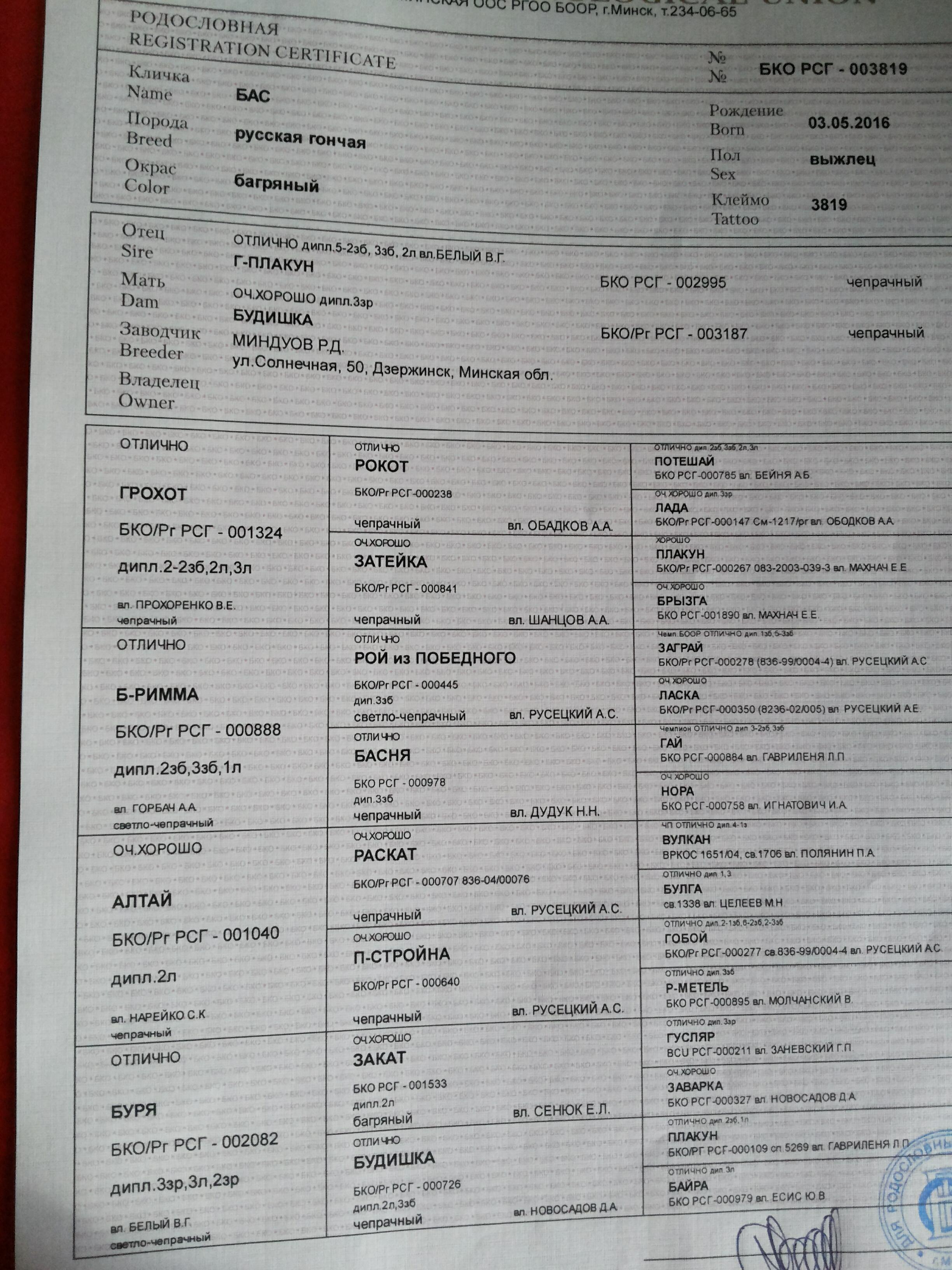 1. Порода : Русская гончая1.2. Количество щенков (кобелей/сук) : 11.3. Дата рождения щенков : 03.05.20162. Родители щенков :2.1. Отец :Плакун2.1.1 Все дипломы за рабочие качества с указанием по виду дичи : дипл. 5-2зр,1-3зр