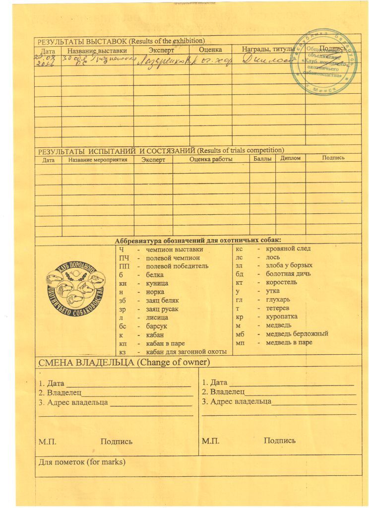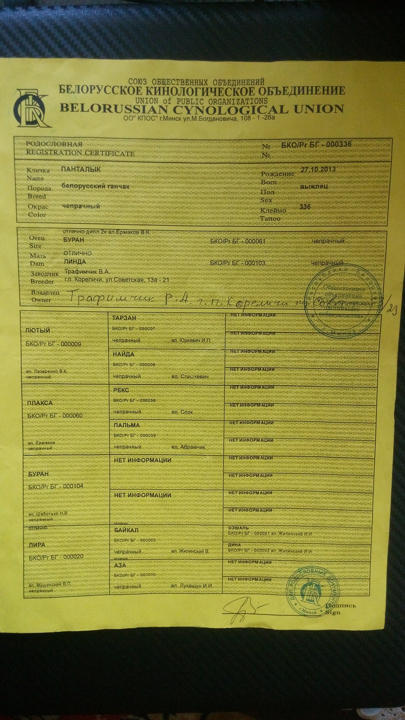 2.2.1 Кличка, номер родословной, фотография родословной с двух сторон.