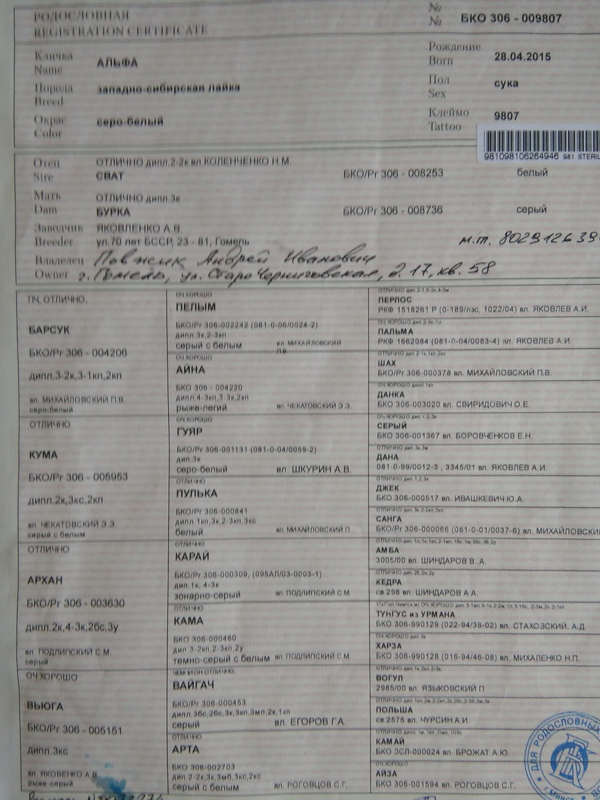 2.2.1 Кличка, номер родословной, фотография родословной с двух сторон.Альфа,Бко 306 009807