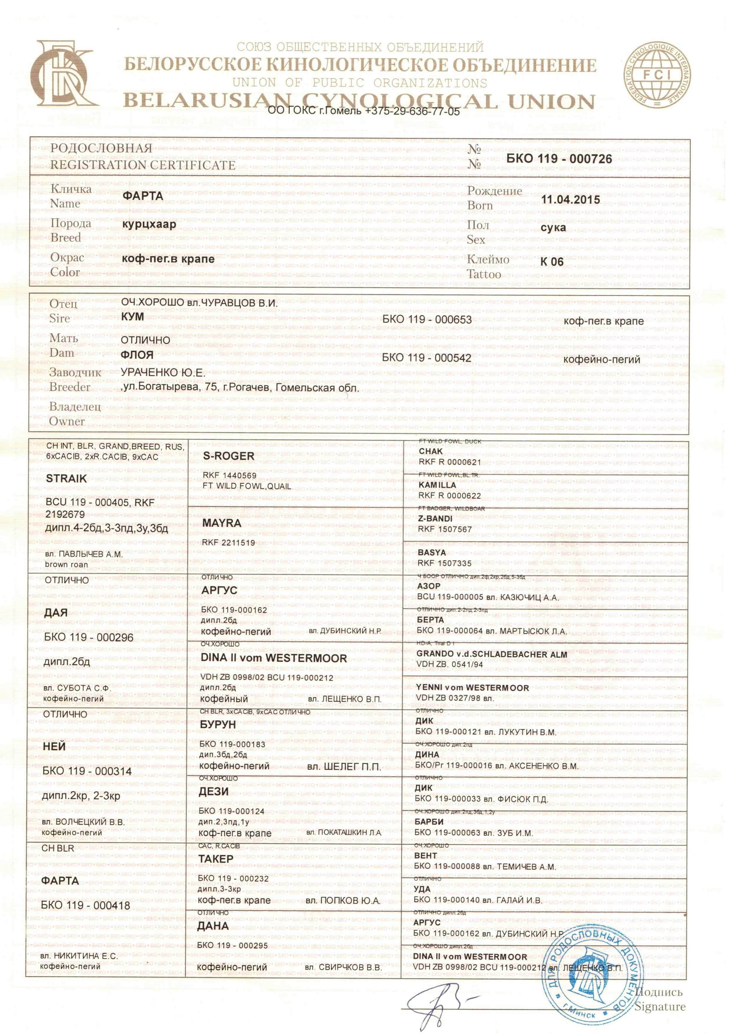2.2.1 Кличка, номер родословной, фотография родословной с двух сторон.