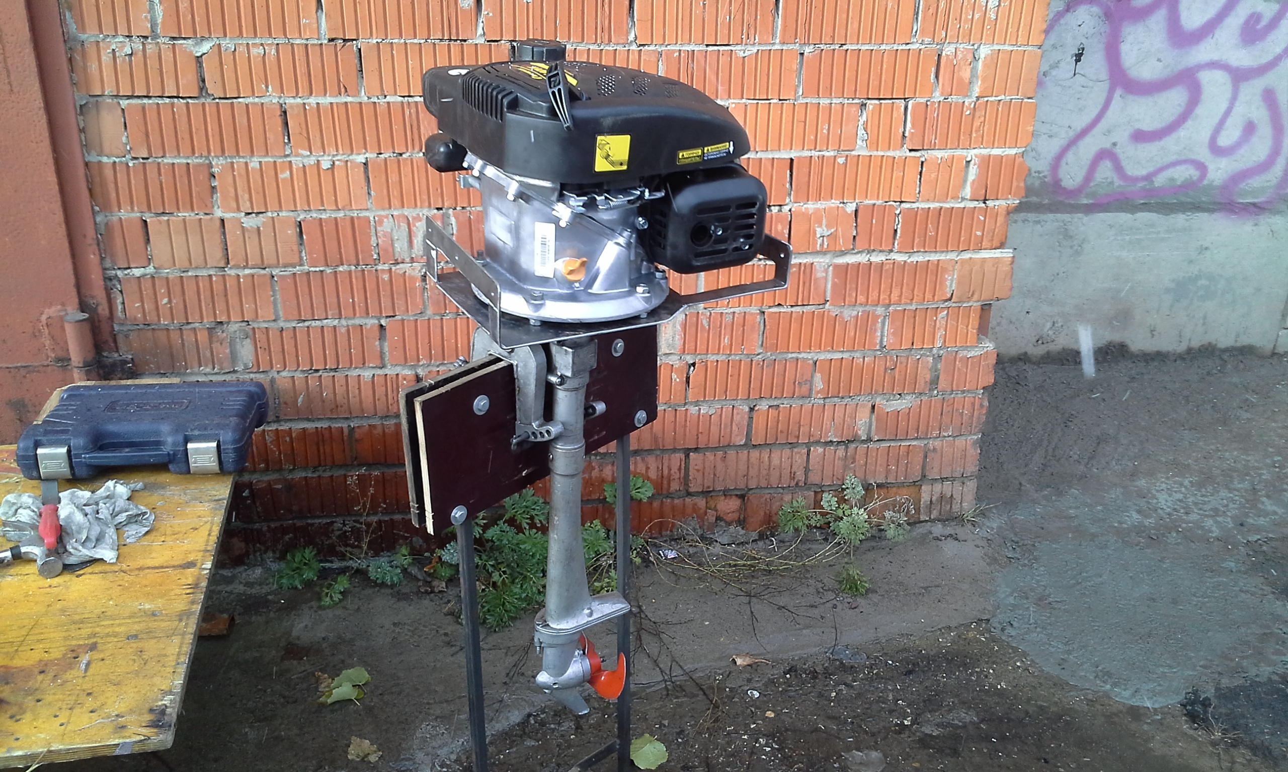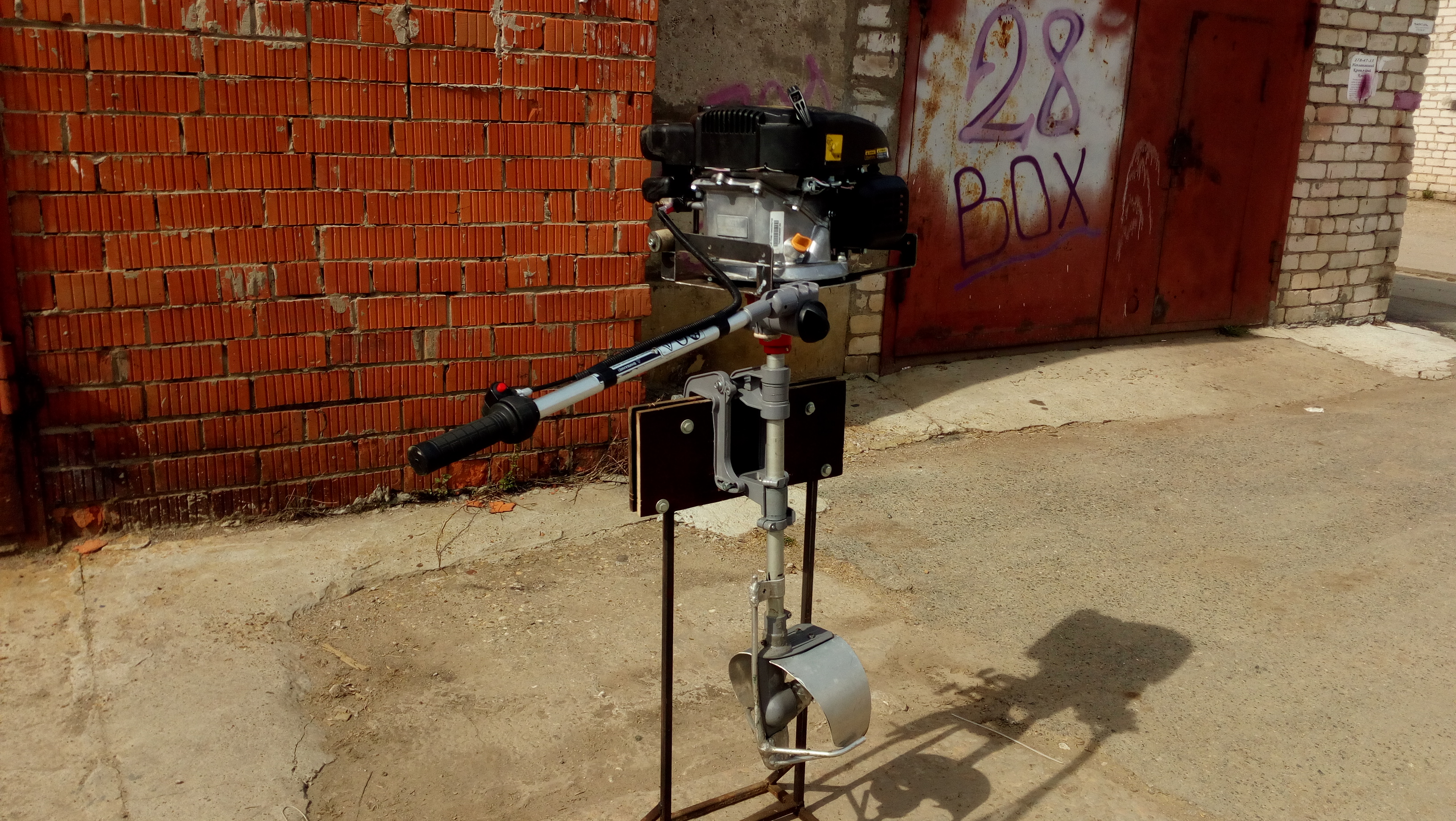 Мои мытарства не удались. дело было так: Есть Культиватор из Леруа Мерлен "земляк", двиг 5 сил (четыре-такта)как пишут на нем кубики 140, это отлично, и нет возможности купить настоящий мотор лодочный, когда покупал культиватор, так и думал будет и на даче работать и лодку таскать, два в одном, но не случилось. Были препятствия непреодолимые, вес, большой и тяжелый и тем более неудобный, не унывал, месяца два или чуть меньше приделывал его к ноге от карвера, есть такой лодочный мотор на базе тримера.