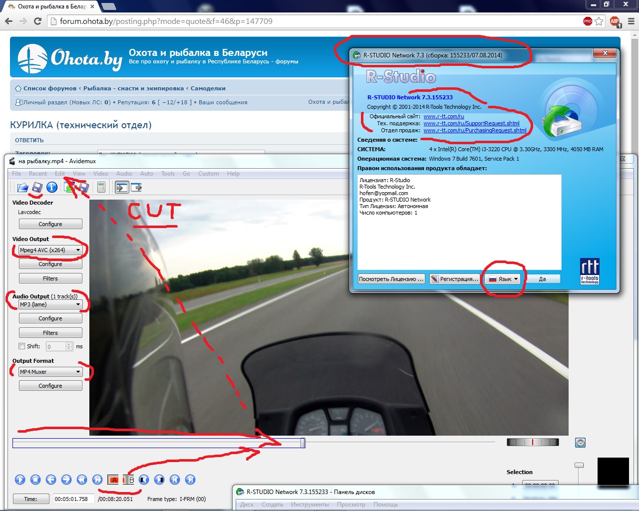 Вот тебе скрин, справа прога для восстановления данных R-Studio, слева та которую использую для резки, склейки и т.д. при работе с видео Avidemux 2.6 . Там особо пока еще не разобрался, выставляю пару значений (как отмечено на скрине), откуда до куда отрезать А-В , и более менее что то получается. :ne_vi_del: