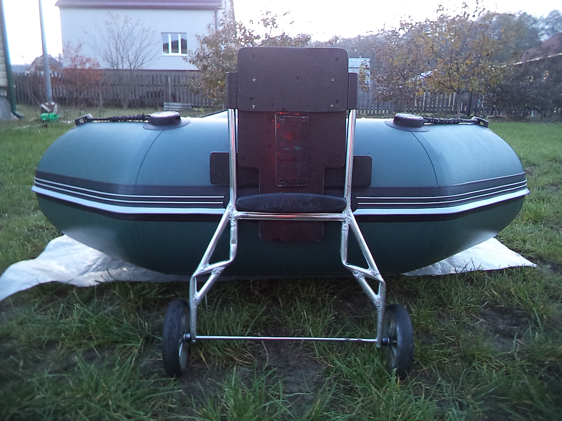 Колёса и каркас от старой детской коляски. Трубки подгибал по ширине своего транца. Для надёжности по углам приварил распорки.