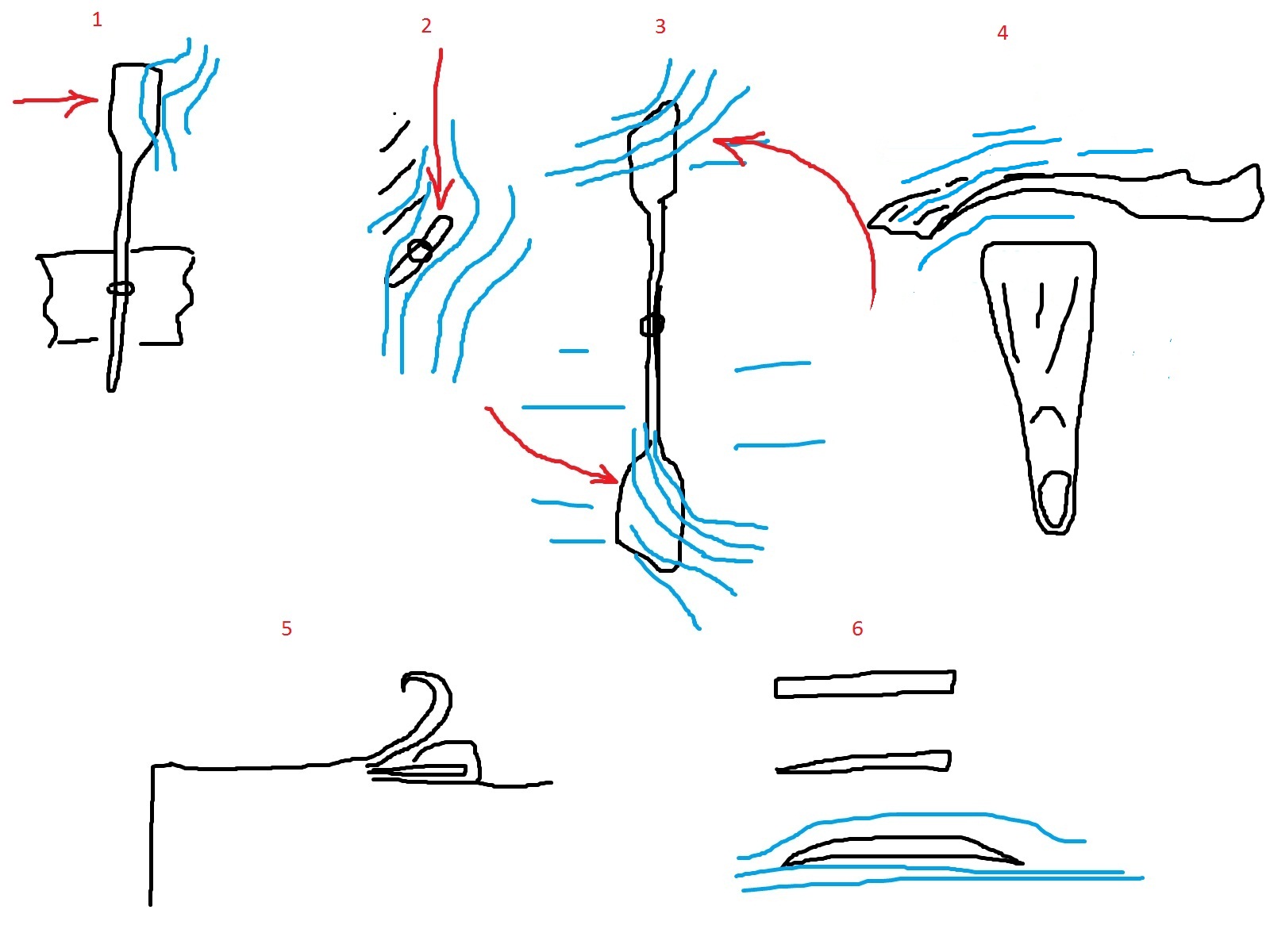 А теперь обьясни мне популярно, при чем тут разрежение, если попросту площадью лопасти винта вода фактически захватывается впереди и выдавливается сзади ? То же самое и с ластами и даже с разрезаемым ножиком куском сала рис.5... Вещество выдавливается по направлению заданному воздействующей на него плоскостью. Ну когда то весло с рис.3 раскрутится до 10 тыщ оборотов, вода будет улетать с него пулей и проявится явление с которым (никогда его не видав..) все мы упорно боремся при помощи антикавитационных плит...
