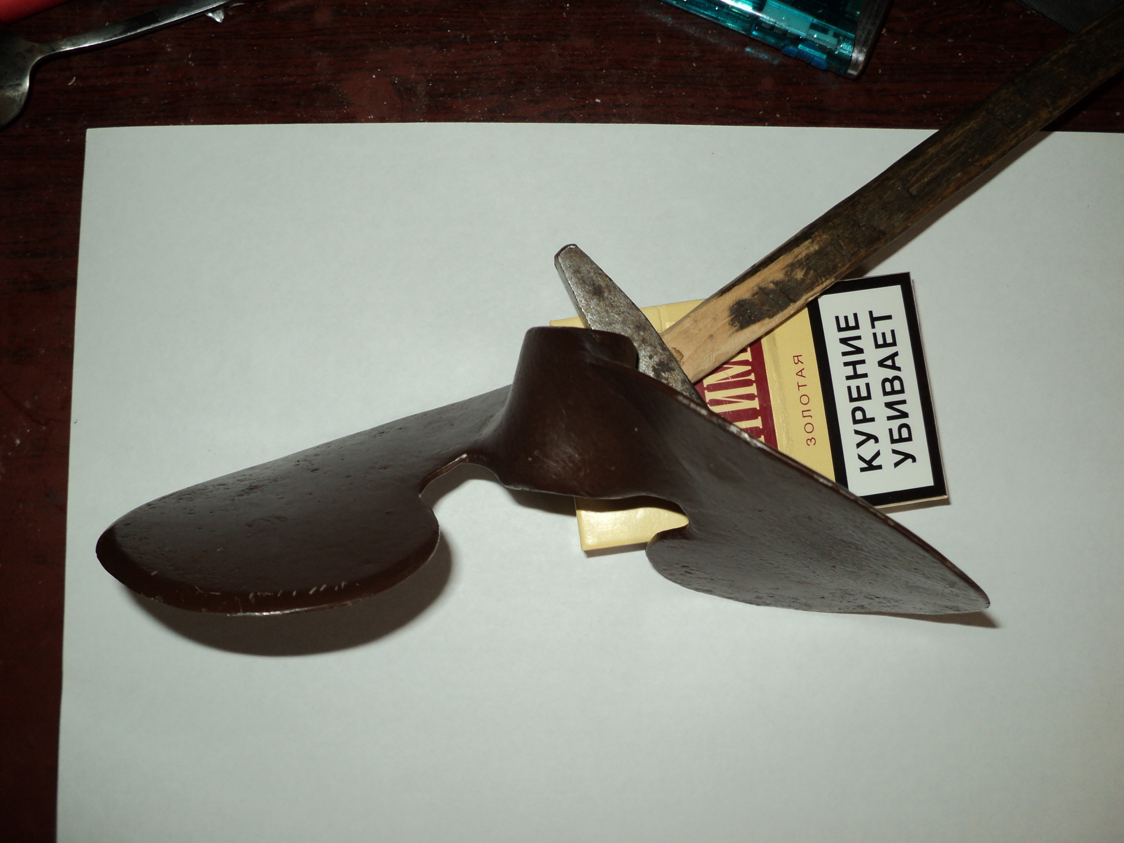 Зажав конец лопасти в тисках и вставив в отверстие ступицы подходящий стержень, разворачиваем (закручиваем) лопасть в сторону уменьшения угла наклона (шага), контролируя результат вырезанным шаблоном:
