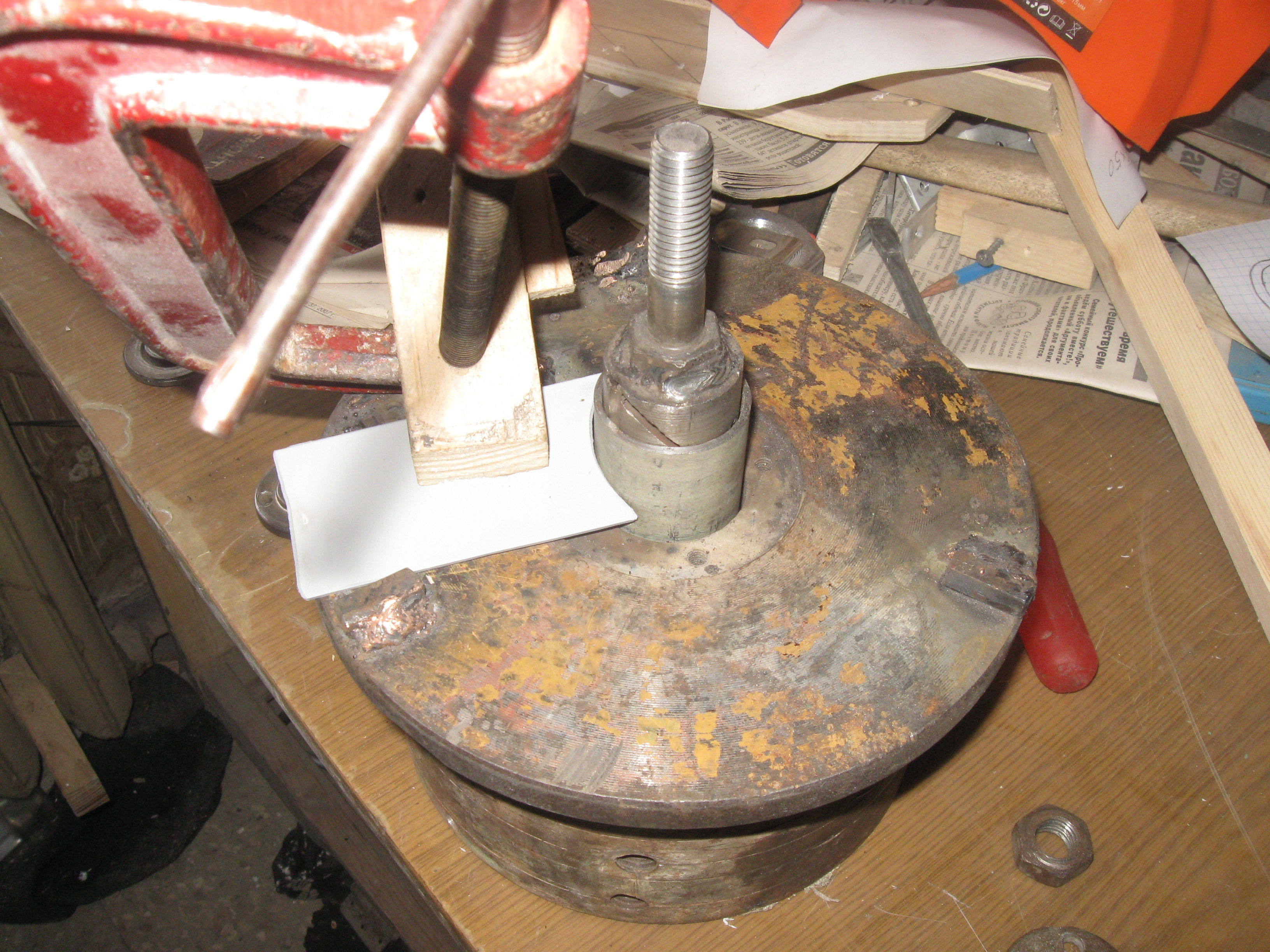 С лева направо,подставка,фланец для промера углов,фланец с уголком для сварки,сверху центр для ступицы.