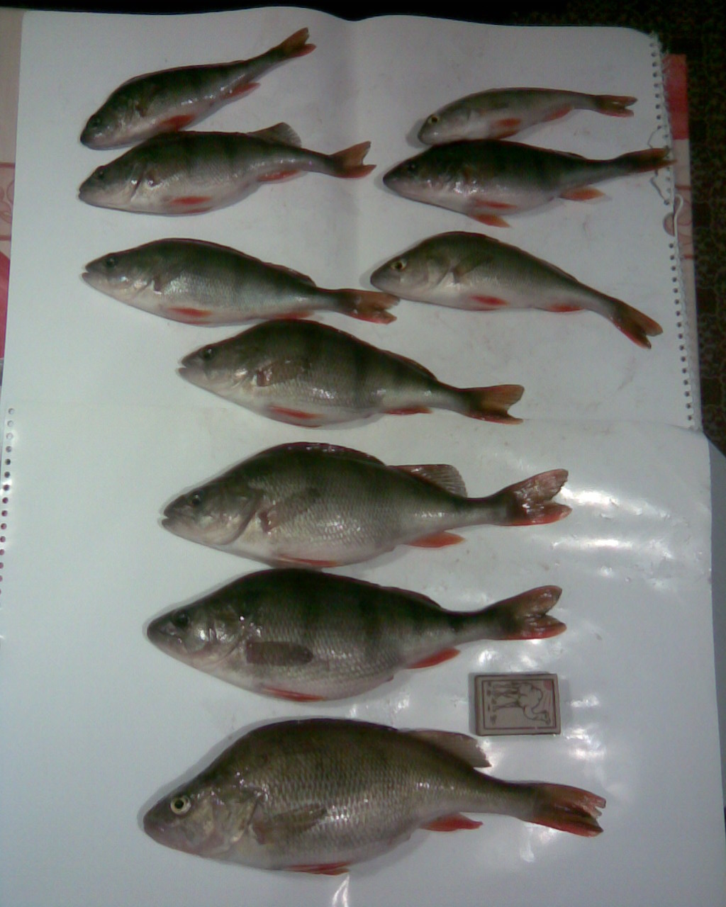 Таким образом и в этом месте я ловил крупных окуней несколько лет подряд. Хотя «золотую» мормышку какой-то монстр вскоре у меня оторвал, я накупил похожих на нее и успешно на них ловил. Клевало лучше всего в ясную, морозную погоду во второй половине зимы. Результаты этих рыбалок видны на фото, а соседние коллеги по рыбалке, использующие мотыля, довольствовались матросами, не подозревая, что в водоеме есть более достойные трофеи.