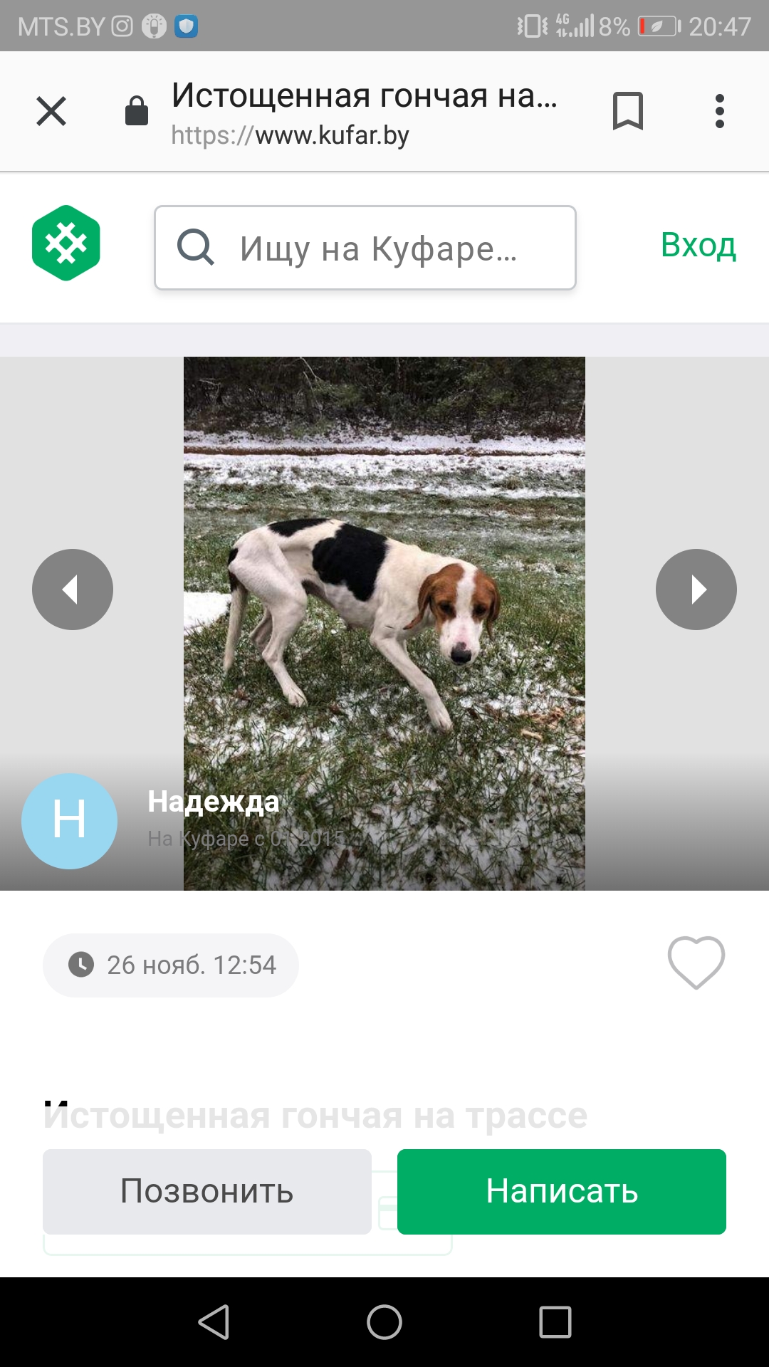 188 км от Минска (40 км от Баранович) замечена очень худая собака девочка, породы Русская пегая гончая .