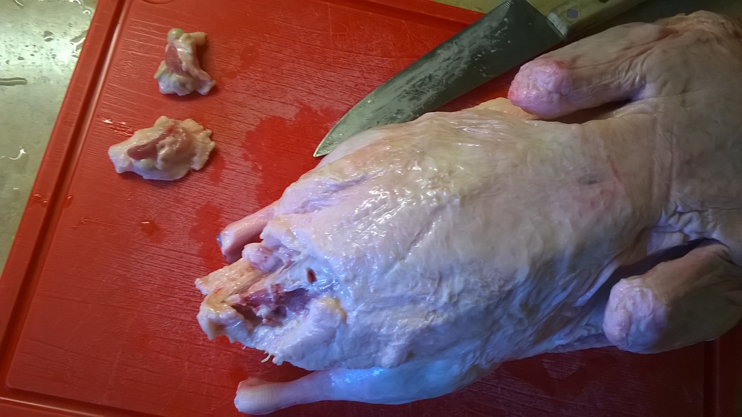 Затем подготавливаем тушку утки, моем убираем остатки пера и пуха, можно ее чуть подсмолить (если пух не убирается ножом). Вырезаем железу на хвосте!