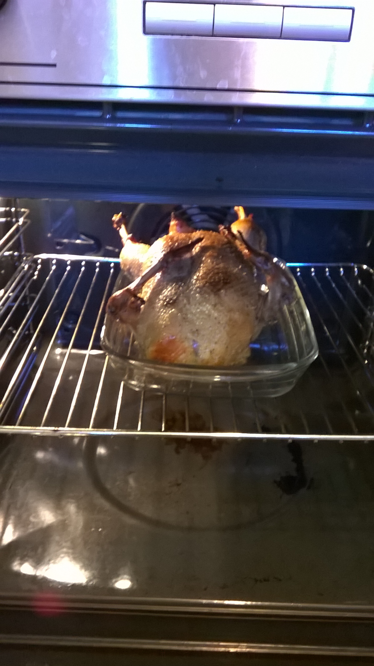 Внимаем утку из миски, укладываем в утятницу (у меня это сотейник, в другую емкость не влезла :) ) закрываем фольгой и ставим в духовку на 190С на часика полтора-два.