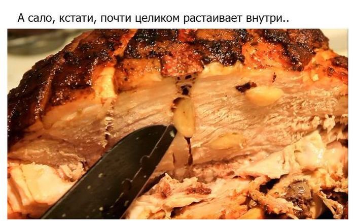 Готовое мясо выкладывают на стол целиком, или же нарезают его как пирог, на куски.