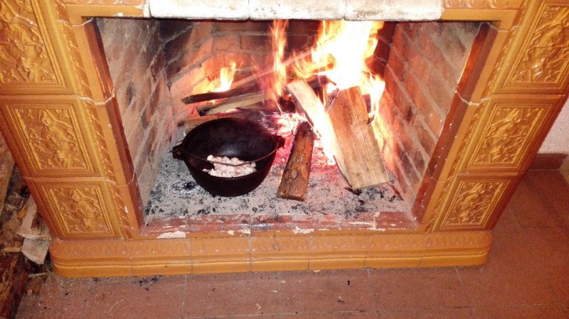 в камин ставится казан, и ждем когда казан раскалится хорошенько,