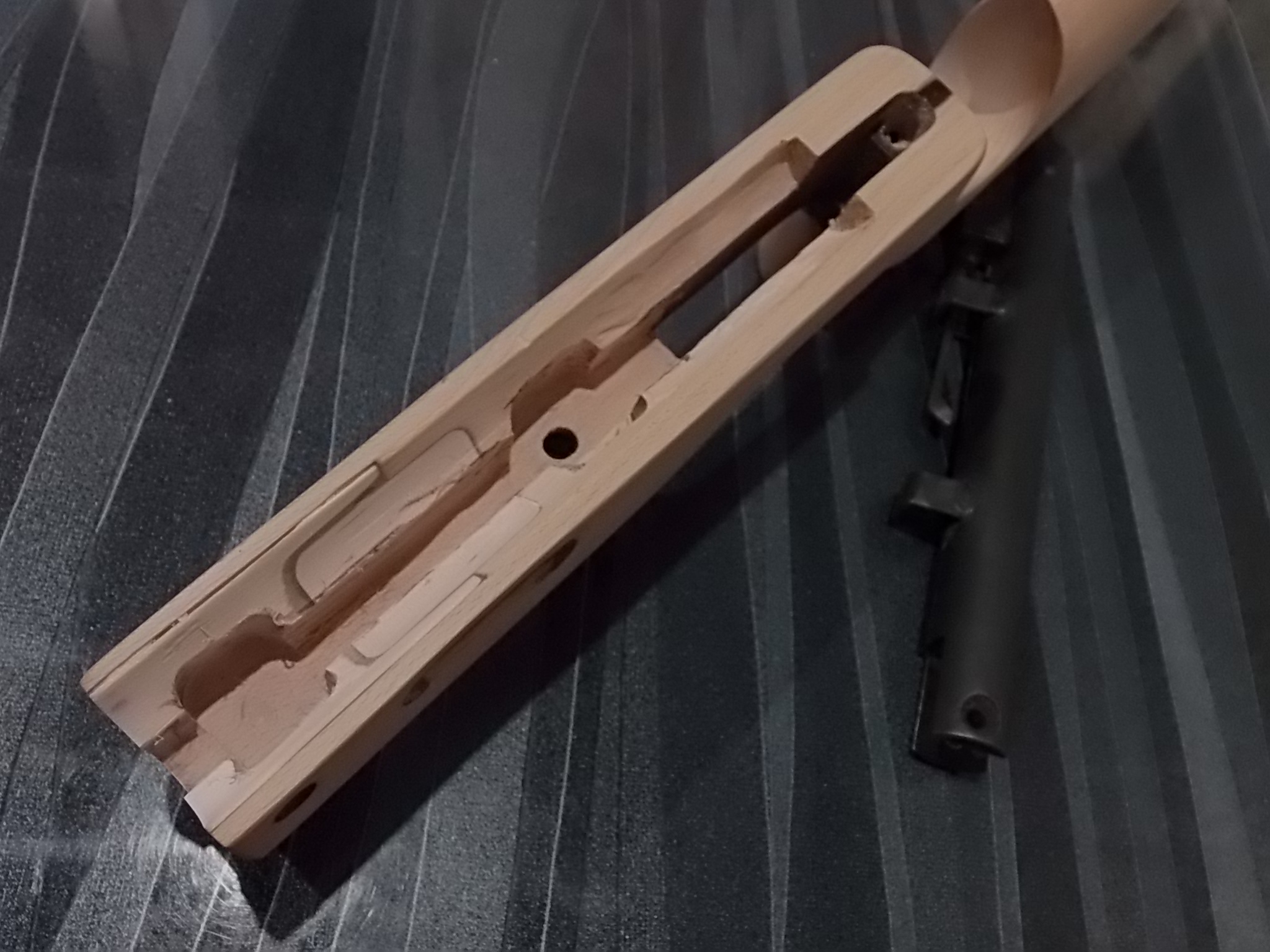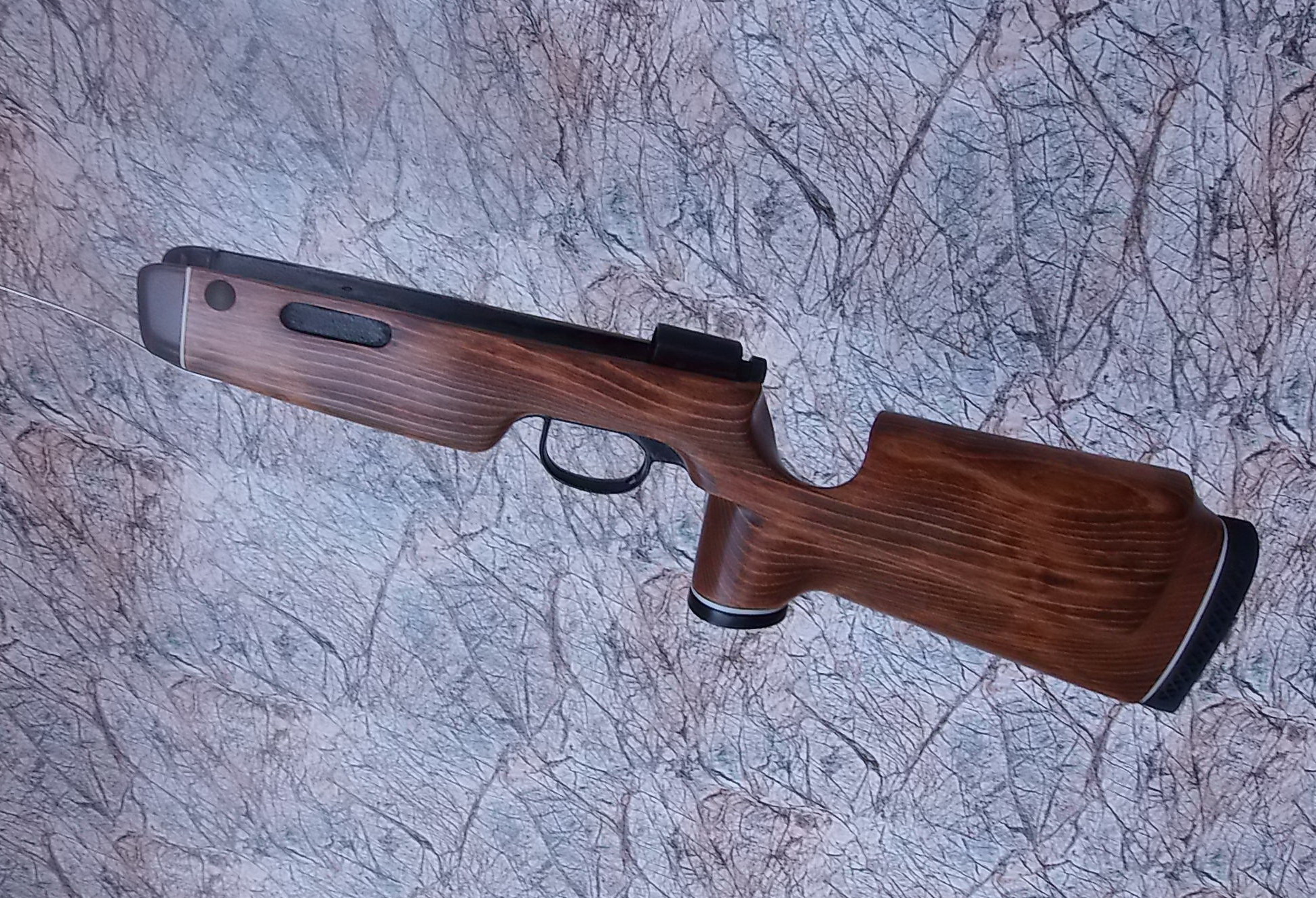 Итак… «Железо» было практически уже доведено до нужного уровня.Полную сборку железяк отложил-ведь нужно делать было ложу для винтовки,а примерять железяку в ложу, постоянно хватаясь пыльными руками за неё не хотелось.Потому компрессор оставил именно пустым под примерку.Ну а ложу применил имеющуюся в заначке. Купил на барахолке ложу от «Кубика» как-то.В целях было приладить в неё «Крысу». Но к сожалению не вышло-даже отпиленная до возможного крысоручка не позволила этого.Вот и лежала она дожидаясь «звёздного часа» своего.Воспользуюсь фото продавца-к сожалению сам забыл сделать.Ложа кстати не орех!!!Это бук,но весьма качественный и красивый!В любом случае шкурить её нужно было-на ложе было несколько глубоких выбоин и трещинка: