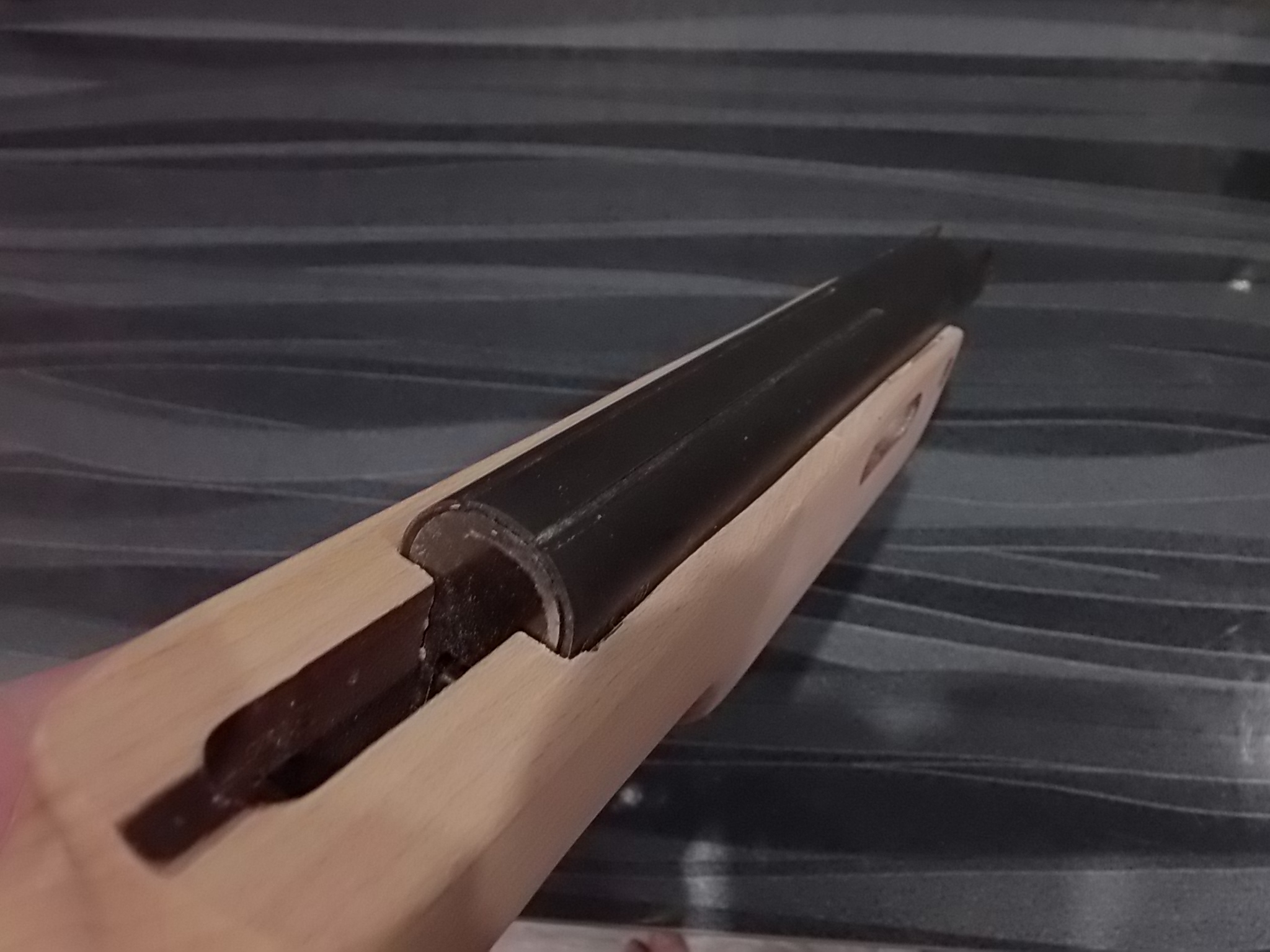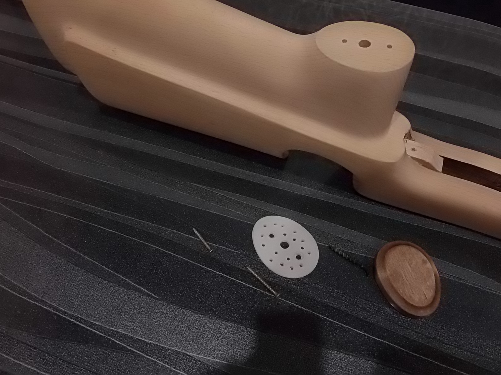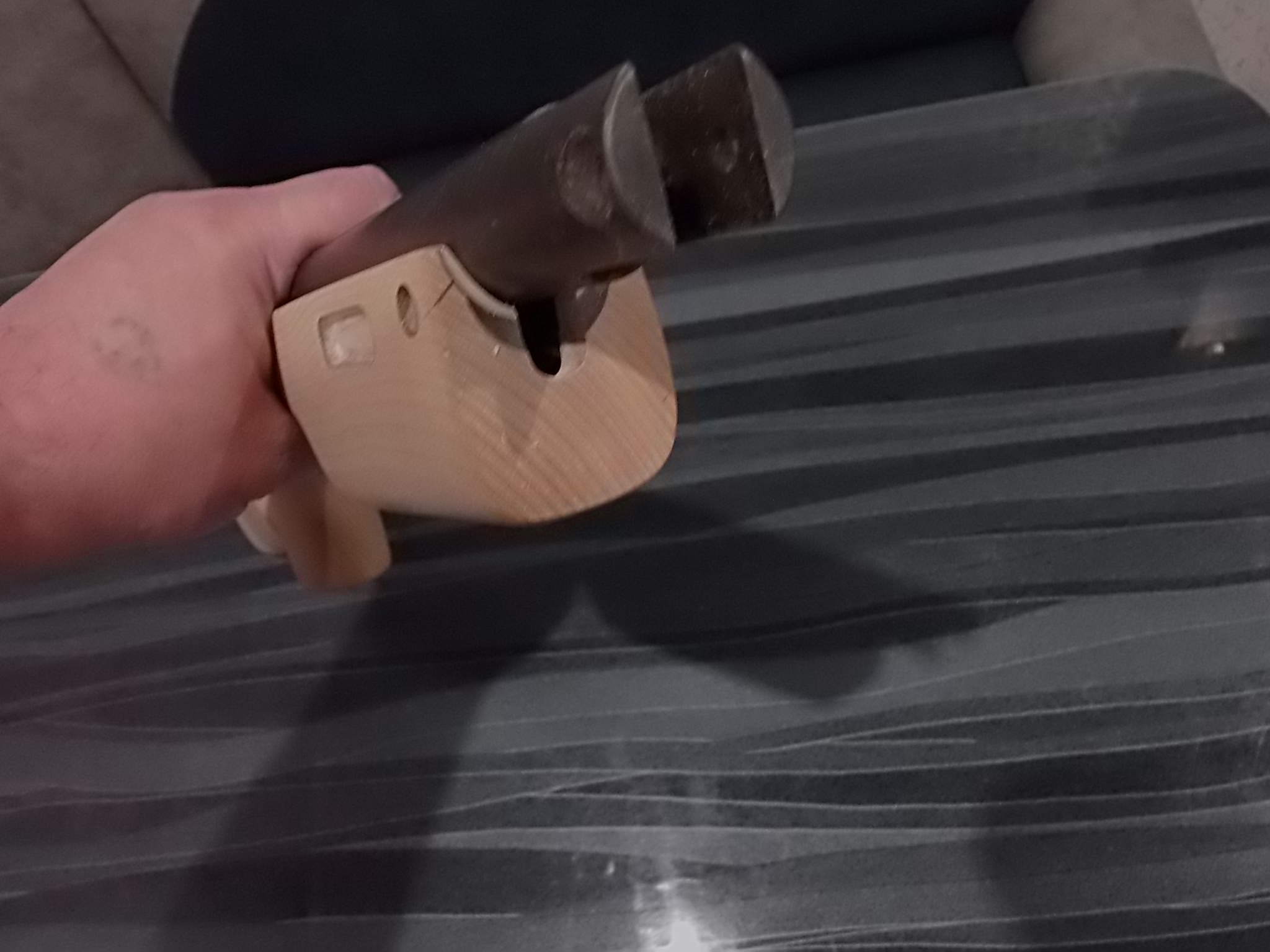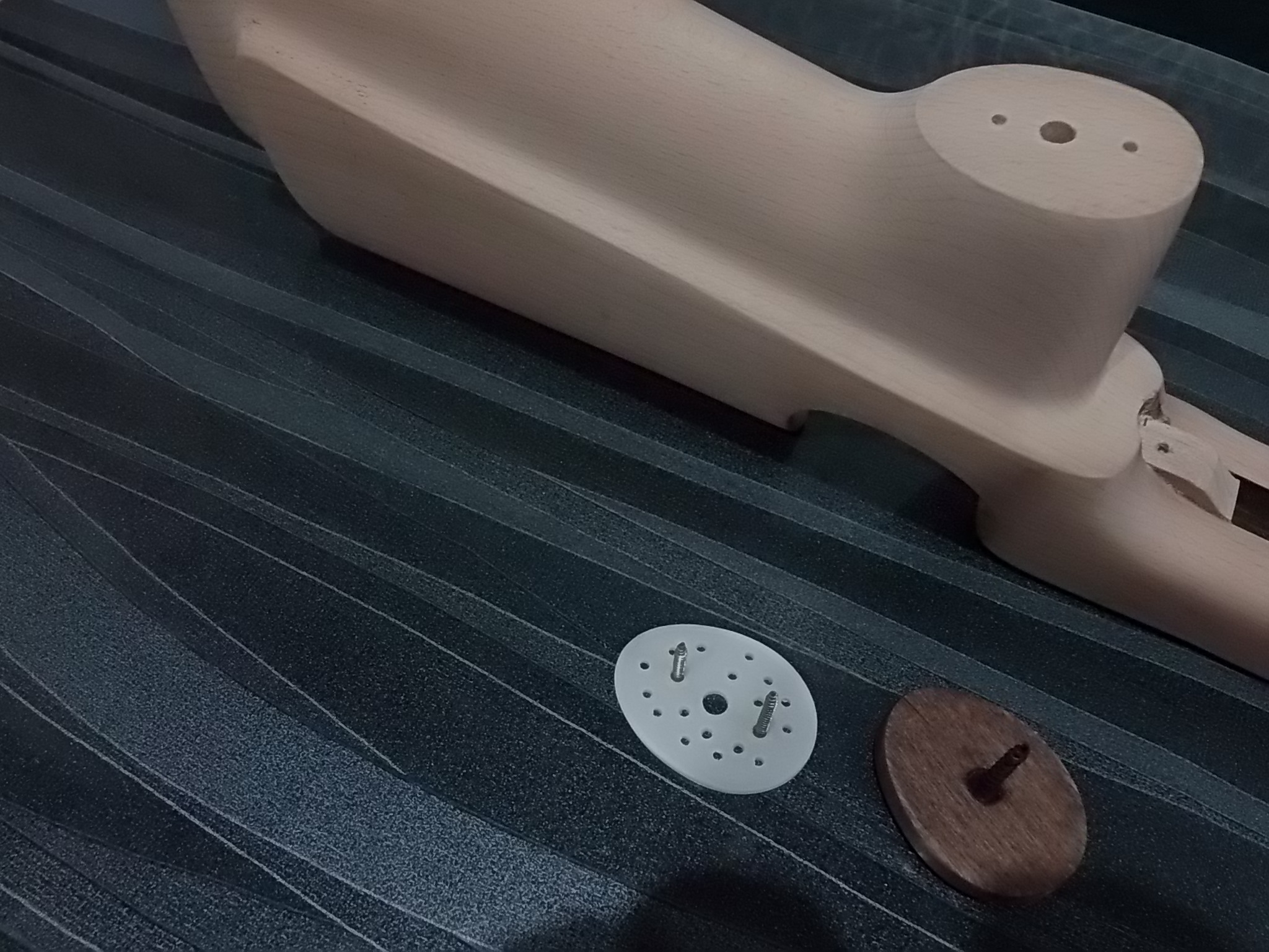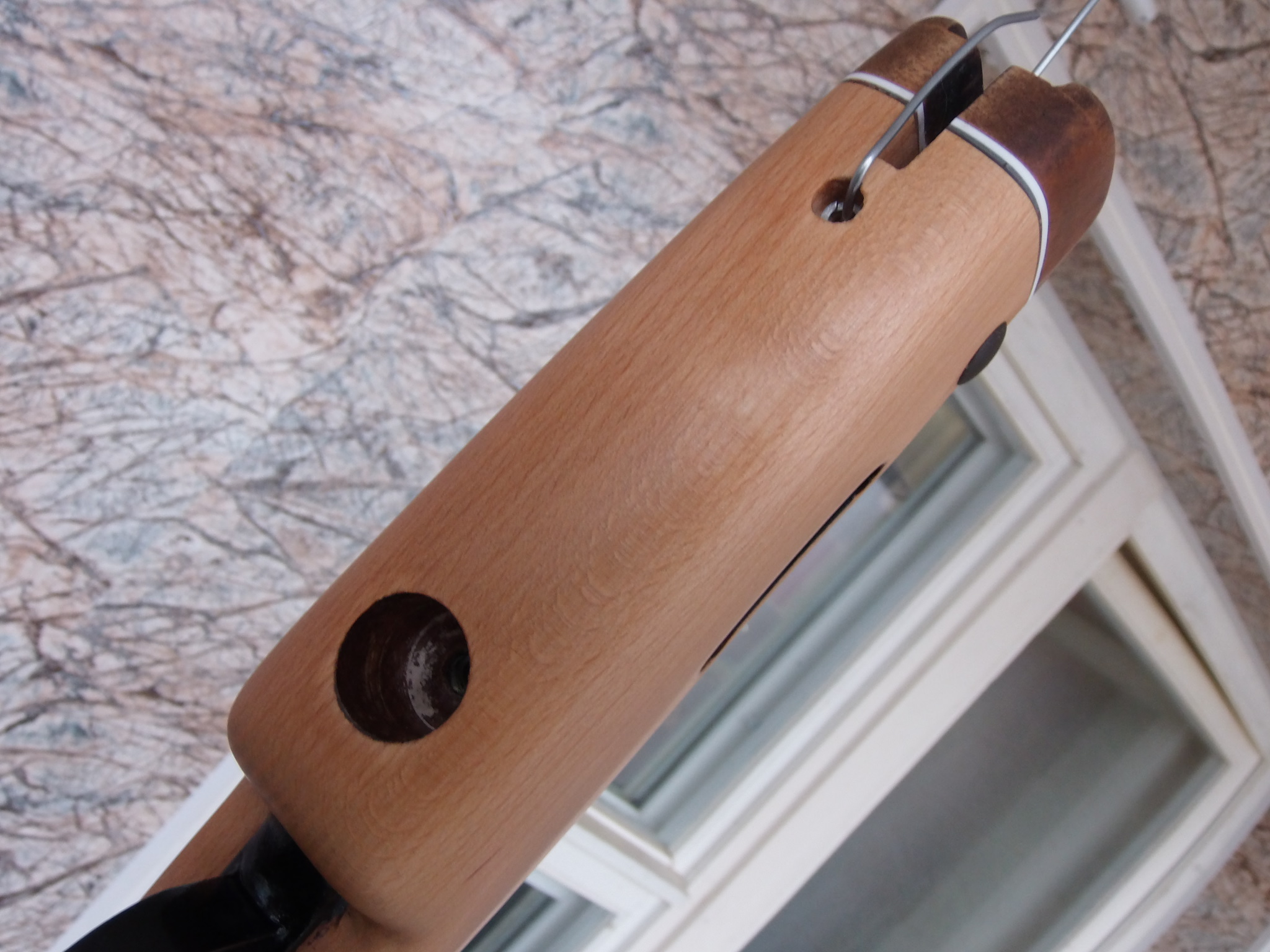 Решено было доработать рукоять прокладкой с чёпиком.Прокладку сделал из пластмассы,подогнал под рукоять,затем из груши сделал чёпик по ней.Думалось что оставлю именно так,но позже решил окрасить его в чёрный цвет матовый.В прокладке сделал два отверстия под саморезы мелкие и в середине отверстие диаметром 8мм для крепления чёпика. В самом чёпике с внутренней стороны сделал неглубокое отверстие,в это отверстие вклеил на ЭДП саморез шляпкой вниз.Основание рукояти намазал ЭДП,притянул прокладку на 2 самореза к ней.Хаотично насверленные отверстия в прокладке для лучшего схватывания ЭДП с ней и чёпиком.Выдавленный клей заполнил их наполовину.Остальное должно было заполниться клеем с чёпиком. Кроме этого в среднее 8мм отверстие также нужно было накапать ЭДП и вставить чёпик вклеенным саморезом в это отверстие,прижать.Застывший ЭДП надёжно удержит так чёпик в рукояти.Чёпик был вклеен позже после покраски его матовой чёрной краской,хотя по совести чуть-чуть потом пожалел об этом.Лучше пожалуй было бы оставить его так.Но что сделано-то сделано.Примерно то,что описал выше:
