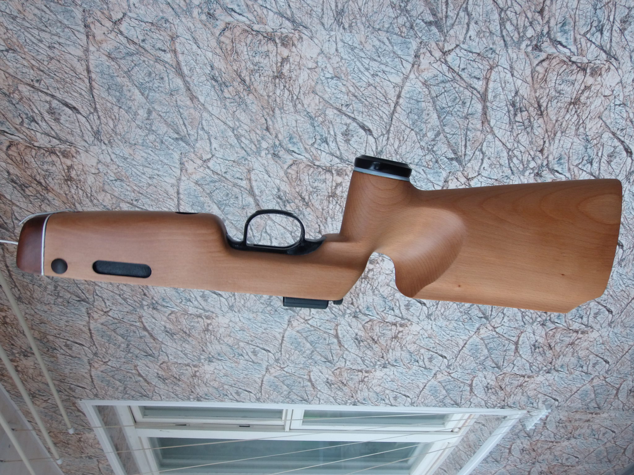 Примерившись «железом» понял-высоту нужно немножко уменьшить,буквально 10мм необходимо было удалить с верхней плоскости ложи.Спусковой крючок недостаточно хорошо торчал снизу.Соответственно и щека приклада тоже была доработана ниже.Немножко под большой палец подогнал шейку приклада-очень мне удобно именно так удерживать винтовку-охватить 3 пальцами рукоять,а большой просто упереть в шейку за компрессором.