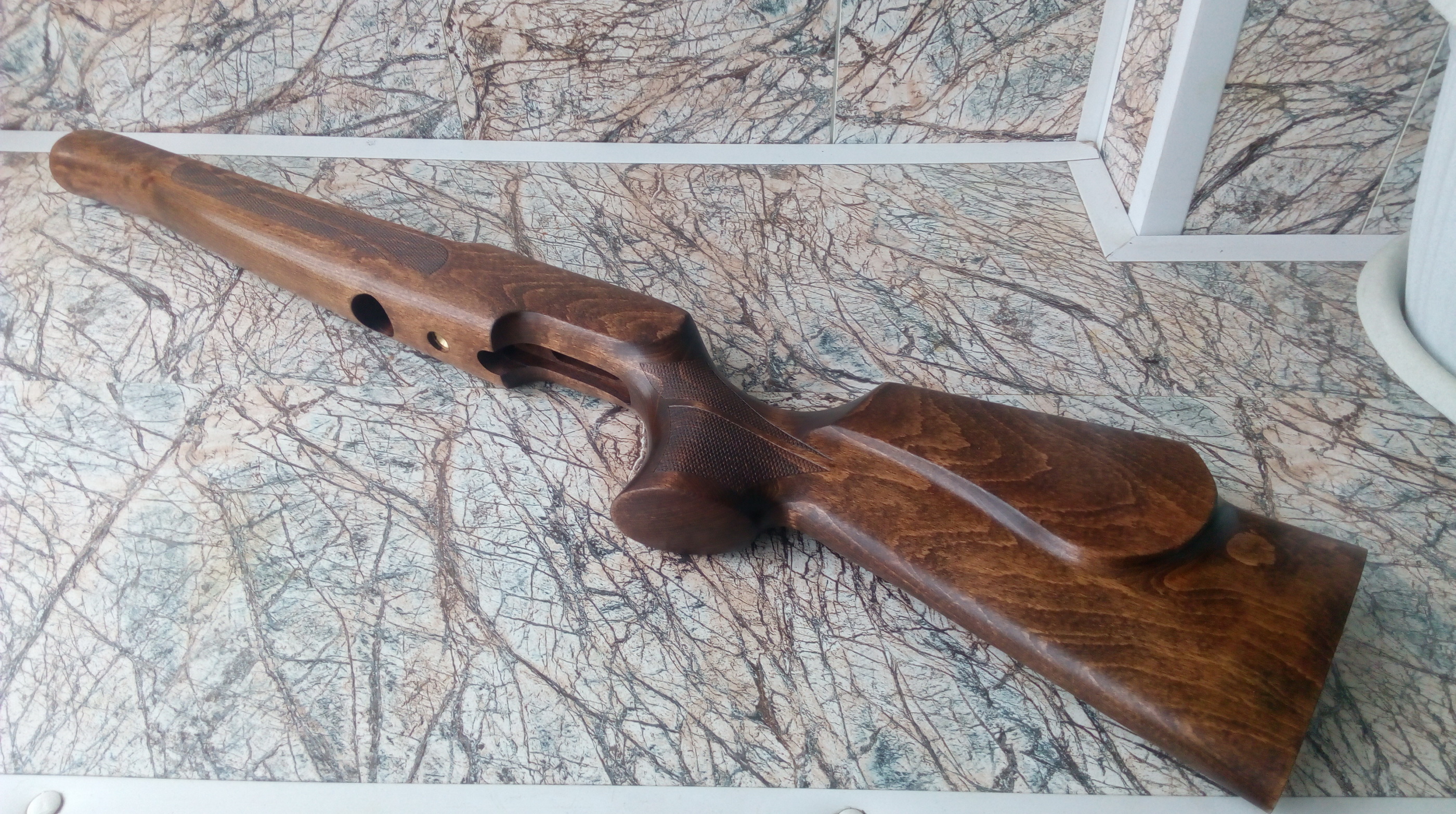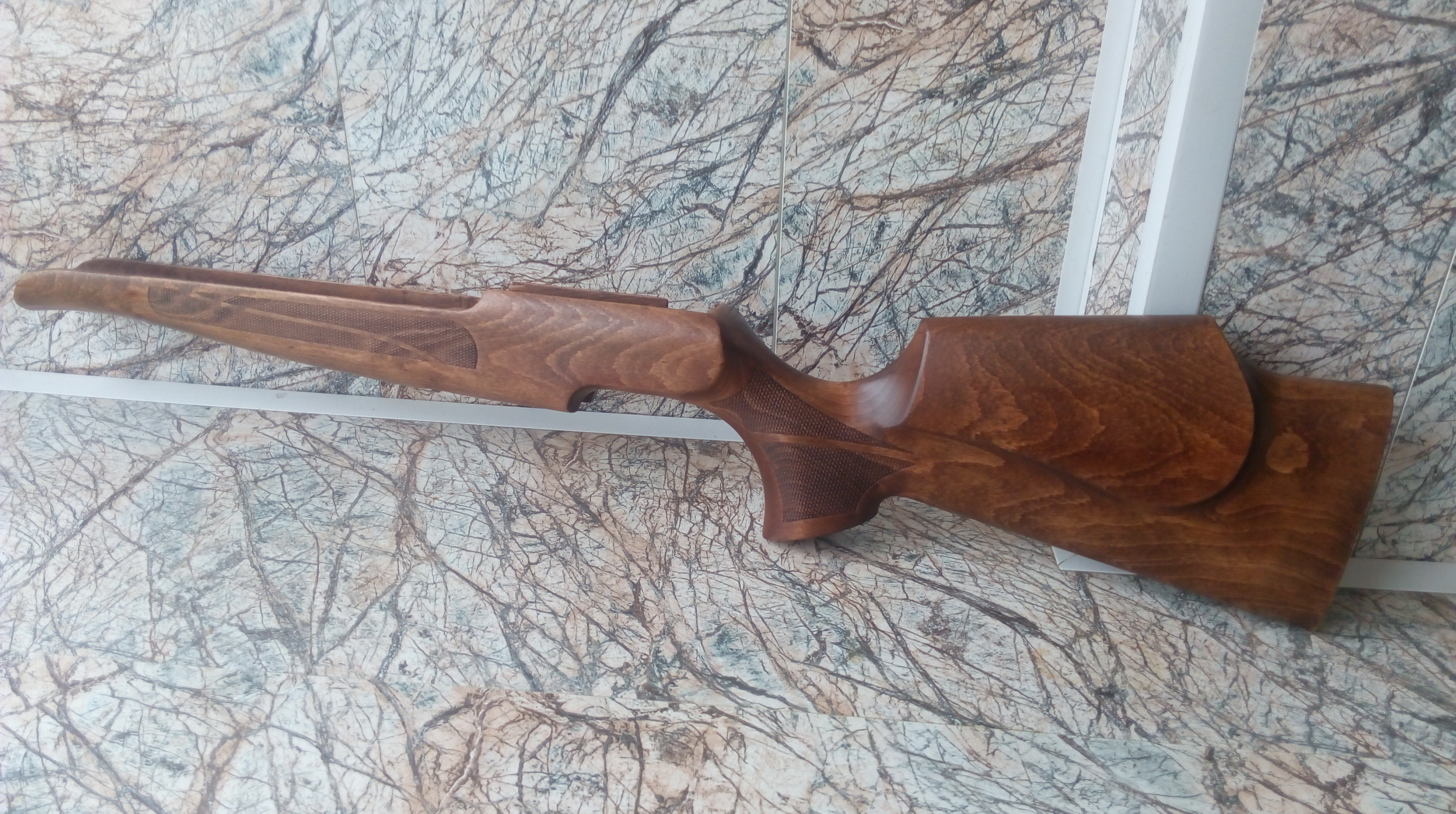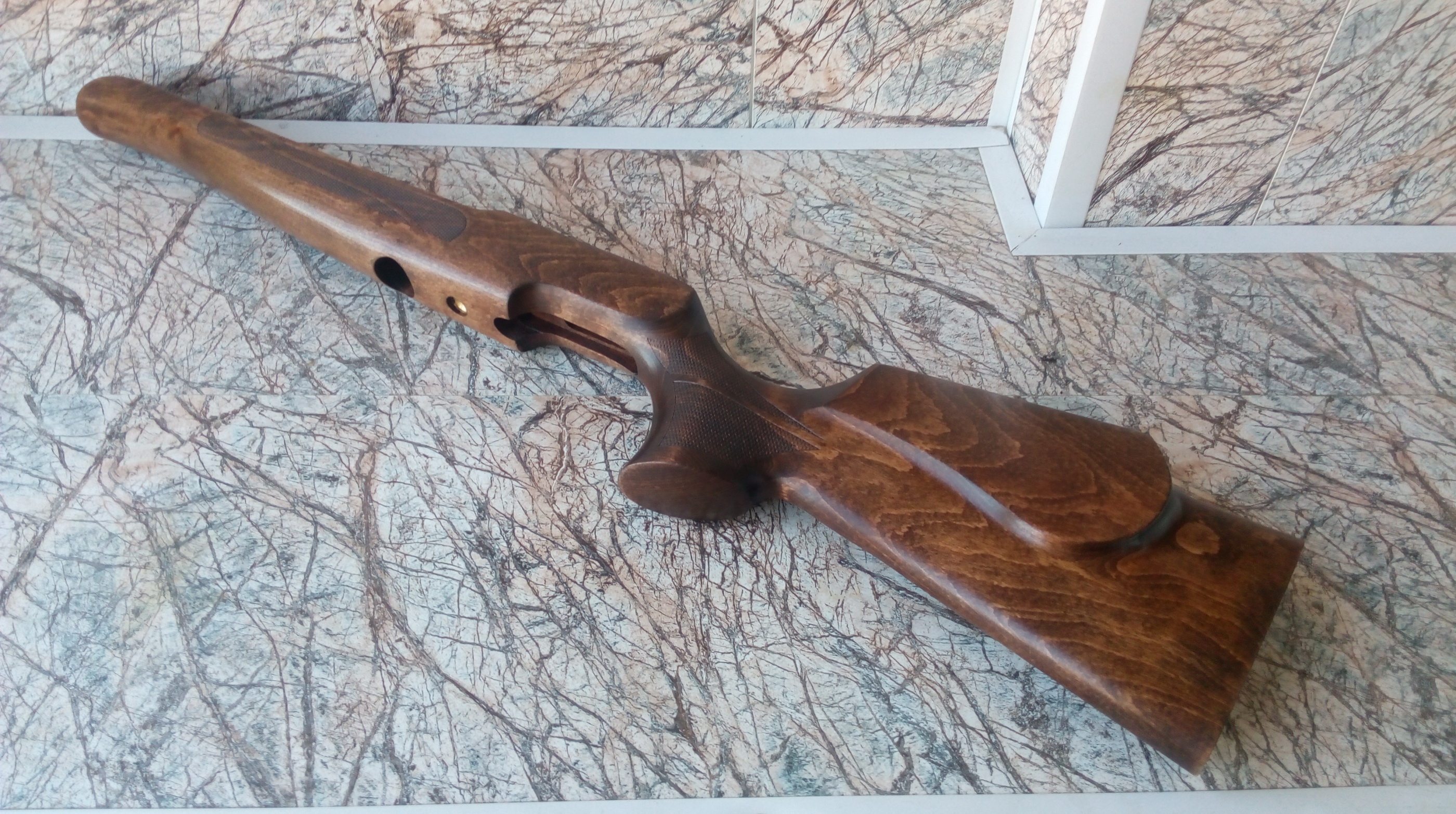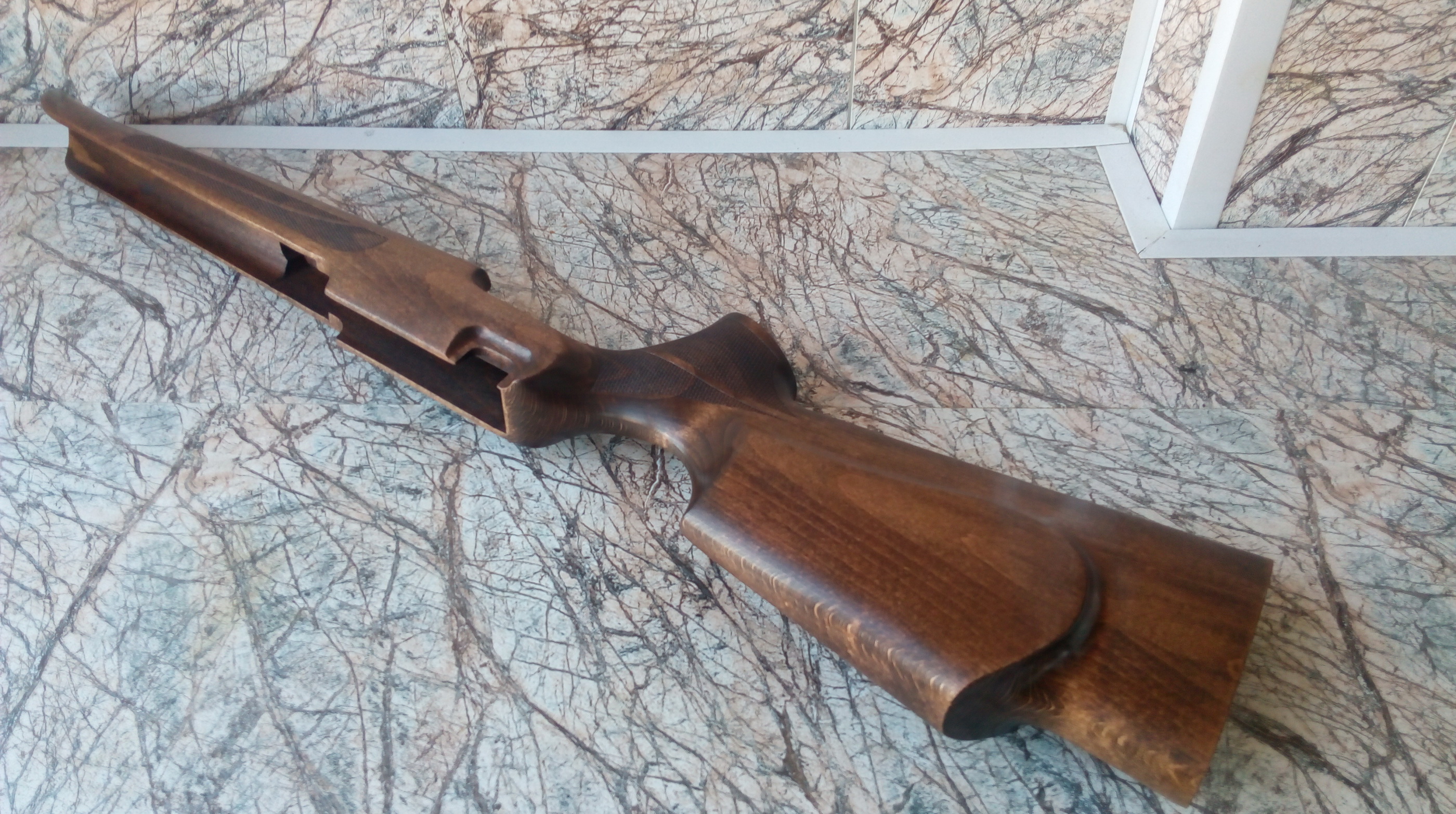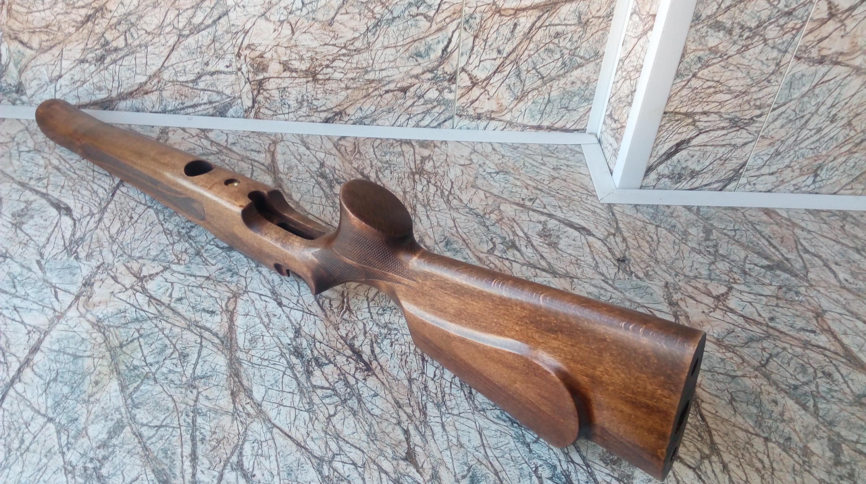 Прежде всего окрасил ложу морилкой водной "Дуб",добавив немного "Палисандра". Владельцу как и мне нравятся ложи более класического цвета. Окрашивал с помощью тряпочки-т.е. ложу натирал смоченной в морилке и хорошенько отжатой тряпкой. Сделал два подхода,не ожидая полного высыхания,взял чистую мягкую тряпочку и смочив в гор.воде,хорошенько отжав,растёр нанесённую морилку. Это помогает удалить лишнюю морилку,разводы,открыть лучше текстуру дерева тем самым и сделать цвет более равномерным. После по высохшей ложе прошёлся "Миркой" с зерном 2000-2200. Дерево стало едва ли не зеркальным. Вот таким: Теперь можно было приступить к пропитке. Применялось масло льняное отбеленное в этих целях. Натёр несколько раз ложу-дерево охотно питало масло,потому не жалел его. Немного дал в подвешенном состоянии деревяшке напитаться маслом. И после растёр ложу мягкой тряпочкой,отправил на трёхдневную сушку в подвешенном состоянии в тёмной кладовке. Вот высохший первый слой: Как видите текстура стала уже более отчётливой в сравнении после нанесённой морилки. С периодичностью в сутки нанёс ещё два слоя. Третий в принципе можно было и делать,но сделал. В итоге уже такой оттенок приобрела ложа: Далее пришло время Дэниш Ойл. Был остаток как раз на одну ложу-цвет неопределённый,смесь масел Дэниш. Там и светлый и тёмный орех+чёрного ореха немного. Наносится равномерно растирая на 30 минут,затем той же тряпочкой чуть оживляется нанесённое масло. Оставляем на 15 минут ещё и после чистой мягкой тряпочкой хорошенько растирается деревяха. Надо убрать все подтёки,разводы,оставленные пальцы обязательно! Т.е. практически насухо растереть ложу необходимо! Первый слой нужно также посушить пару-тройку дней. Так первый слой Дэниш Ойл сработает на манер грунтовки-закристализуется в порах и последующие слои постепенно будут приносить полуглянец. Вот после первого слоя Дэниш ложа: Как видите текстура после этого масла стала ещё красивее и выразительнее. Было сделано ещё 3 прохода-по одному в сутки. Технология такая же как и с первым слоем.Последний слой нужно основательно высушить не менее 4-х дней! И после этого вот такой оттенок имела ложа "Крала": А теперь шерстяной старый шарф и хорошенько необходимо натереть пропитанную ложу. Ну чтобы добиться приятного бликования. Ну конечно! Не должна быть ружейная ложа как скрипка Страдивари. Но какую-то элегантность должна и она иметь. Верно? Ну и вот-покрасивше стала палочка: Ну и в таком вот виде ложа была отправлена владельцу на дополнительную полировку и окончательную сборку. В общем и целом думаю он остался доволен итогом,лично мне итог понравился. Особенно когда увидел "Крал" в сборе. Вот собственно и финальные фото-дома и на свежем воздухе. Красиво мне кажется и практично: