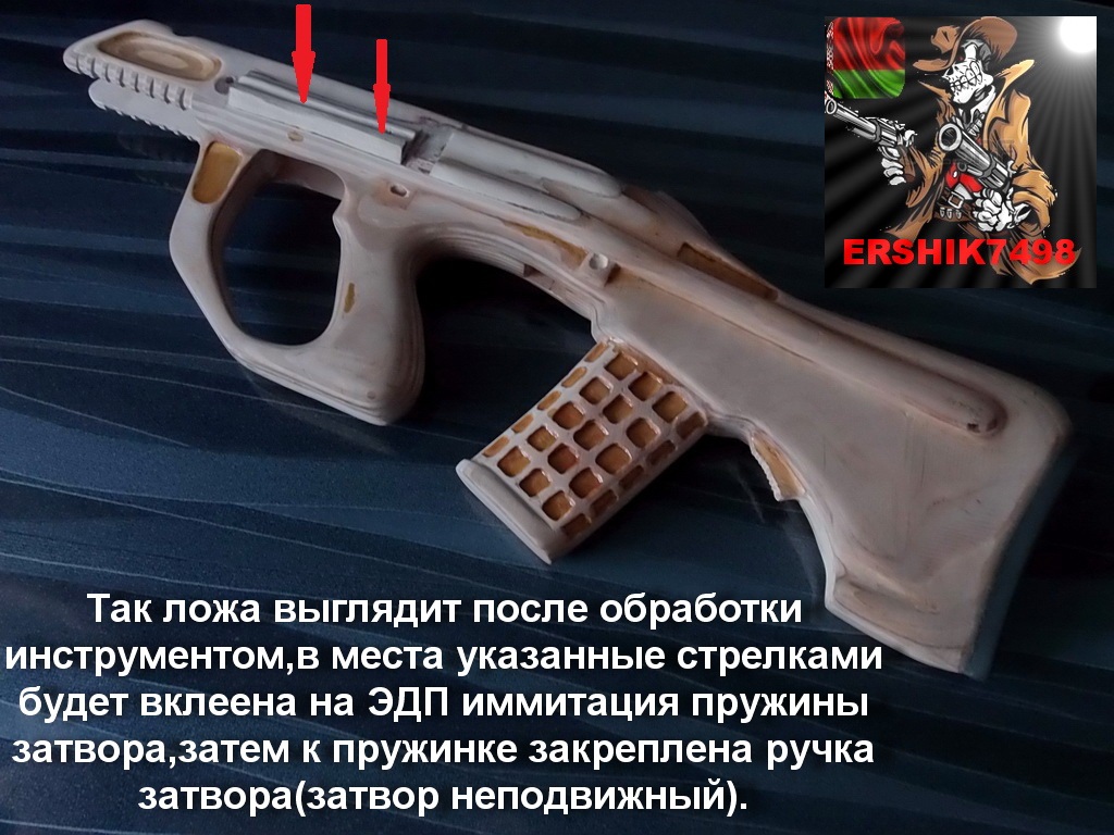 Затыльник на приклад сделал из плотной резины.Позже сделал в нём трёхгранным надфилем риски.Приклеил его на ЭДП и обработал досканально шпаклёвкой для полного слияния его с прикладом:
