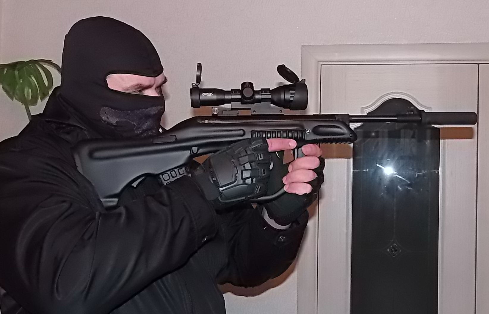 Высохшую ложу нежно натёр мягкой ХБ тканью,изделие просто засияло.Признаюсь-парочка мелких «косячков» есть на ложе(точки меленькие).Чёрт её эту фанеру знает-зачищал,вроде всё было идеально,а после грунтования проявились.Но они едва ли заметны,вида как по мне и не портят.Думаю даже не знающий о них и не найдёт.Далее представлю фото готового изделия-мой Хатсан мод 25 Суперчерджер а облике австралийско-австрийской AUG. «Глушитель» делался ещё для предыдущего проекта.Просто достал «железо» со всем обвесом из той ложи и вставил в эту.Фотки наверно не очень-фотографировал сегодня вечером,оптимальных настроек так и не подобрал к фотокамере.Завтра добавлю фото при дневном свете,уверен будет куда лучше,подберу чёрные боковые винты,здесь вкручены оцинкованные,а пока вот: