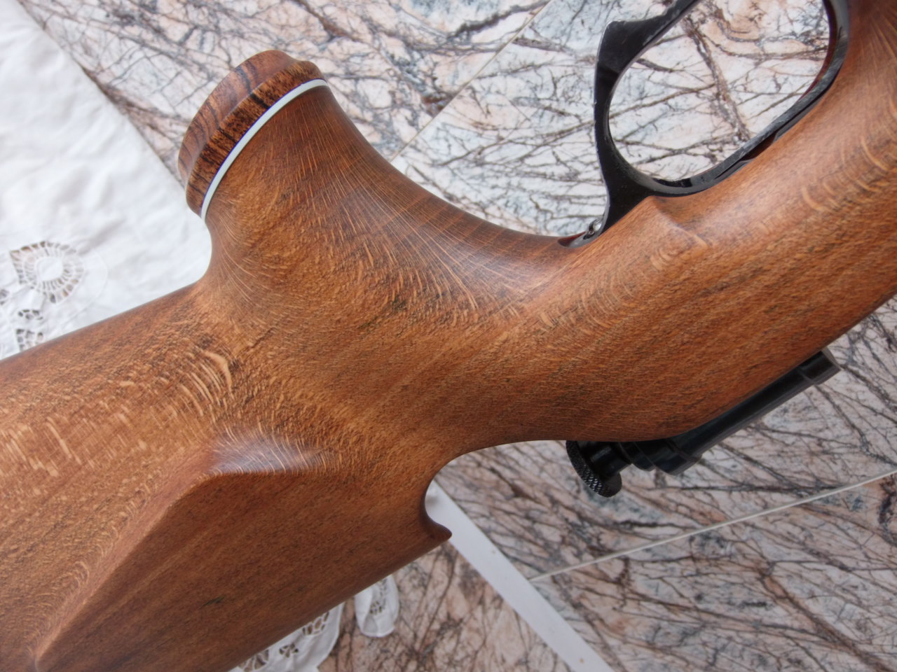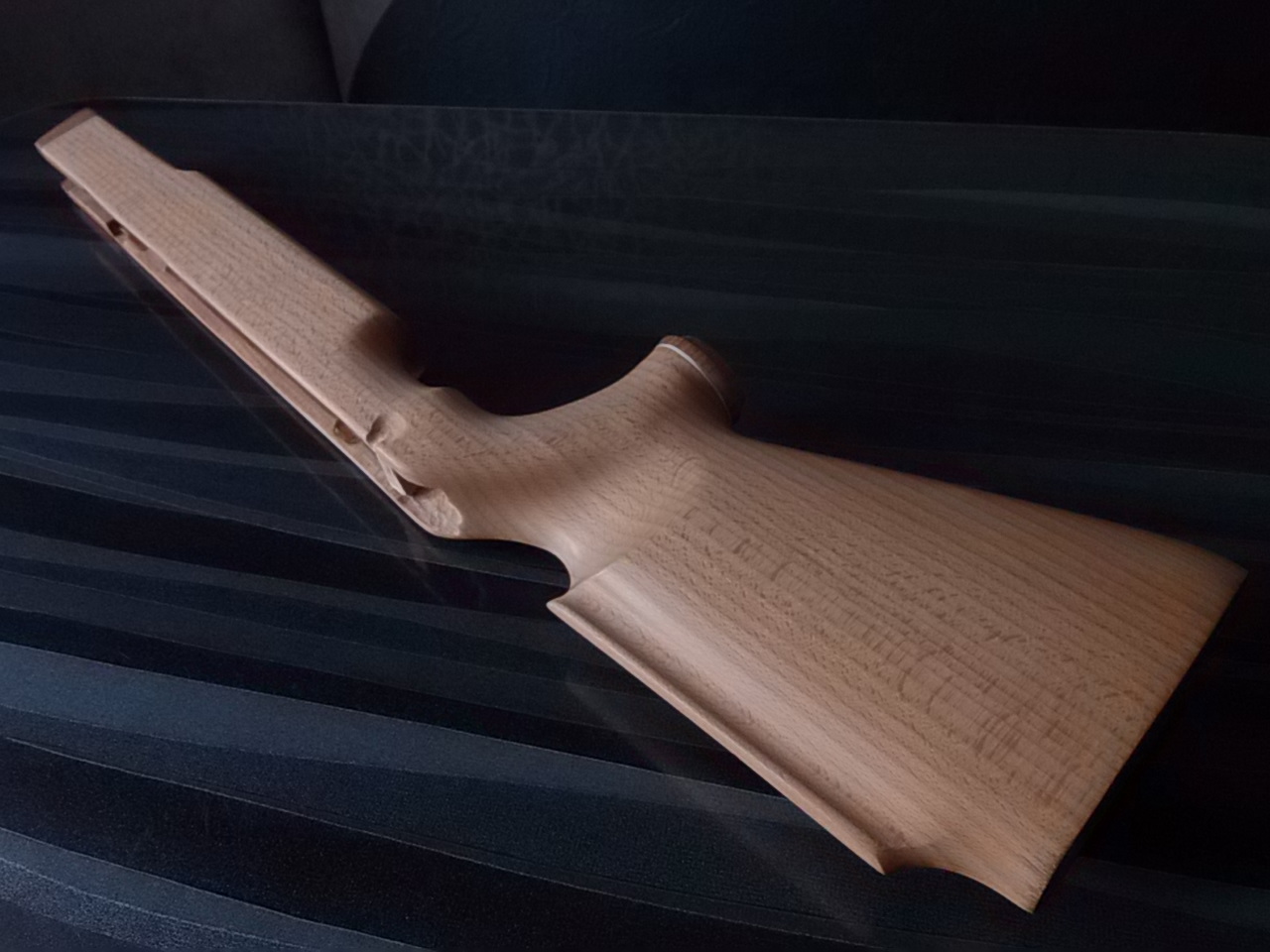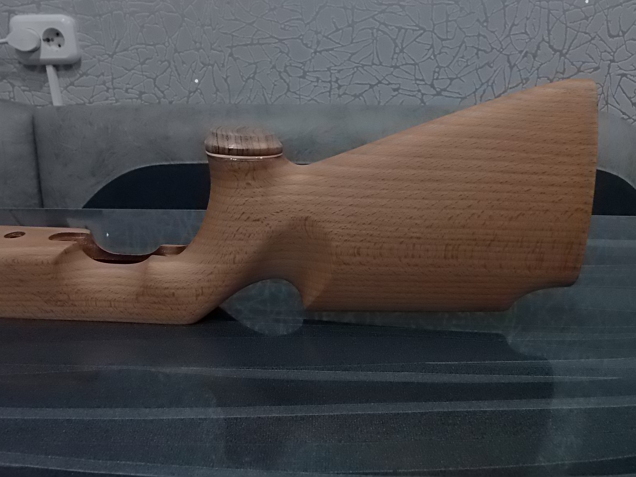Покрытое ржавчиной железо было обильно покрыто аэрозолью WD-40,оставлено на отмокание на сутки.После протёр всё обработанное мягкой тканью,затем обрызгал нейтральным ружейным маслом.Спустя ещё несколько часов протёр всё насухо.Итог-ну практически идеальным стало всё «железо». Ну а к тому времени нашлись некоторые детали в компрессор на замену.Приехали ко мне манжета новенькая с перепуском,пружина новая,стальная телескопическая направляющая /утяжелитель, ну и старенькая ложа от юниорского «Зуля» с затыльником и спусковой скобой.И вот таким стал весь наборчик к «Мурке»: Затыльник был в не полном комплекте.Требовалось его доработать.О этом чуть позже,а сама ложа была вот в таком неприглядном состоянии: Выборка родная конечно же «Мурке» не подходила.Потому кроме внешнего апгрейда,требовалось адаптировать ложу «Зуль» под нашу «МР-512». Ну и конечно же внести некоторый «марафет» в сие изделие: Первым делом всё было обработано шкурками разной зернистости на оправках. Скажу честно-на этот раз попотеть пришлось изрядно,очень не хотелось ей легко отшкуриться.Материал ложи-бук. Что самое интересное-заготовка для ложи каким-то немцем была выбрана едва ли не симметричная.Будто именно середина бревна букового была выпилена в брус (доску) для этой ложи.В общем отшкурил: Обработал далеко не на чисто-это не требовалось,так как работы с клеями ещё предстояло,счищать его впоследствии нужно было бы снова.Порадовало,что кроме прямолинейной текстуры вскрылись характерные для бука мелкие тёмные риски и тигровые вкрапления.После пропитки это как бы обещало дать красивую и интересную «палку-буратинку».К слову не ошибся!!!Ну о этом будет ниже…