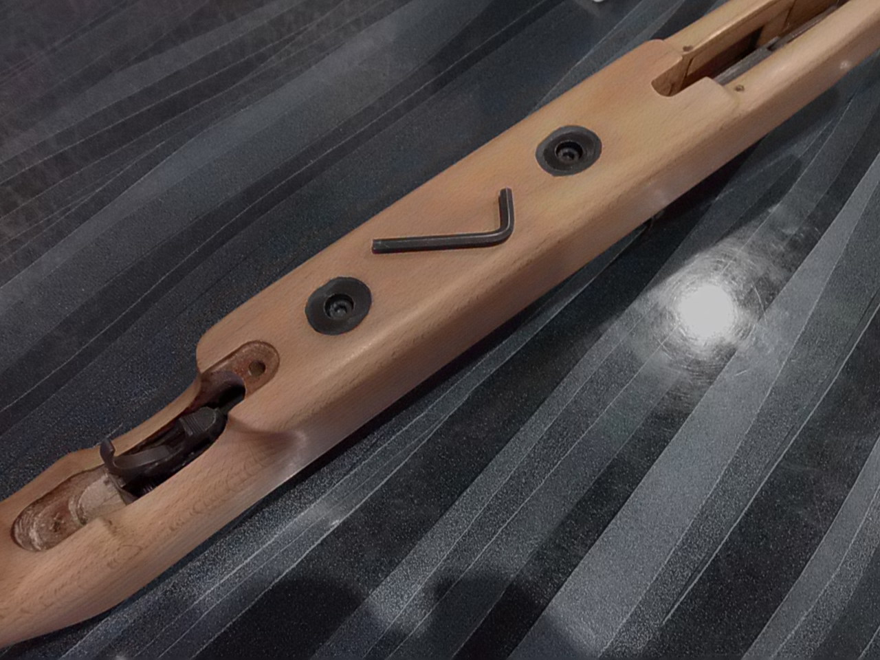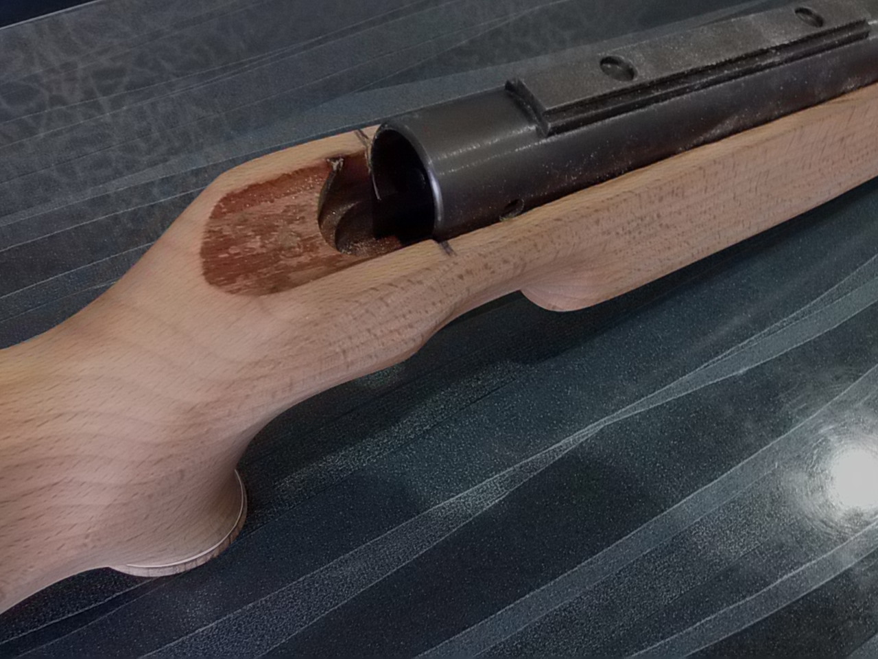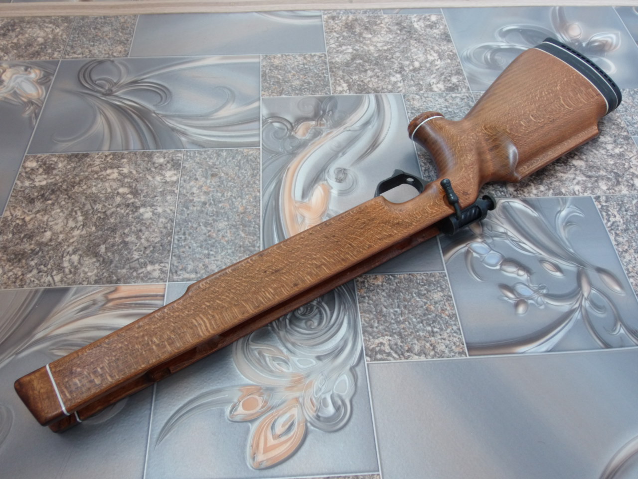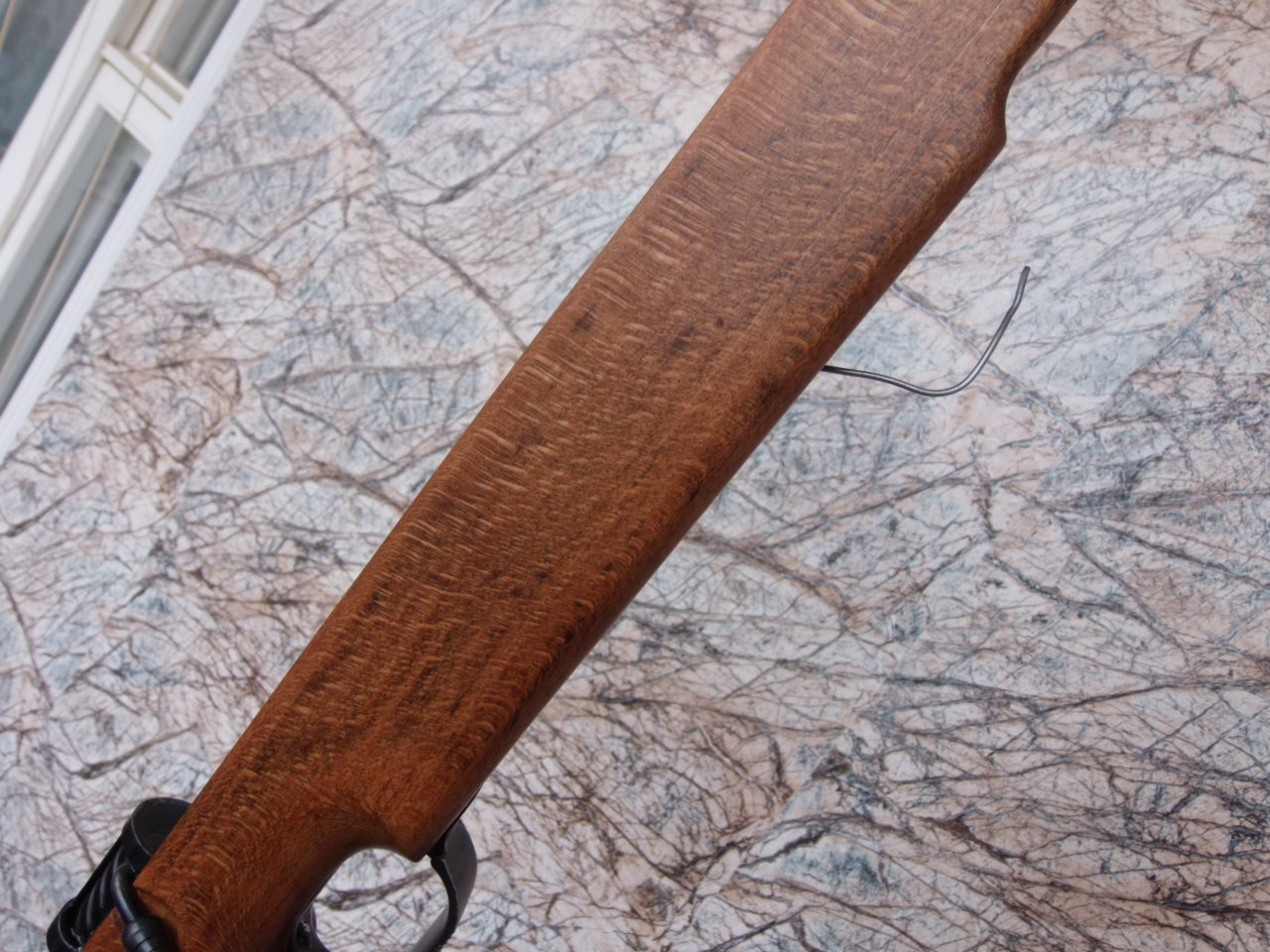 Покрытое ржавчиной железо было обильно покрыто аэрозолью WD-40,оставлено на отмокание на сутки.После протёр всё обработанное мягкой тканью,затем обрызгал нейтральным ружейным маслом.Спустя ещё несколько часов протёр всё насухо.Итог-ну практически идеальным стало всё «железо». Ну а к тому времени нашлись некоторые детали в компрессор на замену.Приехали ко мне манжета новенькая с перепуском,пружина новая,стальная телескопическая направляющая /утяжелитель, ну и старенькая ложа от юниорского «Зуля» с затыльником и спусковой скобой.И вот таким стал весь наборчик к «Мурке»: Затыльник был в не полном комплекте.Требовалось его доработать.О этом чуть позже,а сама ложа была вот в таком неприглядном состоянии: Выборка родная конечно же «Мурке» не подходила.Потому кроме внешнего апгрейда,требовалось адаптировать ложу «Зуль» под нашу «МР-512». Ну и конечно же внести некоторый «марафет» в сие изделие: Первым делом всё было обработано шкурками разной зернистости на оправках. Скажу честно-на этот раз попотеть пришлось изрядно,очень не хотелось ей легко отшкуриться.Материал ложи-бук. Что самое интересное-заготовка для ложи каким-то немцем была выбрана едва ли не симметричная.Будто именно середина бревна букового была выпилена в брус (доску) для этой ложи.В общем отшкурил: Обработал далеко не на чисто-это не требовалось,так как работы с клеями ещё предстояло,счищать его впоследствии нужно было бы снова.Порадовало,что кроме прямолинейной текстуры вскрылись характерные для бука мелкие тёмные риски и тигровые вкрапления.После пропитки это как бы обещало дать красивую и интересную «палку-буратинку».К слову не ошибся!!!Ну о этом будет ниже…