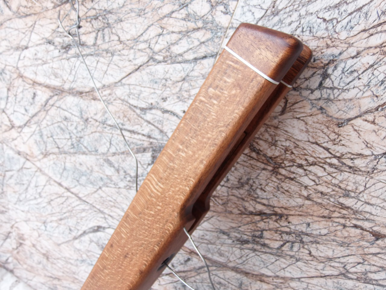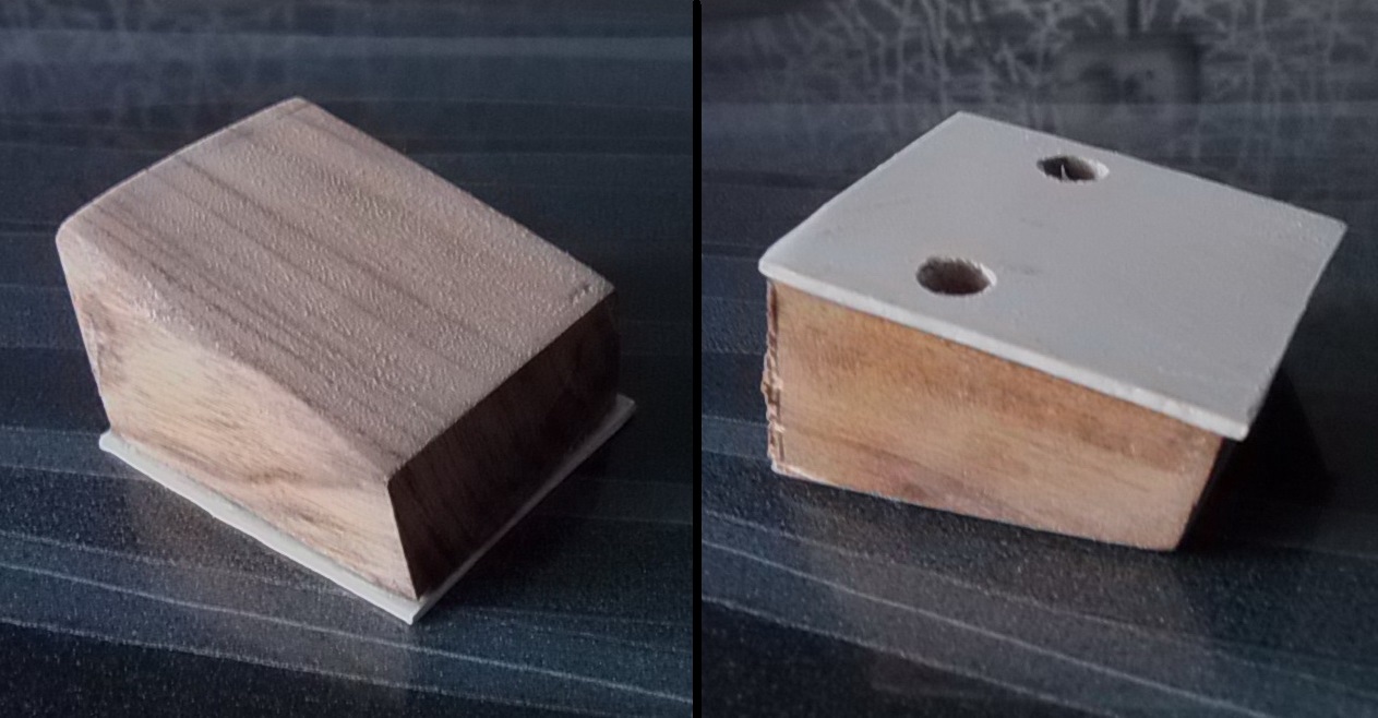 Теперь нужно было изготовить недостающий в комплекте целик.Опять помог Иван-колодку под него он мне отыскал.Сам же целик планировал применить от «ИЖ-40», но примерив понял-не то,что нужно! Порыскал по своим сусекам и отыскал целик от «Кандар»,присланный на поделки как-то Павлом (1Паша1).Вот его и решил применить. Снял с колодки сам целик,немного нос его отпилил,подработал надфилями.Сделал в колодке крепёжное отверстие для этого целика.На этой же колодке «хол.сваркой» залепил и после высыхания аккуратно обработал выборку под цилиндр с целиком,предусмотренный для установки родного ижевского целика.В серединке сделал небольшой паз надфилем плоским для посадки на колодку кандаровского целика.На ЭДП его к ней приклеил,завернул крепёжный винт,снизу замазал пустоту той же «хол.сваркой».Возможность горизонтальных поправок была сохранена-целик не касается задней стенки колодки.По вертикали целик регулируется стандартным верхним винтом с круглой рифлёной «шляпой». Когда примерил целик по месту и всё мне вполне понравилось-установил на казну и зафиксировал штифтом,сделанным из хвостовика свёрлышка.Задний винтик в колодке также работает.После внесения горизонтальных поправок,можно зафиксировать целик им тоже: Попутно немного доработал и ствол.Фаской на дульном срезе,как водится у «ИЖМЕХ» даже не пахло.На токарном станке легонько отторцевал,сделал далее аккуратную лёгкую фасочку.Резьбу на конце ствола М12Х1 также поправил после резца.Примерно так,может рассмотрите что: По состоянию канала ствола нареканий не было-нарезы чёткие,без коцок.Теперь пулька выходила из ствола с чёткими равномерными нарезами,что очень гуд! Далее решено было облагородить рукоять прокладкой с чёпиком.Для него выбрал красивую индийскую древесину-было пару кусочков в «загашнике».Вот такая она в виде дощечек раньше приходила к нам в качестве поддонов с индийским стеклопрутком,их мы и курочили на дощечки.Кто на что: Прокладку сделал из белого пластика от электрокороба,чёпик выпилил и обработал с неимоверным усердием из-за прочности из показанной выше древесины: В середине чёпика сделал отверстие на половину глубины для вклейки самореза шляпкой вниз.В прокладке сделал три отверстия-центральное для того самого самореза.Боковые-для крепежа прокладки к рукояти.Вклеил обезжиренный предварительно саморез в отверстие на ЭДП шляпкой вниз.Лицевая сторона чёпика осталась такой же красивой и не изгаженной отверстиями и клеем.Примерил прокладку на рукояти,отметил отверстия.Просверлил их в рукояти: Специально оставил шероховатыми поверхности чтобы клей лучше впитался в поры древесины.Прокладку обезжирил ацетоном,приготовил два крепёжных маленьких самореза.Приготовленным клеем ЭДП смазал поверхности,наложил прокладку, зафиксировал её к рукояти саморезами.Шляпки заподлицо-накладыванию чёпика не припятствуют: Затем накапал в центральное отверстие ЭДП,намазал клеем основание рукояти и плоскость на чёпике,опустил саморезом в это отверстие,выставил ровно его и зафиксировал вокруг рукояти скотчем. Вот примерно: Застывший ЭДП надёжно удержит чёпик-ПРОВЕРЕНО!!! Вот и застыло.И прокладка, и чёпик были с небольшим припуском для точной подгонки.На фото видно: Снова наждачку в руки-час неспешной работы,и всё слито воедино.Красиво и ровно: Теперь можно было занять