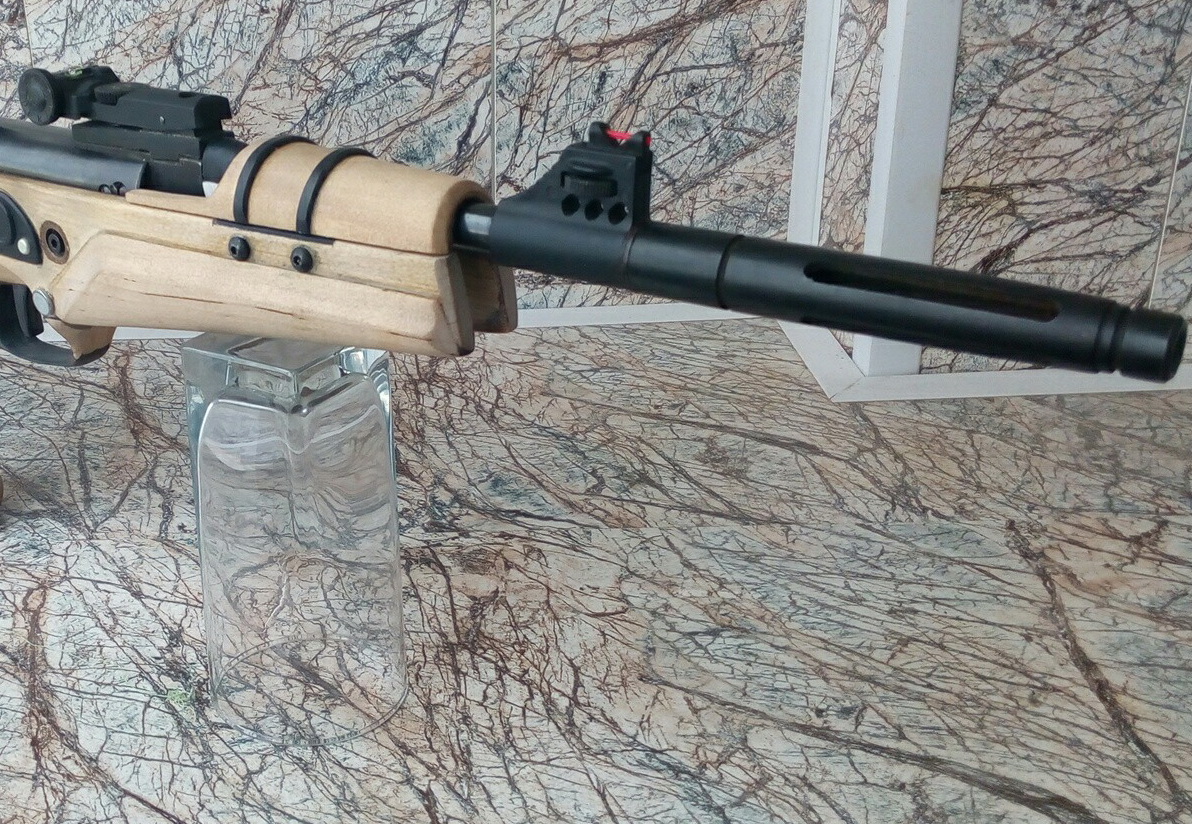 На дульном срезе была сделана аккуратная дульная фаска. На кончик ствола посадил на ЭДП втулку стальную с внешней резьбой М12Х1. Дружище Руслан как-то давно изготовил мне надульник для «Мурки» в стиле дульного тормоза-компенсатора СВД. Вот такой он был: