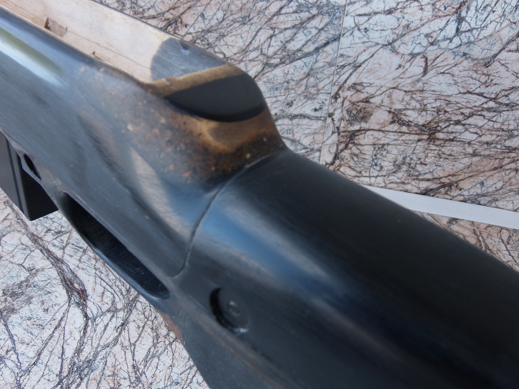 Ну и всевозможными стамесками, ножами, «Дремелем» с разными насадками , удалил я все рёбра с боковин и донышка ложи. Шахту магазина я ликвидировал, вклеив туда ореховую вставку на ЭДП, отверстия залепил шпаклёвкой из ЭДП и метал.опилок. Напилил берёзовых дощечек толщиной 7мм и высотой 35мм. Их необходимо было вклеить на очищенных от рёбер боковинах ложи. Следом собрал ложу на клею+родные стяжные винты. Их также смазывал эпоксидкой перед затяжкой чтобы исключить впоследствии их разбалтывание. Позже на прикладе они были все оставлены в том же виде, а на боковинах ложи я по два винта с каждой стороны зашпаклевал и зачистил-увидите ниже. После тщательной примерки каждой вставки они были успешно вклеены в ложу на ЭДП. Далее сделал выборку именно под «Мурку». Дно ложи было залито после отметки на боковинах нужной высоты смесью ЭДП и деревянных, пластиковых мелких опилок. Вот так отлично садился компрессор в ложе. Обе опоры компрессора комфортно опирались на залитое смесью клея и опилок дно. Т.е. кроме удержания плотного боковинами, компрессор стойко опирался на дно ложи при затягивании крепёжных винтов: