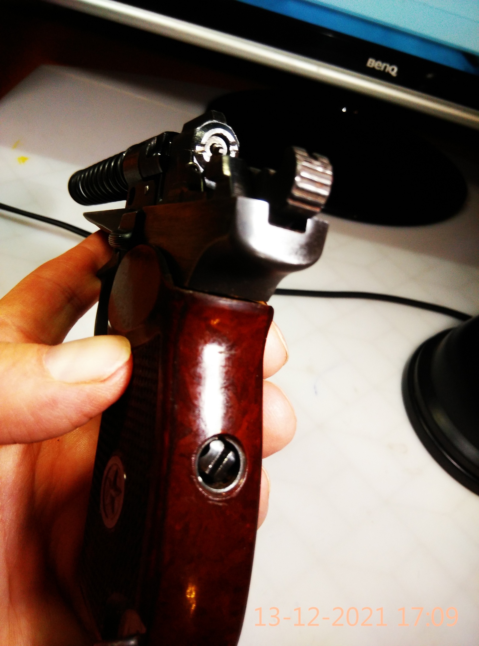 Берем штатный винт крепления рукояти, тем самым, параллельно решаем вопрос аутентичности, и ставим рукоять придерживая БП снизу, за выступ фиксации магазина. Входит на место легко. Ставим штатный винт на его место. Шата нет