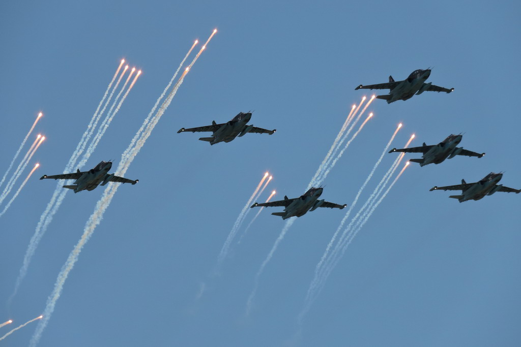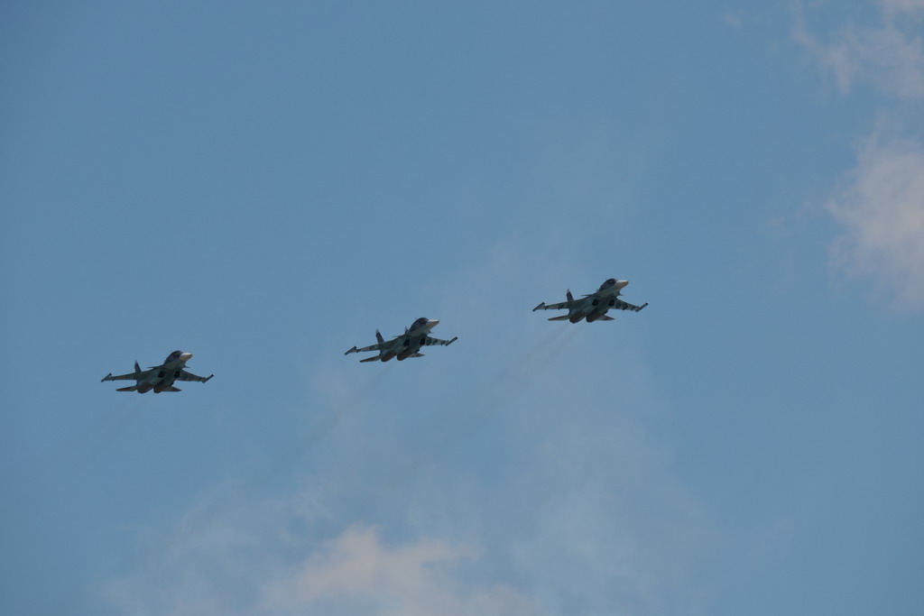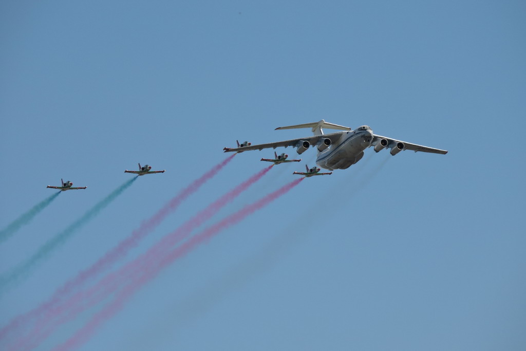 Ну и самая долгожданная и зрелищная часть - воздушный парад :co_ol: . Из того что я не видел - ЯК130 летели и Бомбардировщики ТУ 22 реактивные и ТУ 95 с пропеллерами :co_ol: когда еще в РБ такое увидиш.