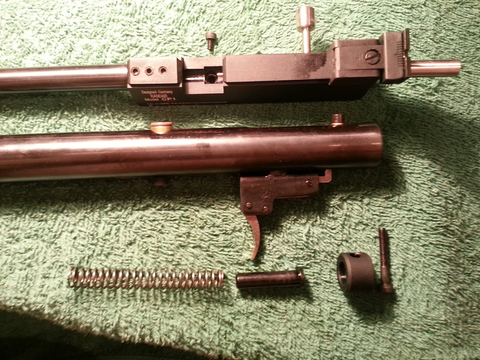 Далее, чтоб снять коробку, выкручиваем сперва болт сзади, он вкручивается в коробку, проходя заднюю пробку насквозь. Достаем пробку, пружину с направляющей. Отводим досылатель и выкручиваем болтик вверху, под казенником. Коробка снята. Пробка и направляющая тоже из алюминия, покрыты анодом. Никакого пластика.