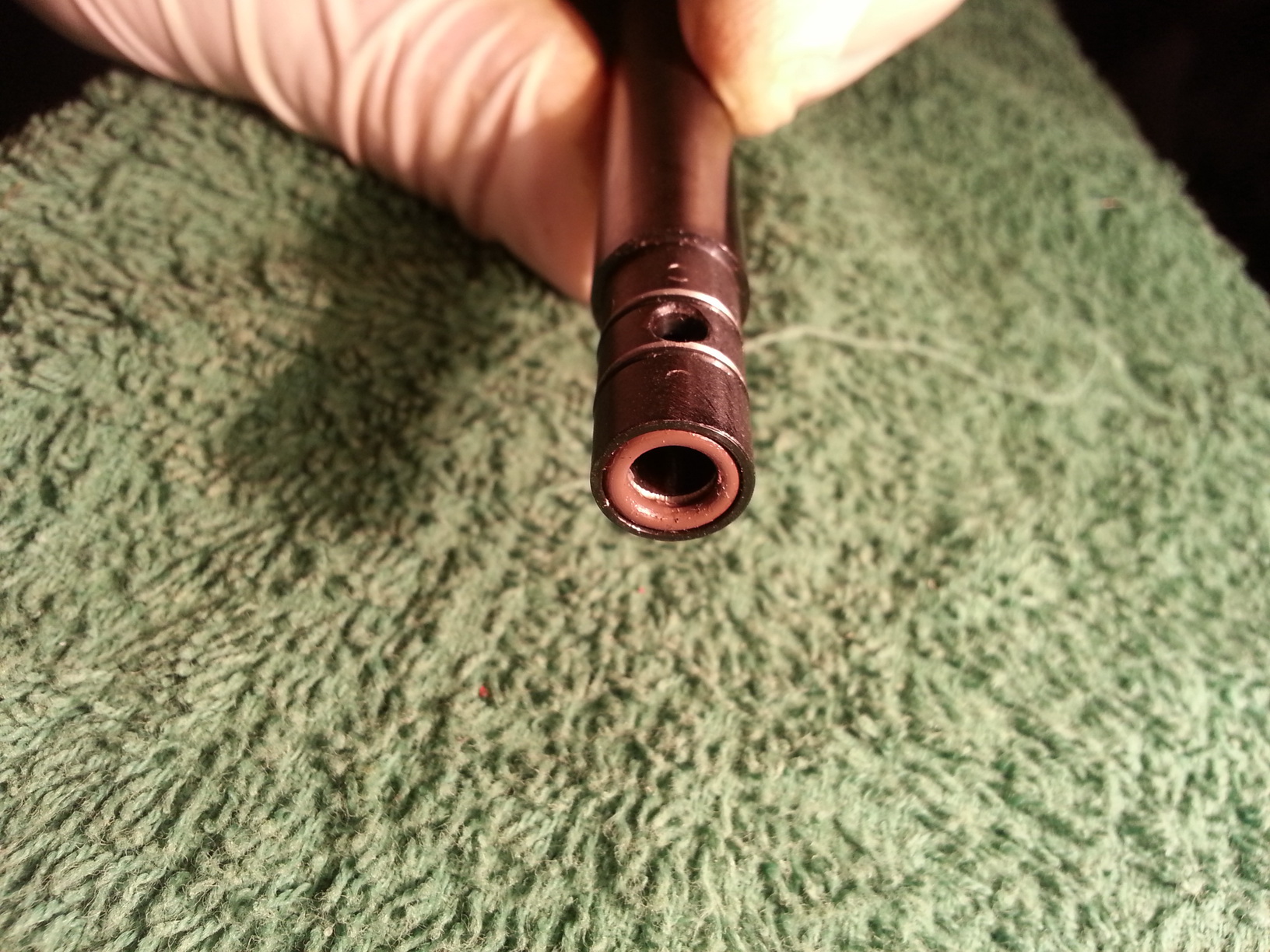 Сделал несколько прогонов - ствол равномерный, без дефектов, нарезает вообще великолепно. Очень неожиданно для бюджетного пистолета. На самом конце толи ЧОК есть, толи это фаска такая корявая.