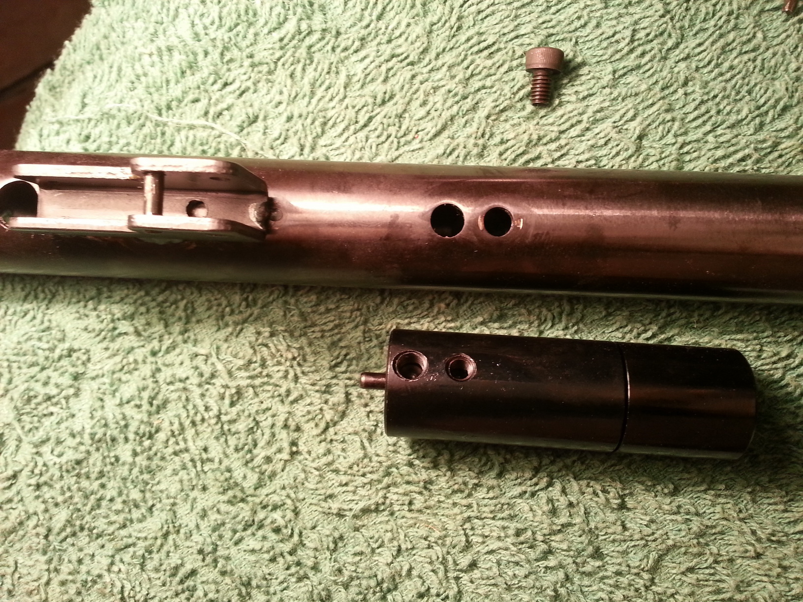 Ствол в коробке держат аж три винта. НО выполняют они разную роль. Два крайних винта выполняют фиксирующую функцию, и открутились от руки. А средний винт оказывается выполняет гермитизирующую функцию, сидя на фиксаторе, и откручивается он тяжело. Потом его закручивать нужно опять же на герметик или фиксатор, ибо отверстие перепуска в стволе, сквозное...