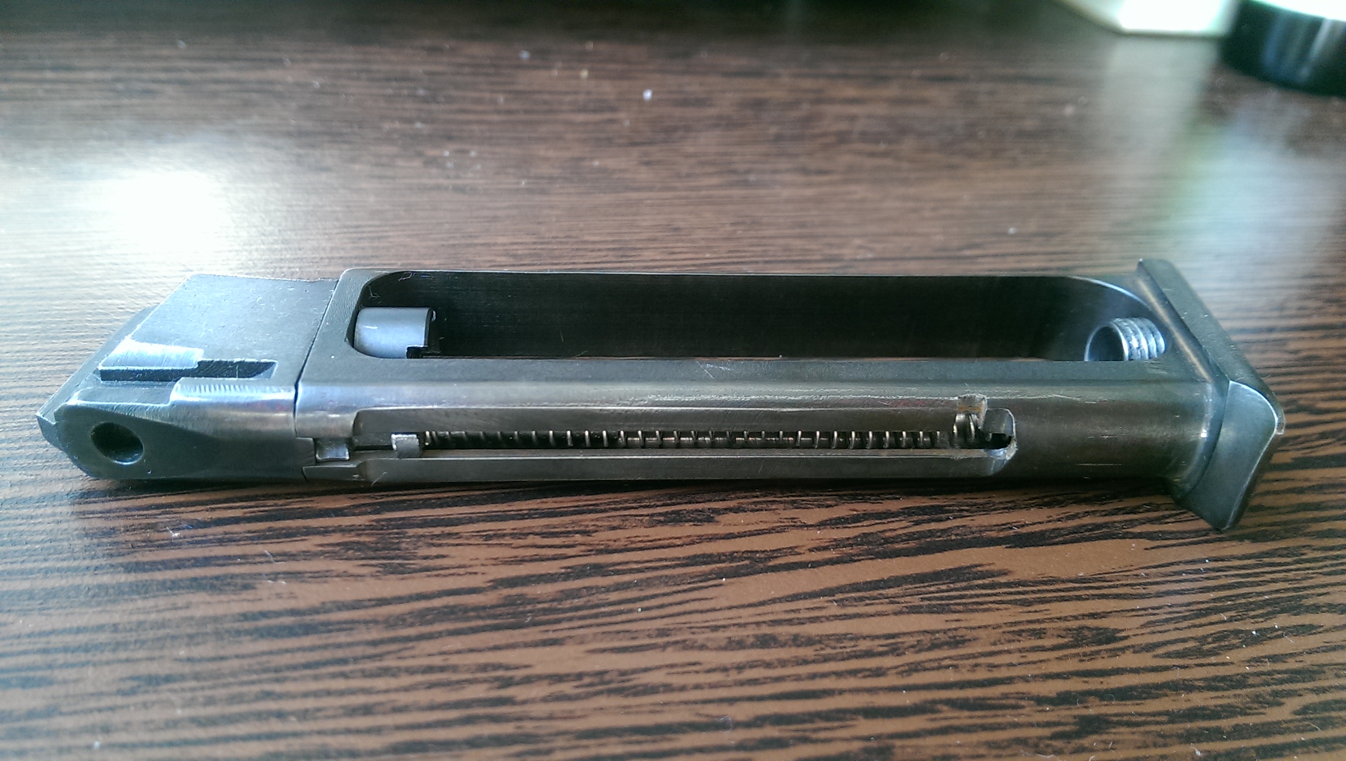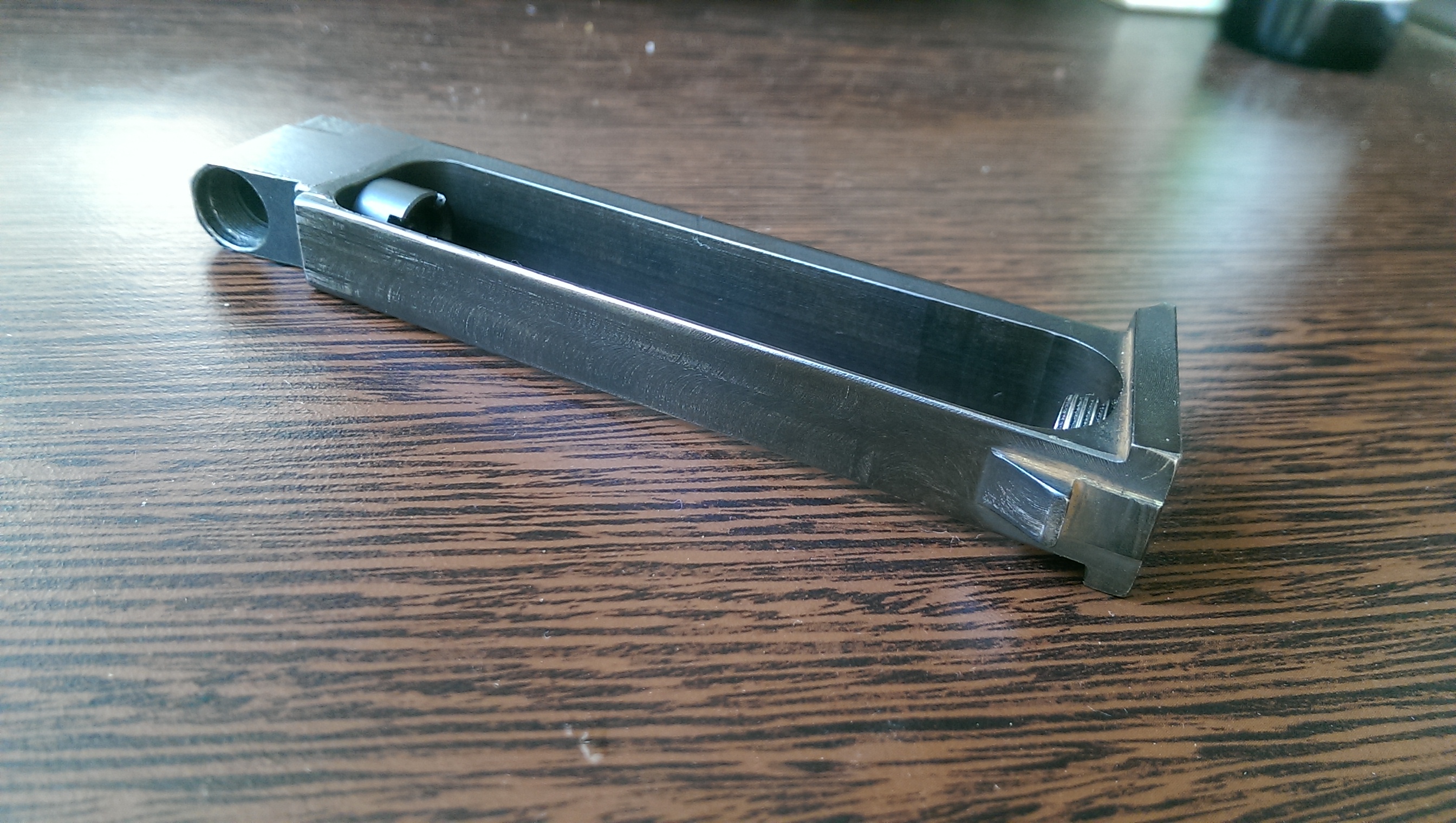 Но я другое хотел тут показать. Обточил болванку магазина, осталось довести наждачкой до блеска и заворонить. Главное, что размеры не нужно корректировать. Маркером отмечал места трения для подгонки.