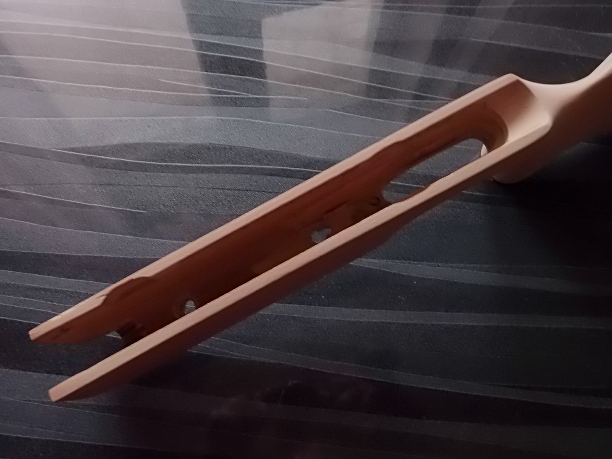 «По умолчанию» ложа имеет разную высоту боковин-в «Зуле» боковой взвод,поэтому правая стенка ниже левой(рычаг взвода над правой боковиной).Первым делом подравнял левую сторону с правой.Это было даже на руку-посаженное в деревяшку «железо» было как раз идеально по высоте к прикладу,к тому же спусковой крючок снизу оптимально сидел. Вот так выглядела выборка на тот момент до моего вмешательства ,а боковины одинаковой высоты уже здесь: