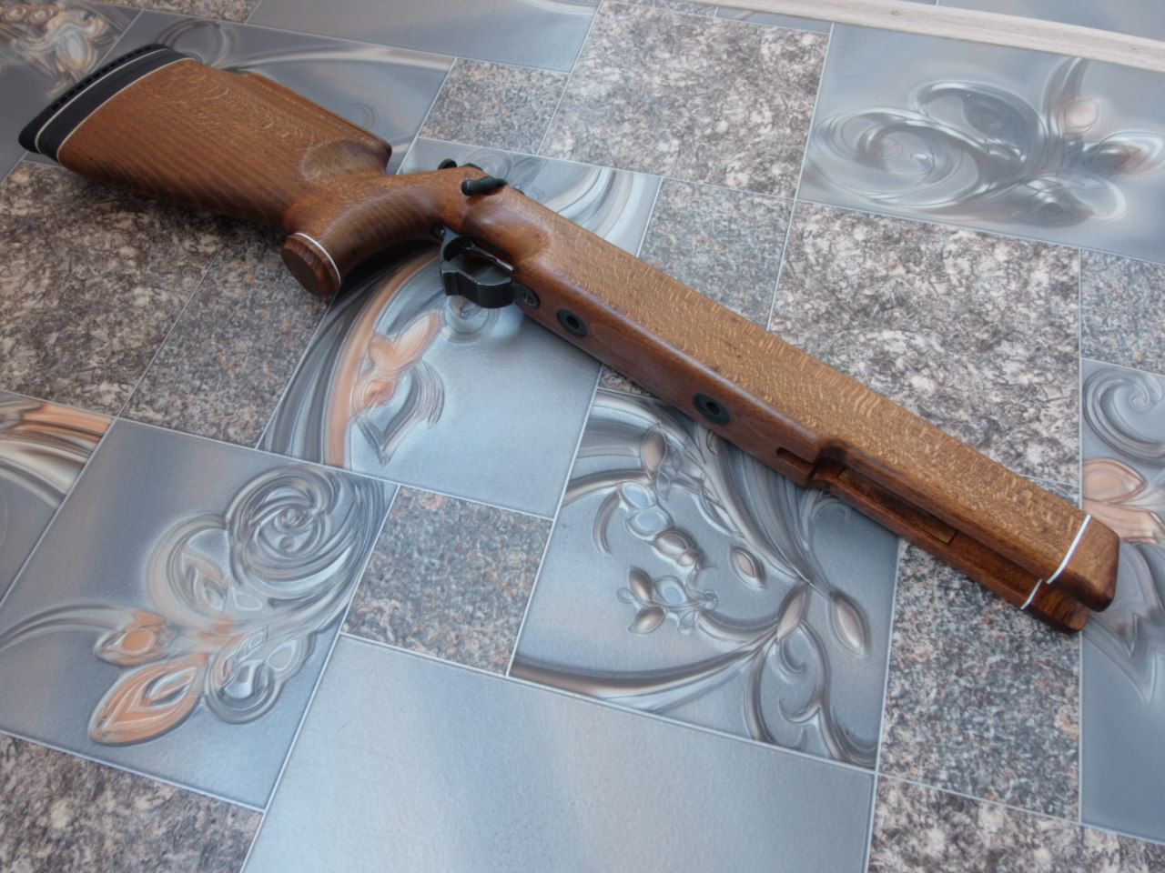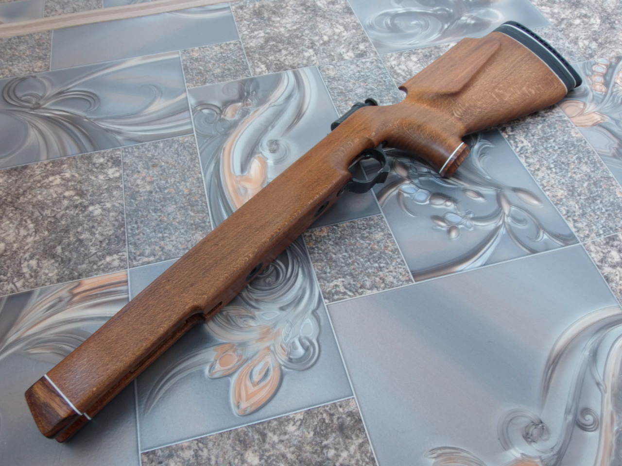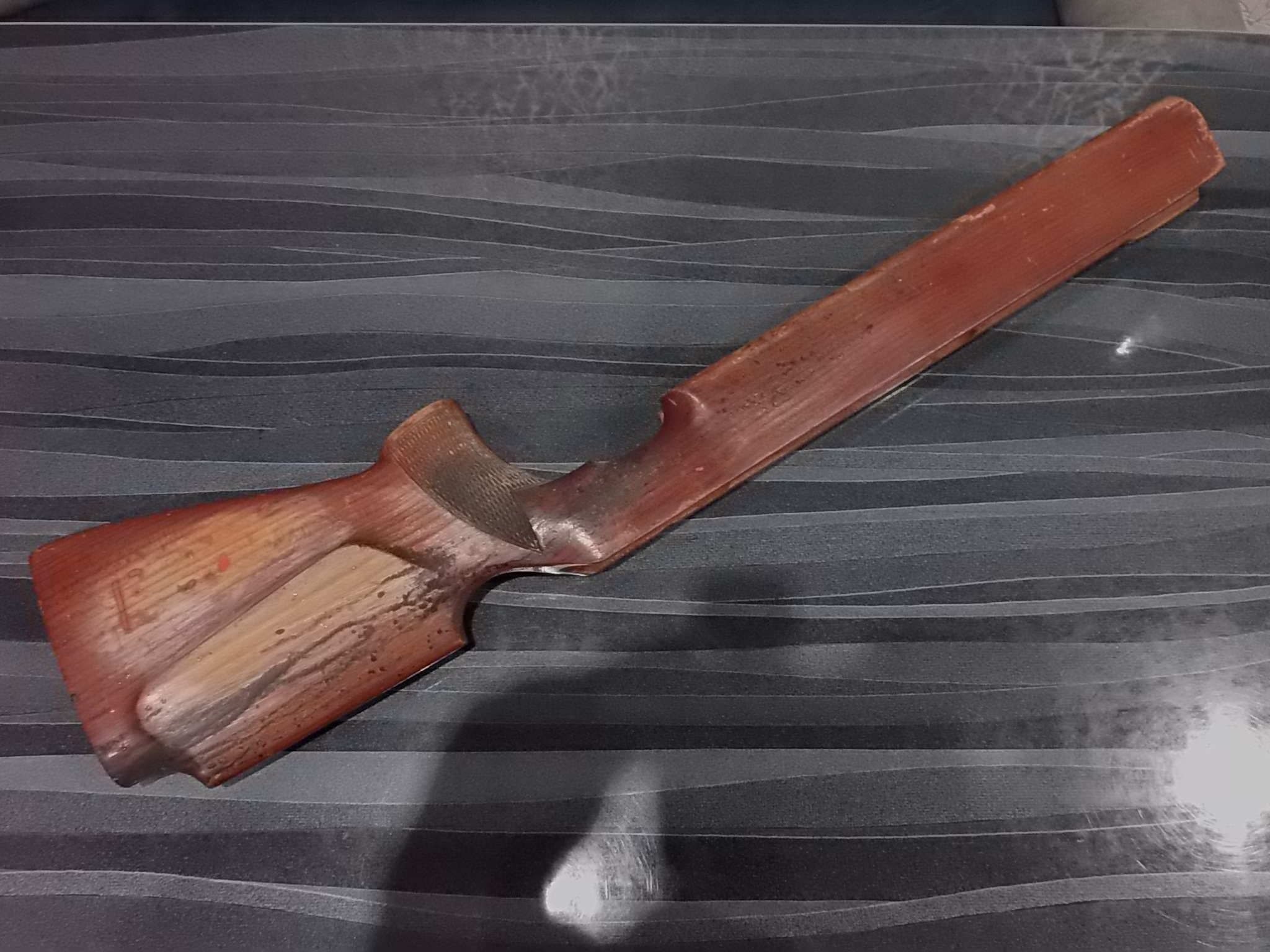 Досмотрел,что высота щеки приклада немного велика,да и острой она была.Потому буквально на сантиметр-полтора сделал её ниже,слева округлил под щеку стрелка,а справа сделав некоторую впадинку полукруглой стамеской слил с прикладом.Стало реально удобно целиться: