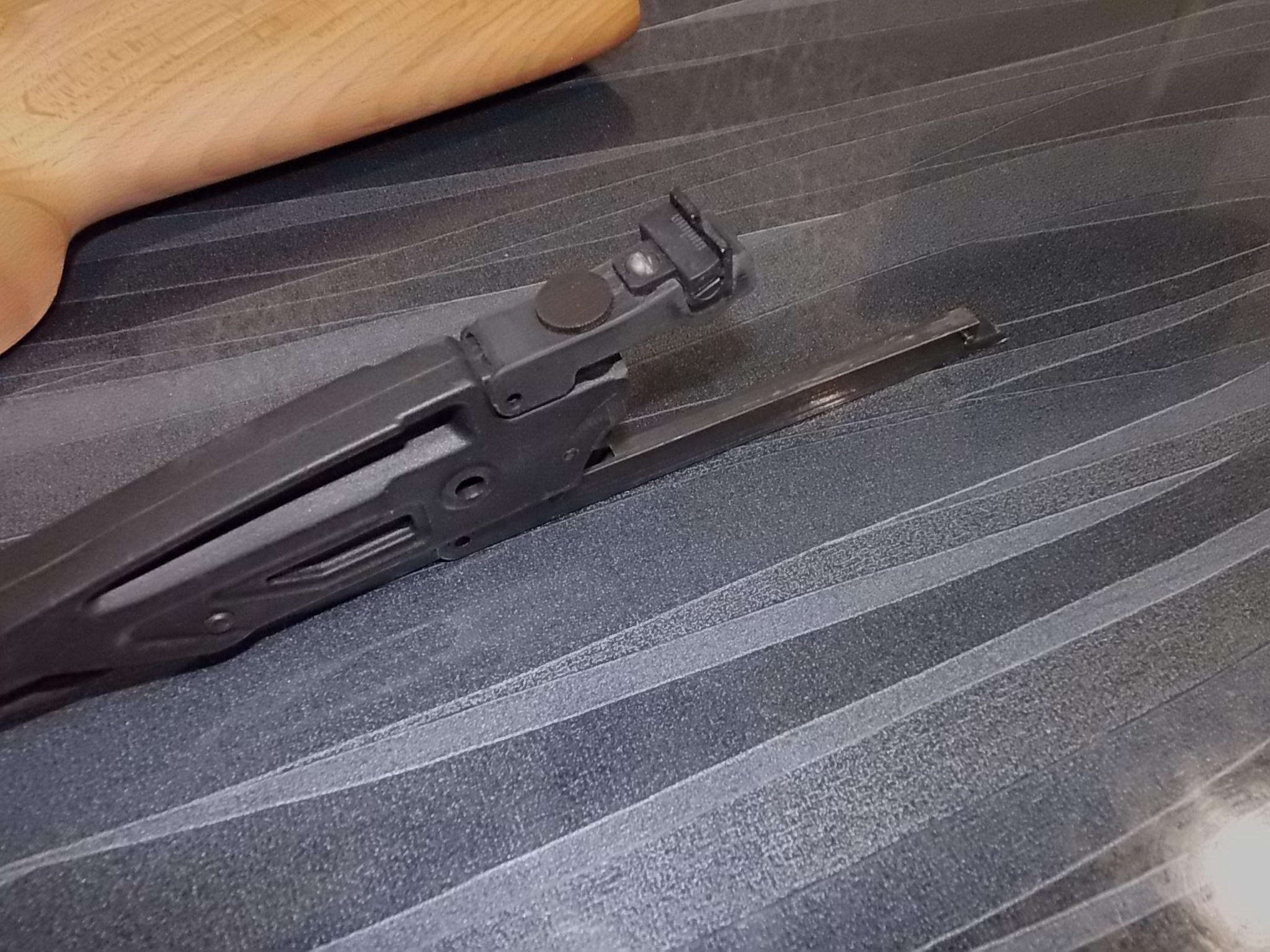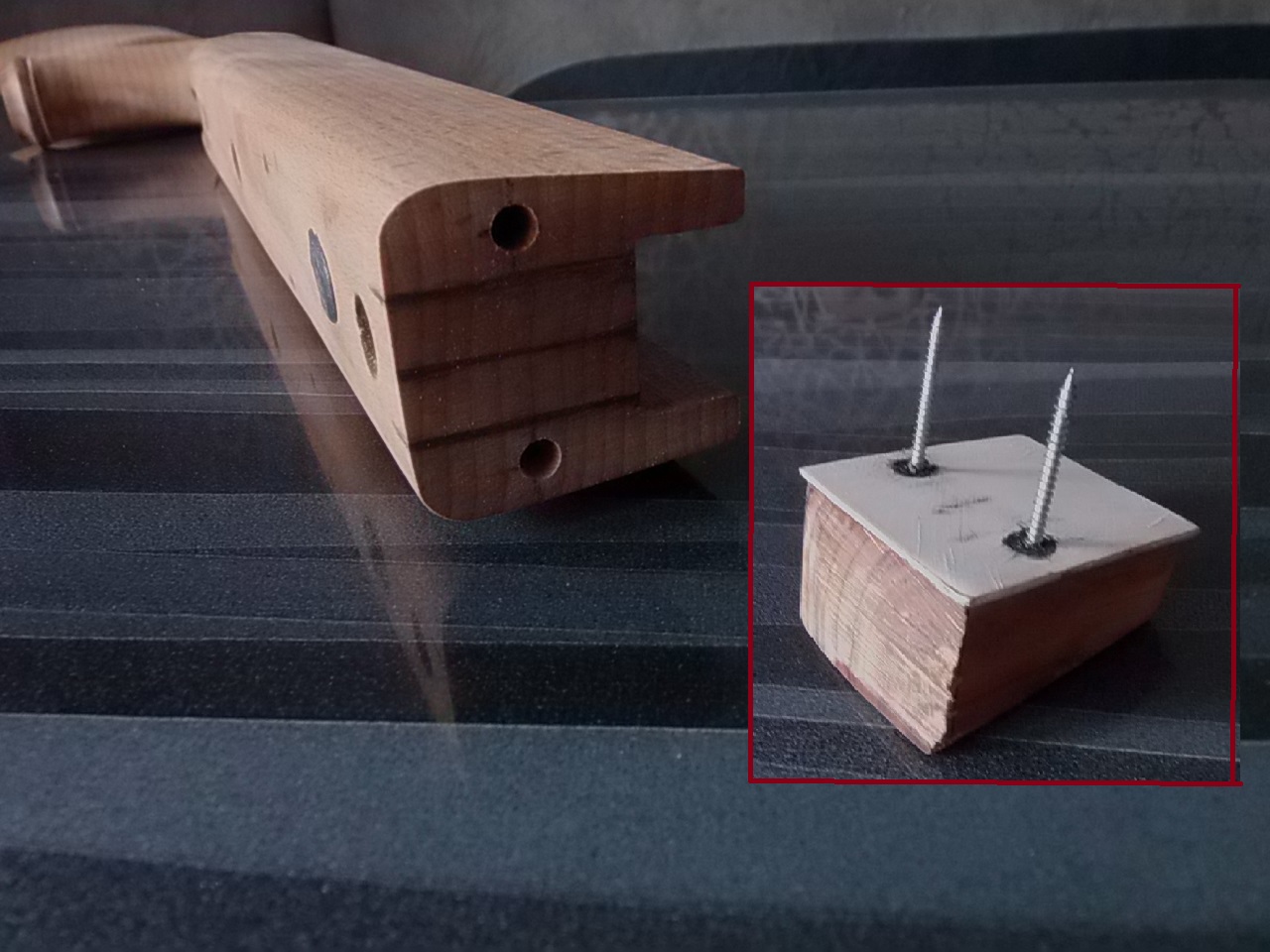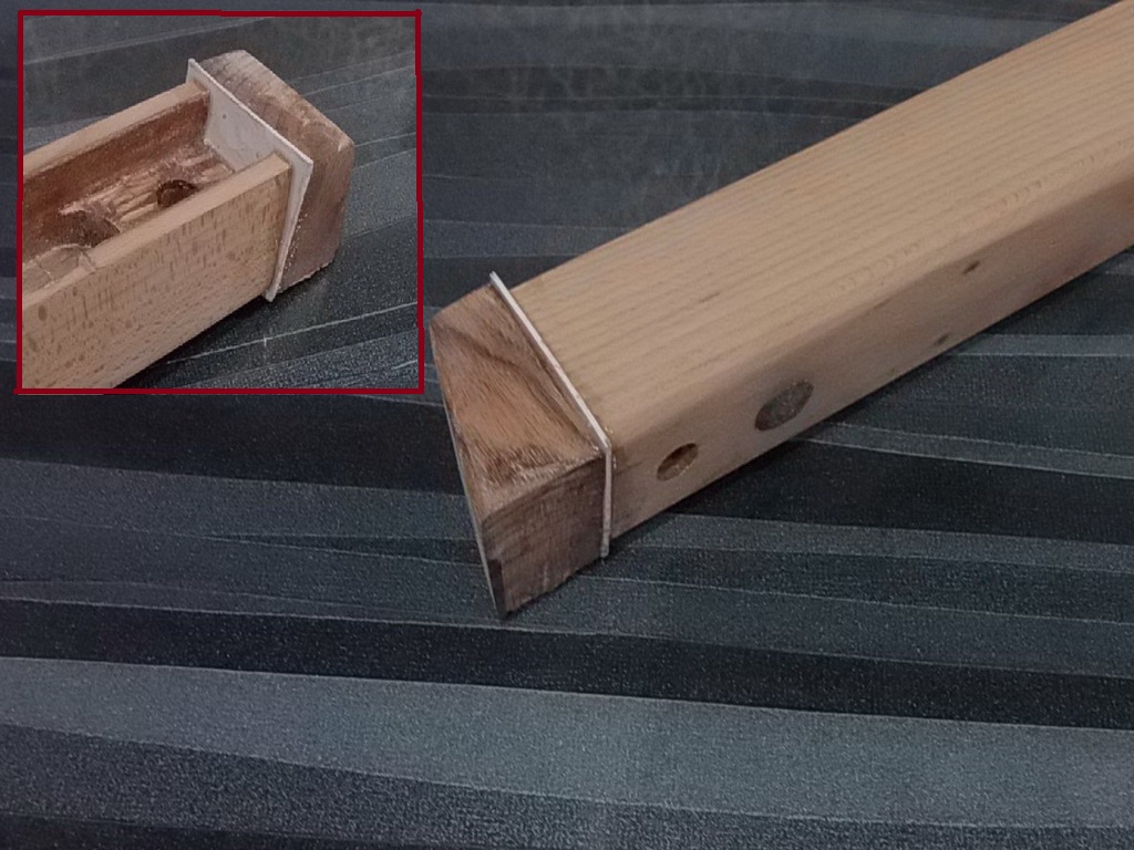Специально оставил шероховатыми поверхности чтобы клей лучше впитался в поры древесины.Прокладку обезжирил ацетоном,приготовил два крепёжных маленьких самореза.Приготовленным клеем ЭДП смазал поверхности,наложил прокладку, зафиксировал её к рукояти саморезами.Шляпки заподлицо-накладыванию чёпика не припятствуют: